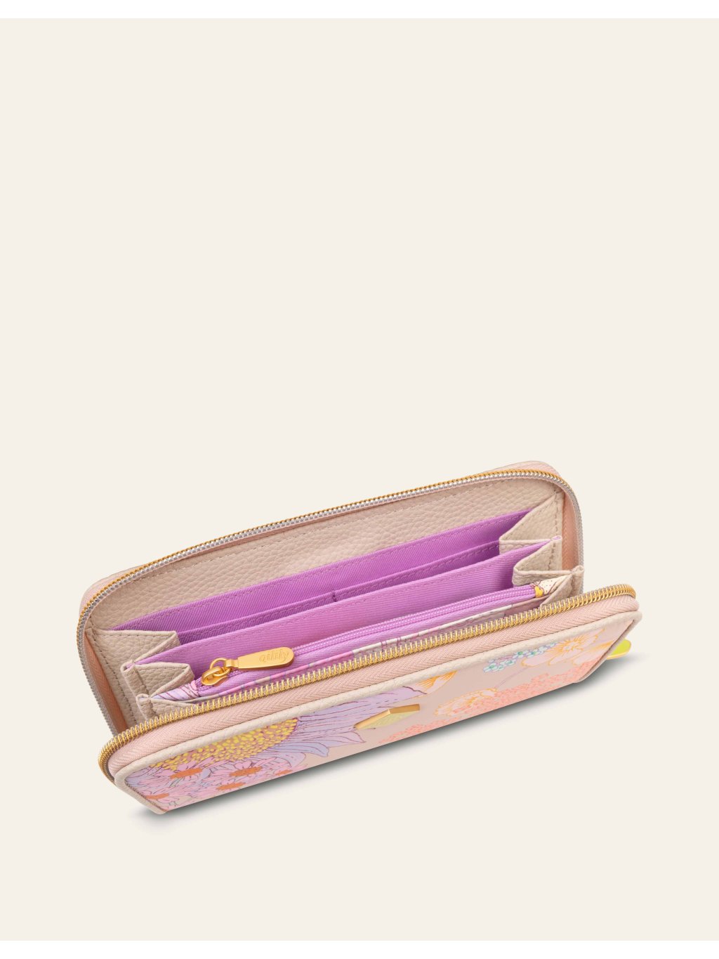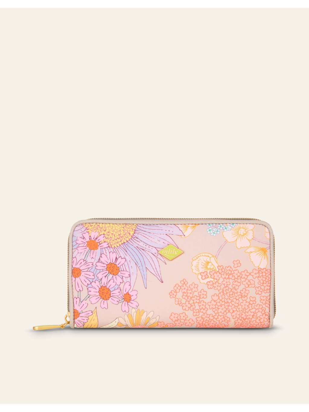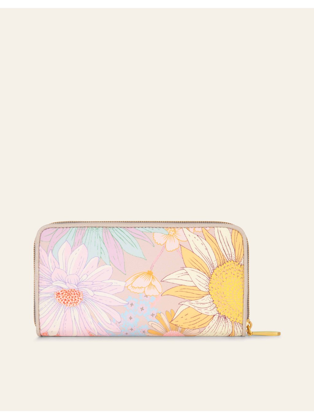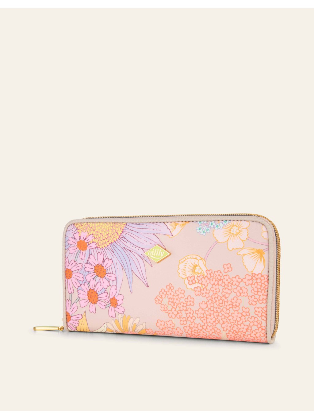 Elegantní peněženka s květinovým vzorem, která pojme platební karty, drobné mince, bankovky i vizitky. Zavírá se na zip, který lemuje 3 strany. Vnitřek je rozdělen na tři části, uvnitř je kapsa na mince se zipem a na každé straně přihrádky na platební karty (celkem 8). Opatřena ozdobným logem OILILY na přední straně.