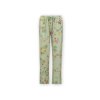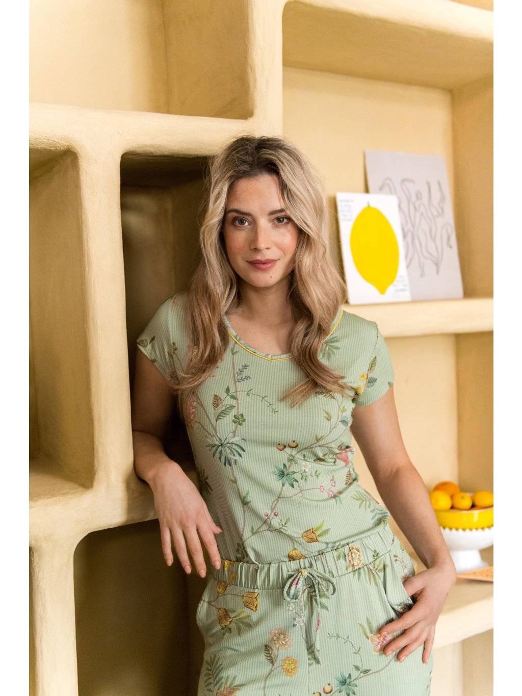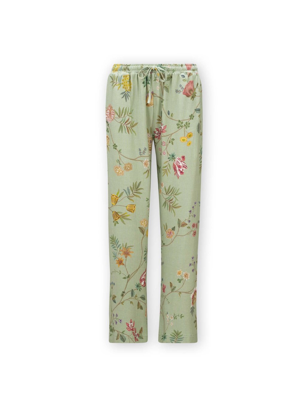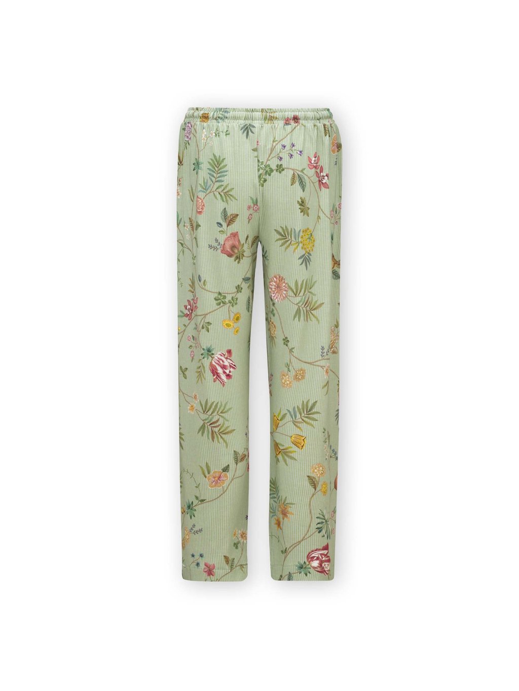 Pohodlné dlouhé kalhoty vhodné jako domácí oděv pro chvíle odpočinku. Široký pružný lem pasu, stahuje se ještě extra šňůrkou. Elegantní světlá zelená barva s tenkým proužkem je bohatě dekorovaná květinami, nohavice jsou širší a pohodlné. Látka je velmi jemná, splývavá.