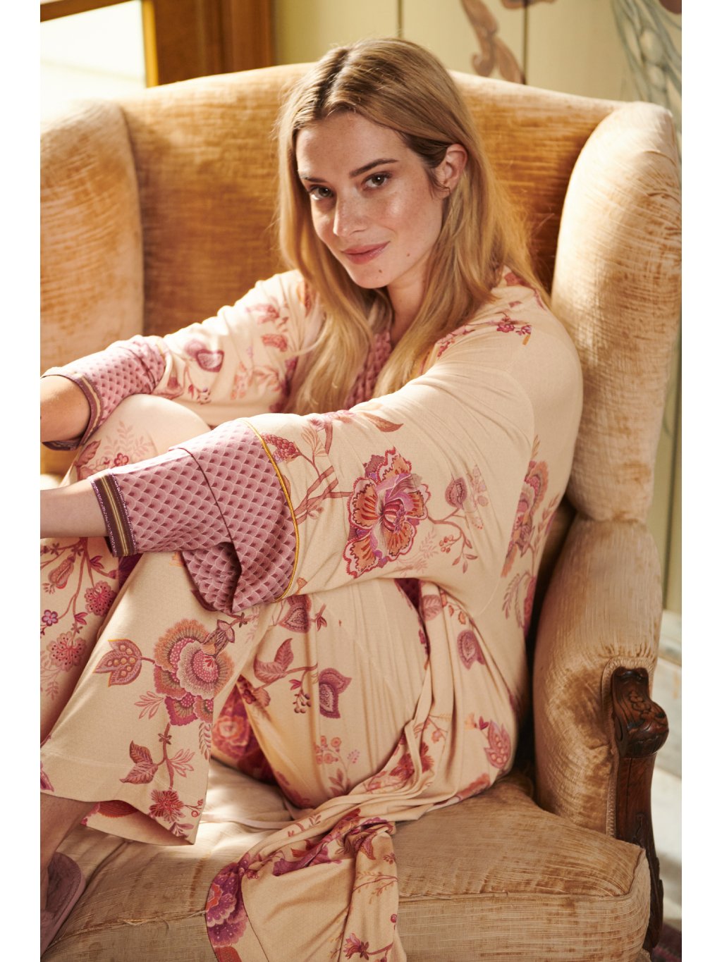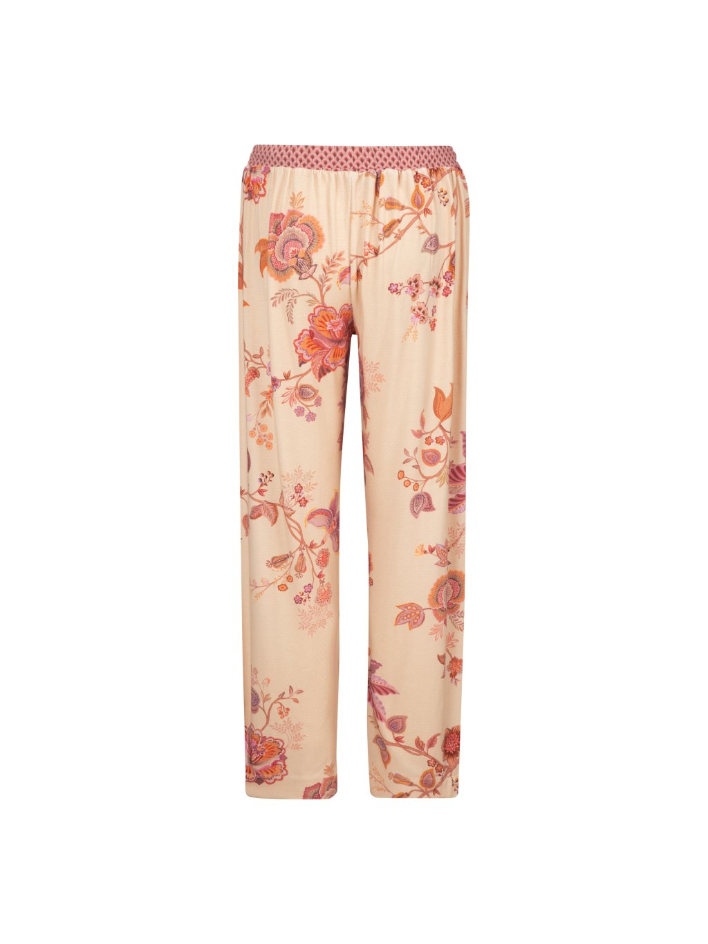 Pohodlné dlouhé kalhoty vhodné jako domácí oděv pro chvíle odpočinku. Široký pružný lem pasu, stahuje se ještě extra šňůrkou. Elegantní tlumená bílá barva je bohatě dekorovaná květinami v odstínech růžové, nohavice jsou širší. . Látka je velmi jemná, splývavá.