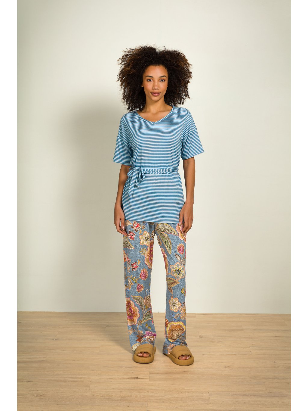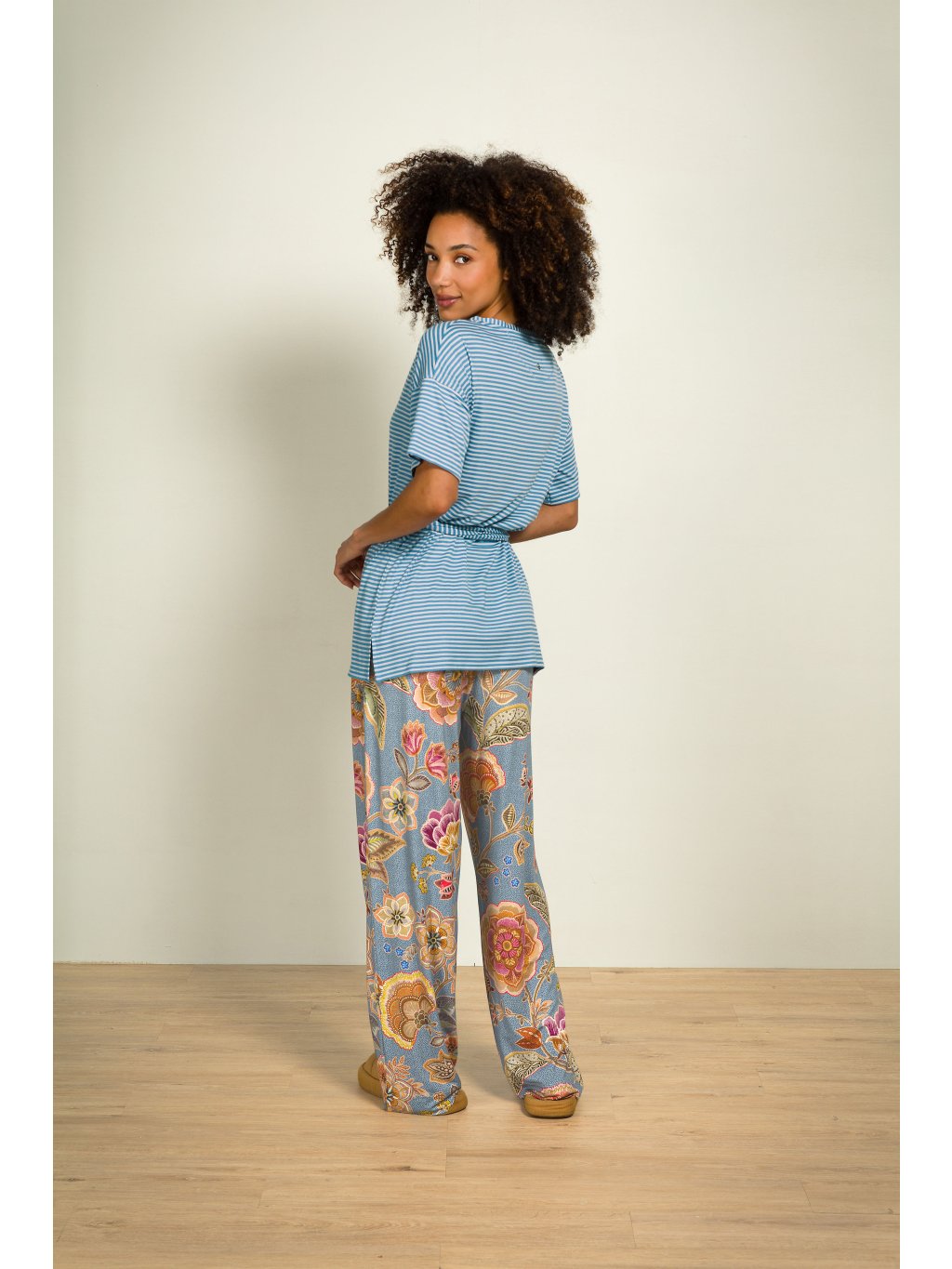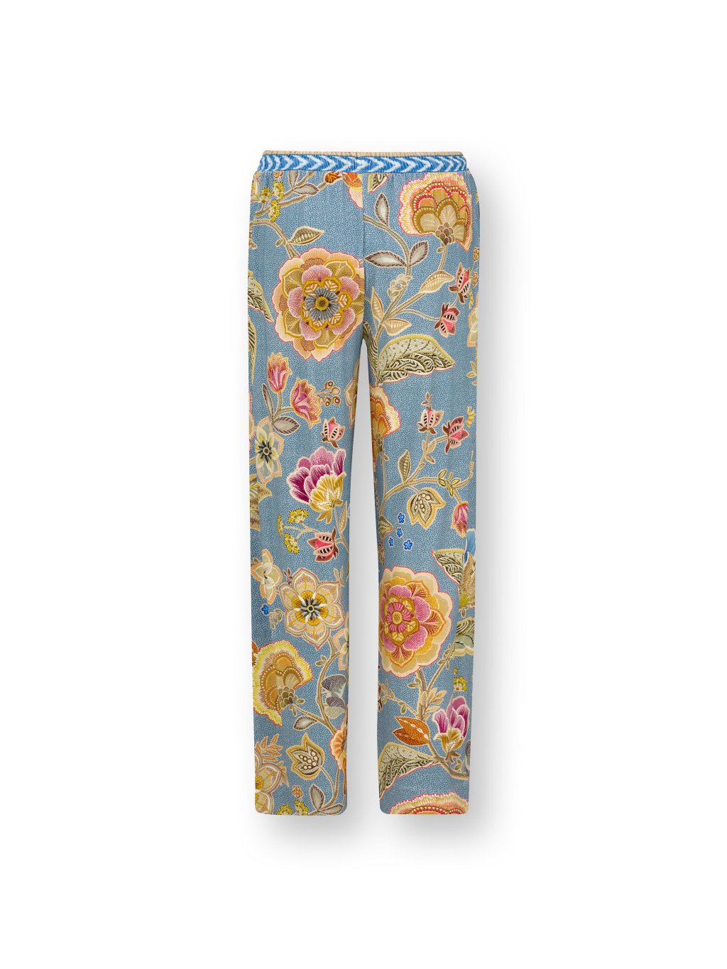 Pohodlné dlouhé kalhoty vhodné jako domácí oděv pro chvíle odpočinku. Široký pružný lem pasu, stahuje se ještě extra šňůrkou. Elegantní středně modrá barva je zdobená motivy květin, nohavice jsou široké pro příjemné nošení.