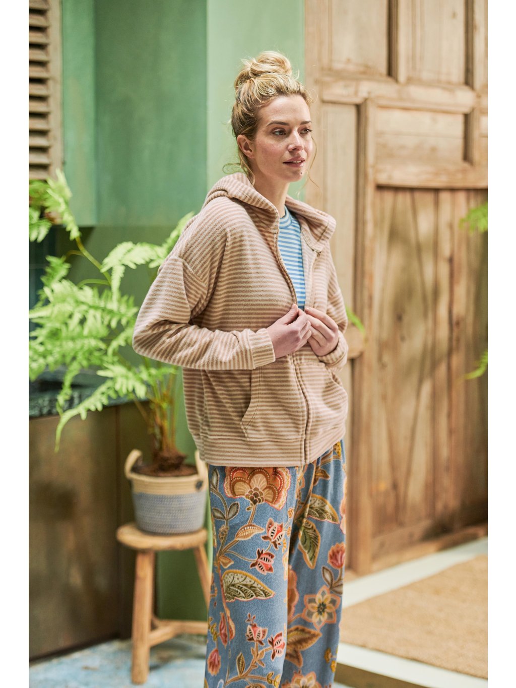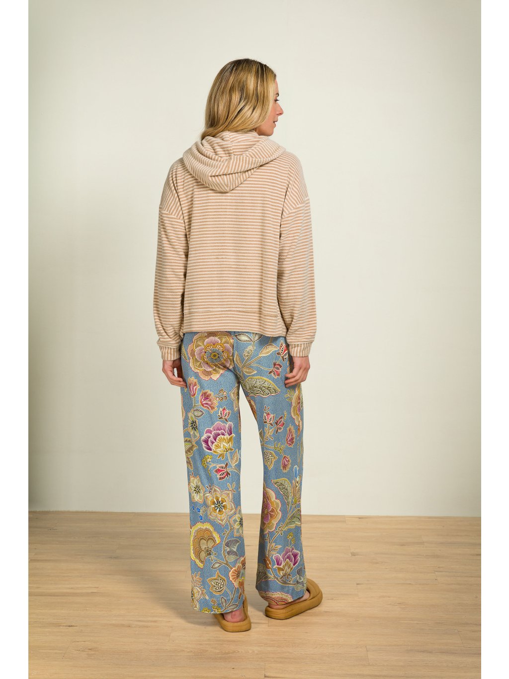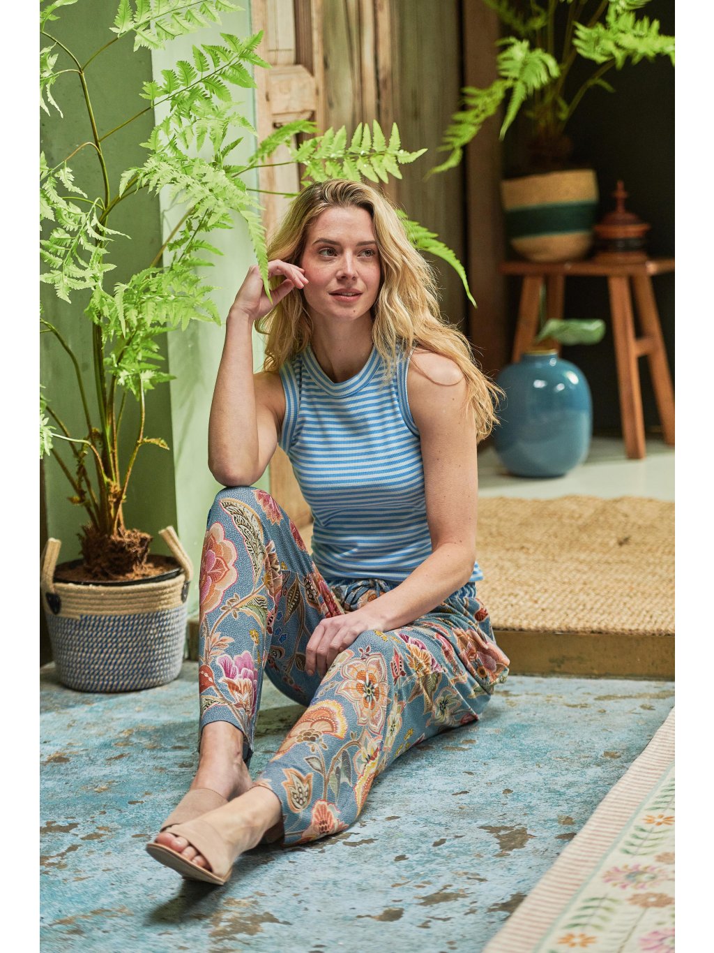 Pohodlné dlouhé kalhoty vhodné jako domácí oděv pro chvíle odpočinku. Široký pružný lem pasu, stahuje se ještě extra šňůrkou. Elegantní středně modrá barva je zdobená motivy květin, nohavice jsou široké pro příjemné nošení.