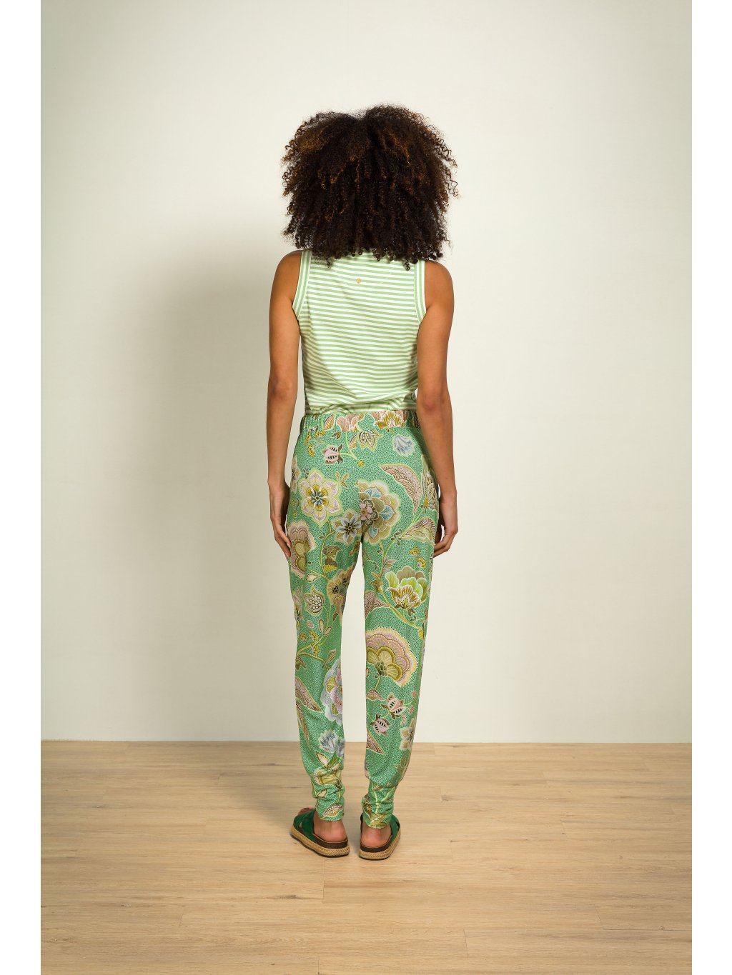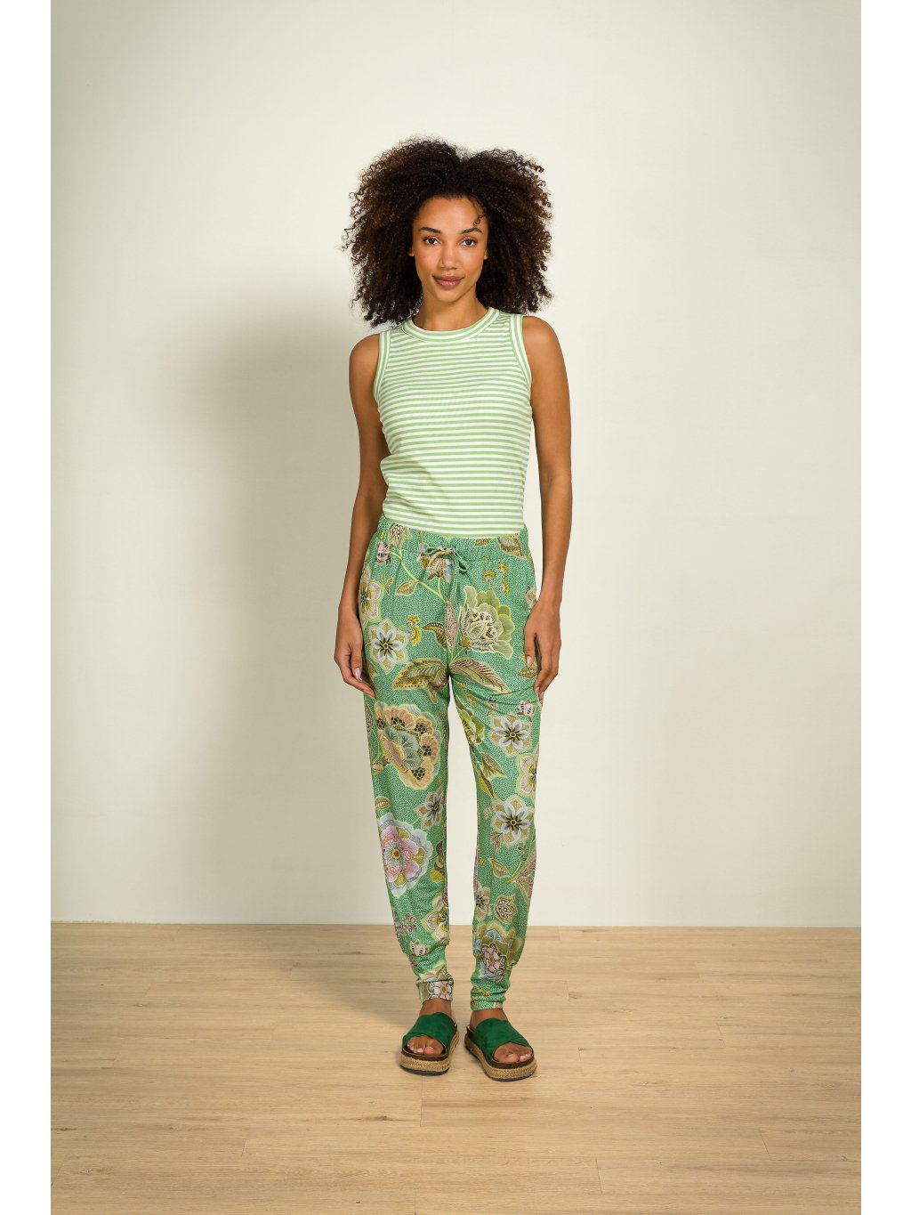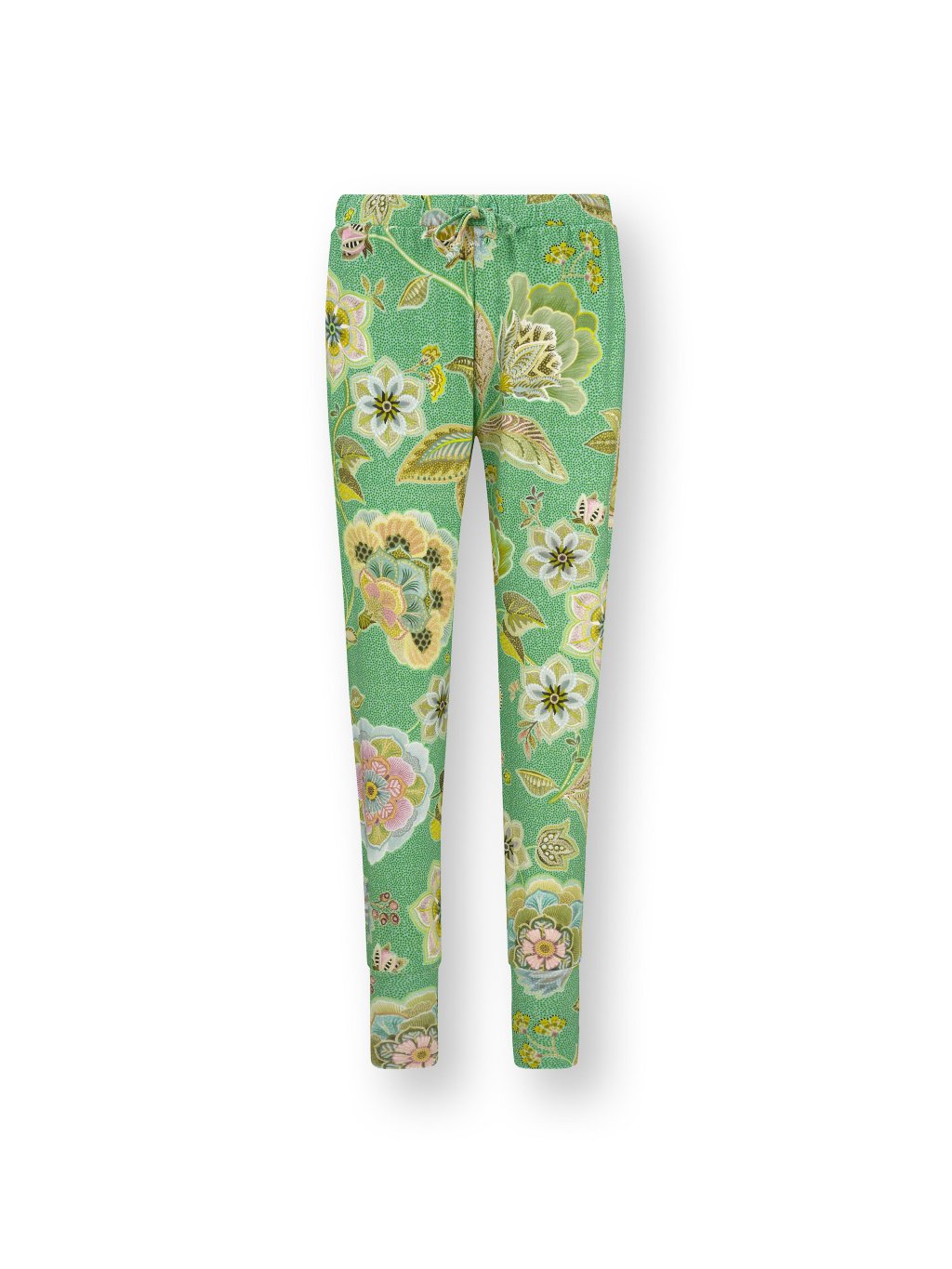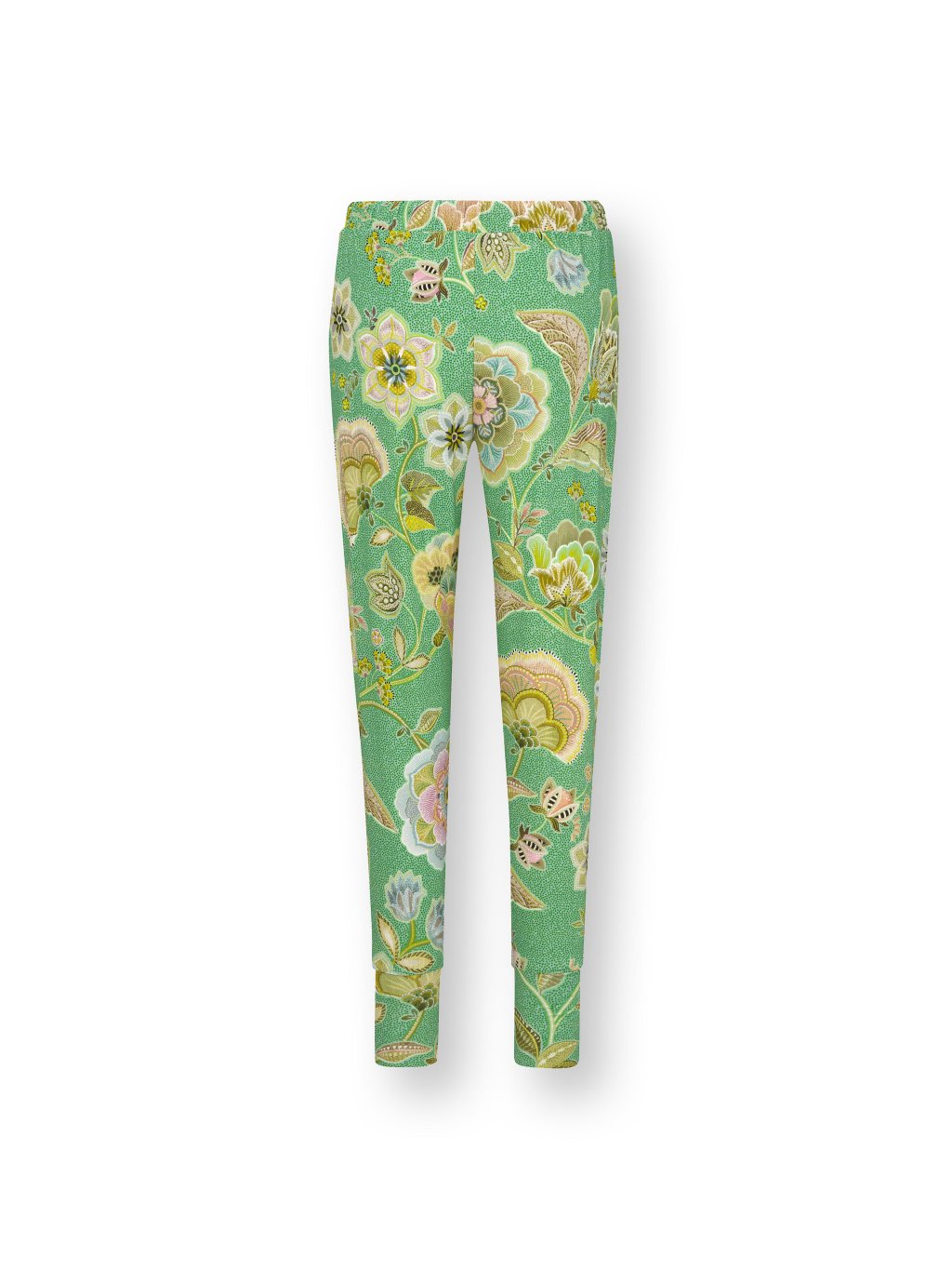 Pohodlné dlouhé kalhoty vhodné jako domácí oděv pro chvíle odpočinku. Široký pružný lem pasu, stahuje se ještě extra šňůrkou. Elegantní zelená barva je zdobená motivy květin, nohavice jsou dole zúžené do nápletu, který netlačí.