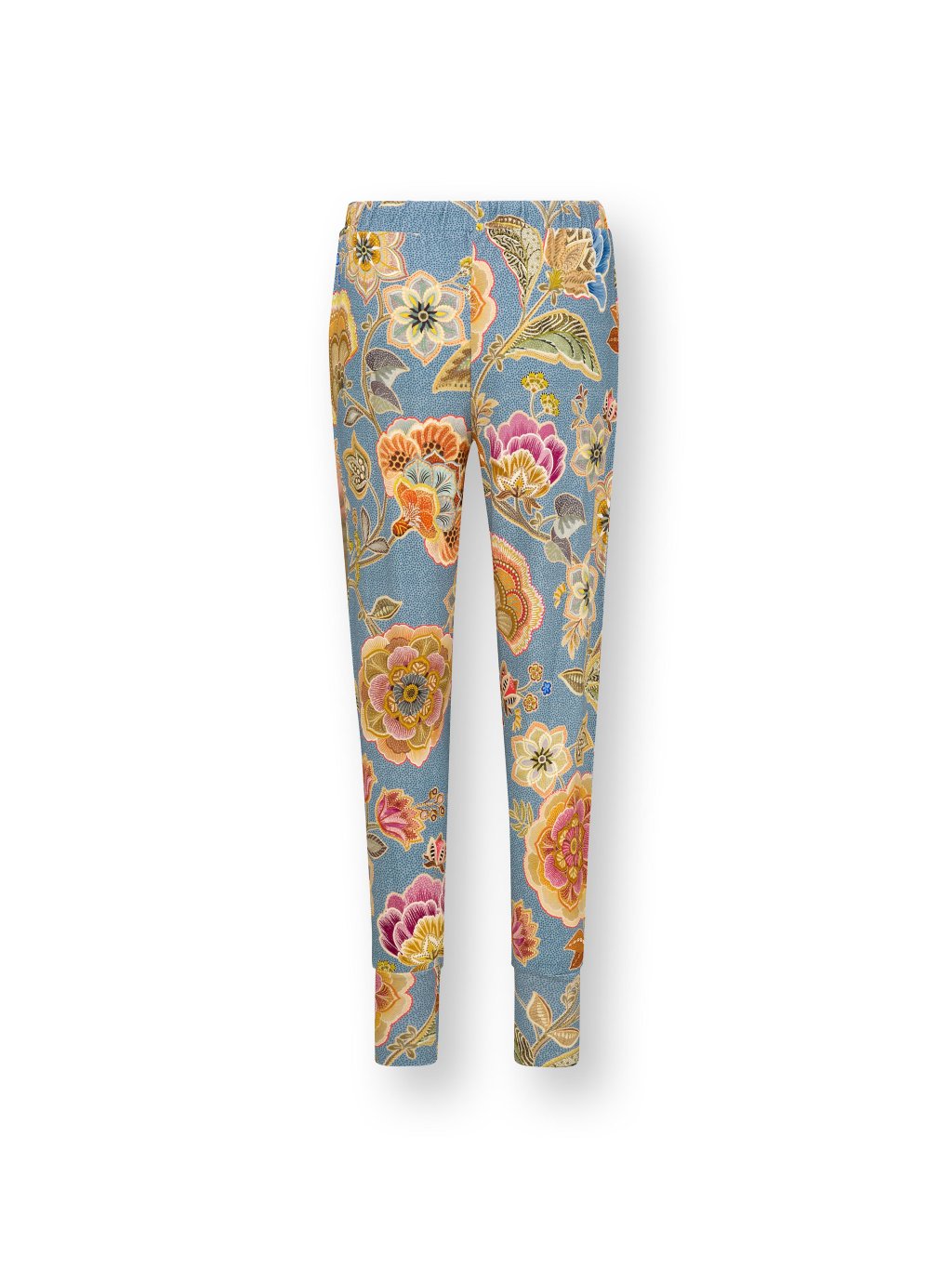 Pohodlné dlouhé kalhoty vhodné jako domácí oděv pro chvíle odpočinku. Široký pružný lem pasu, stahuje se ještě extra šňůrkou. Elegantní středně modrá barva je zdobená motivy květin, nohavice jsou dole zúžené do nápletu, který netlačí.