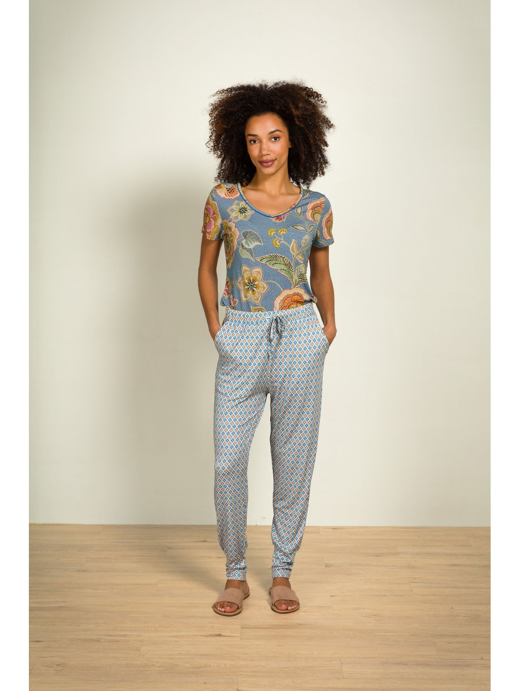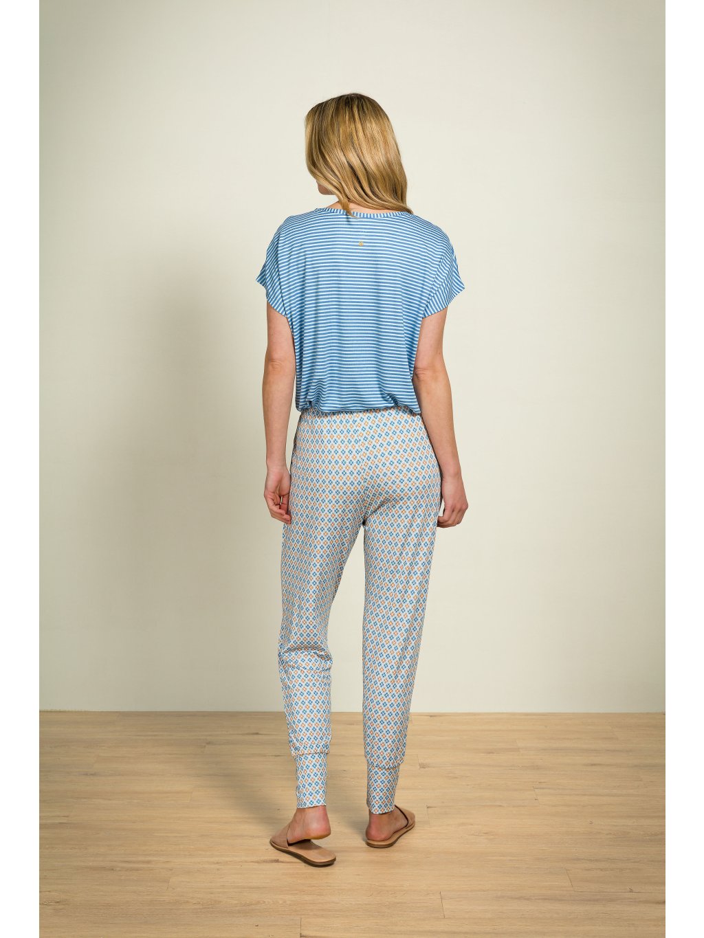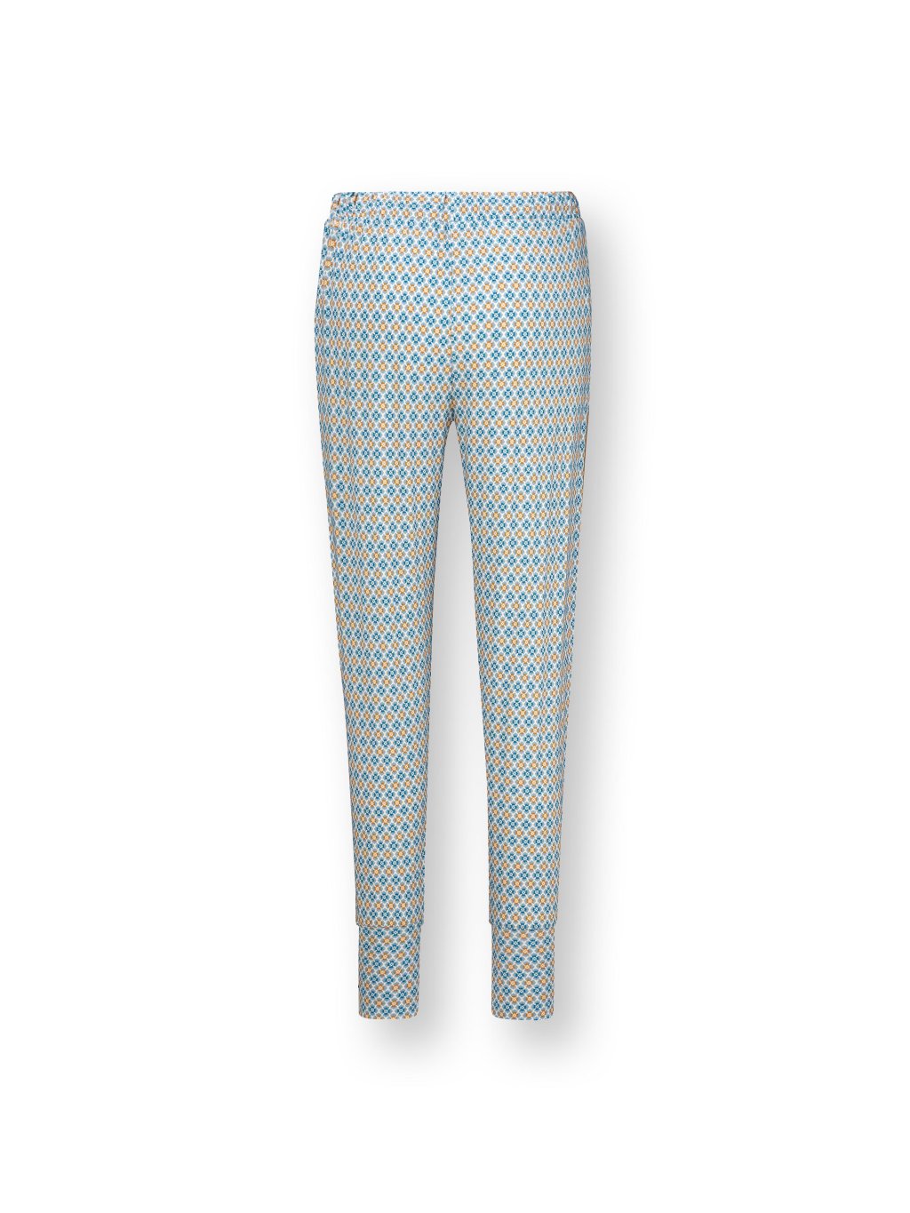 Pohodlné dlouhé kalhoty vhodné jako domácí oděv pro chvíle odpočinku nebo jako spodní díl pyžama. Široký pružný lem pasu lze stahovat ještě extra šňůrkou. Design Mojo je jemný a živý geometrický vzor tvořený drobnými kvítky ve dvou barvách. Dodává vhodný kontrast k dominantním florálním vzorům.