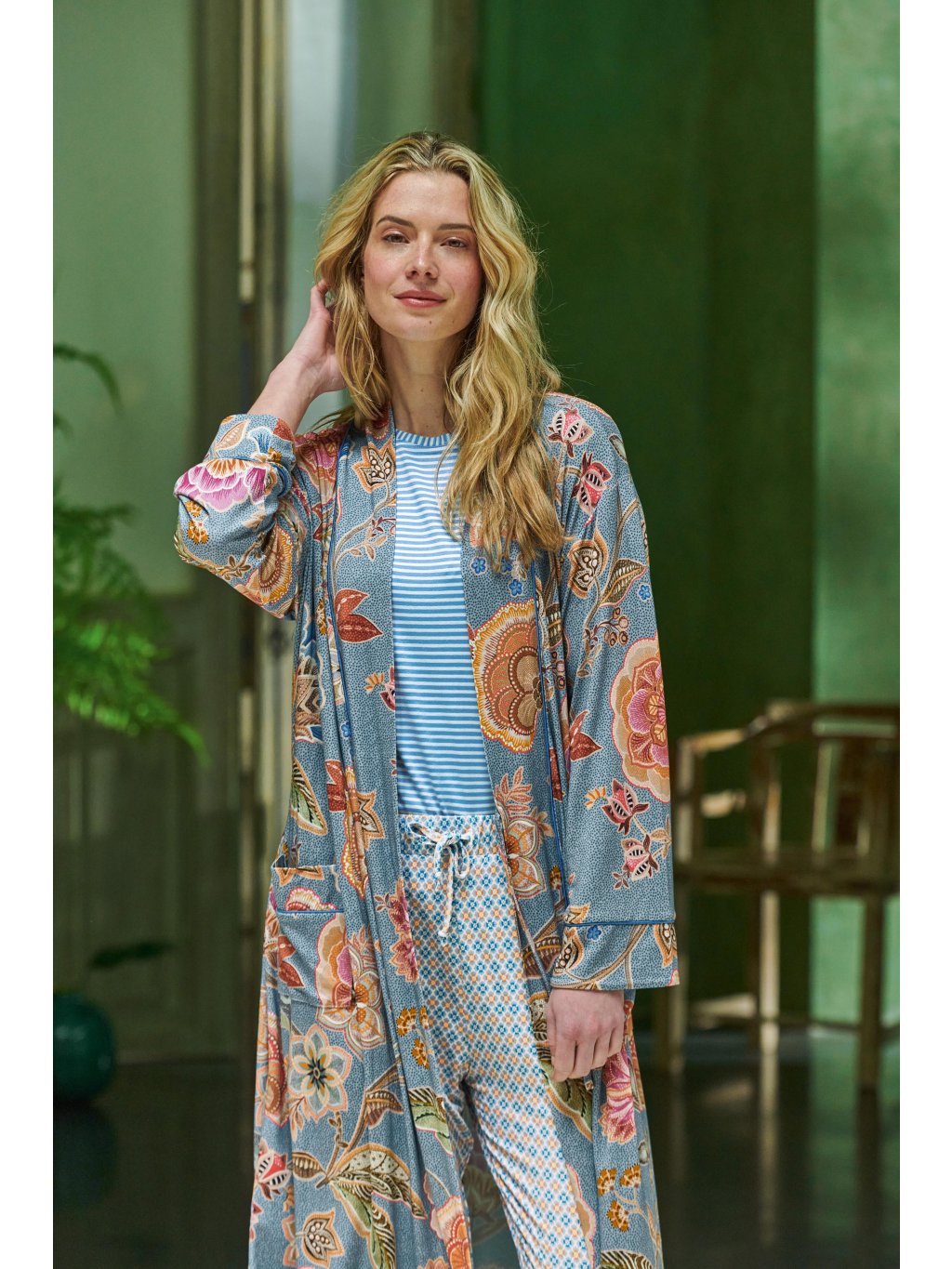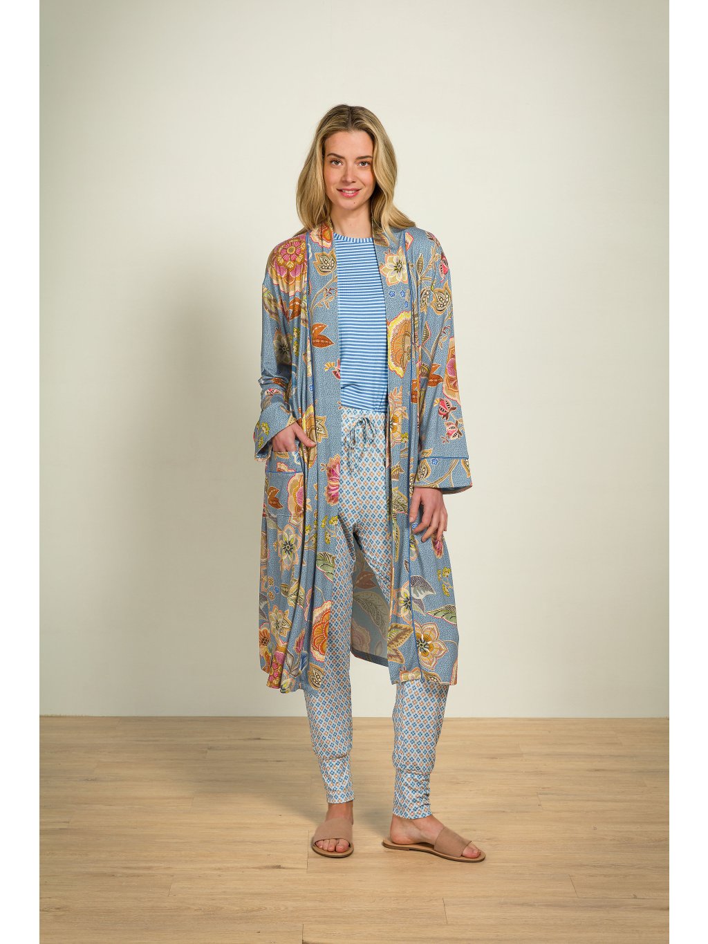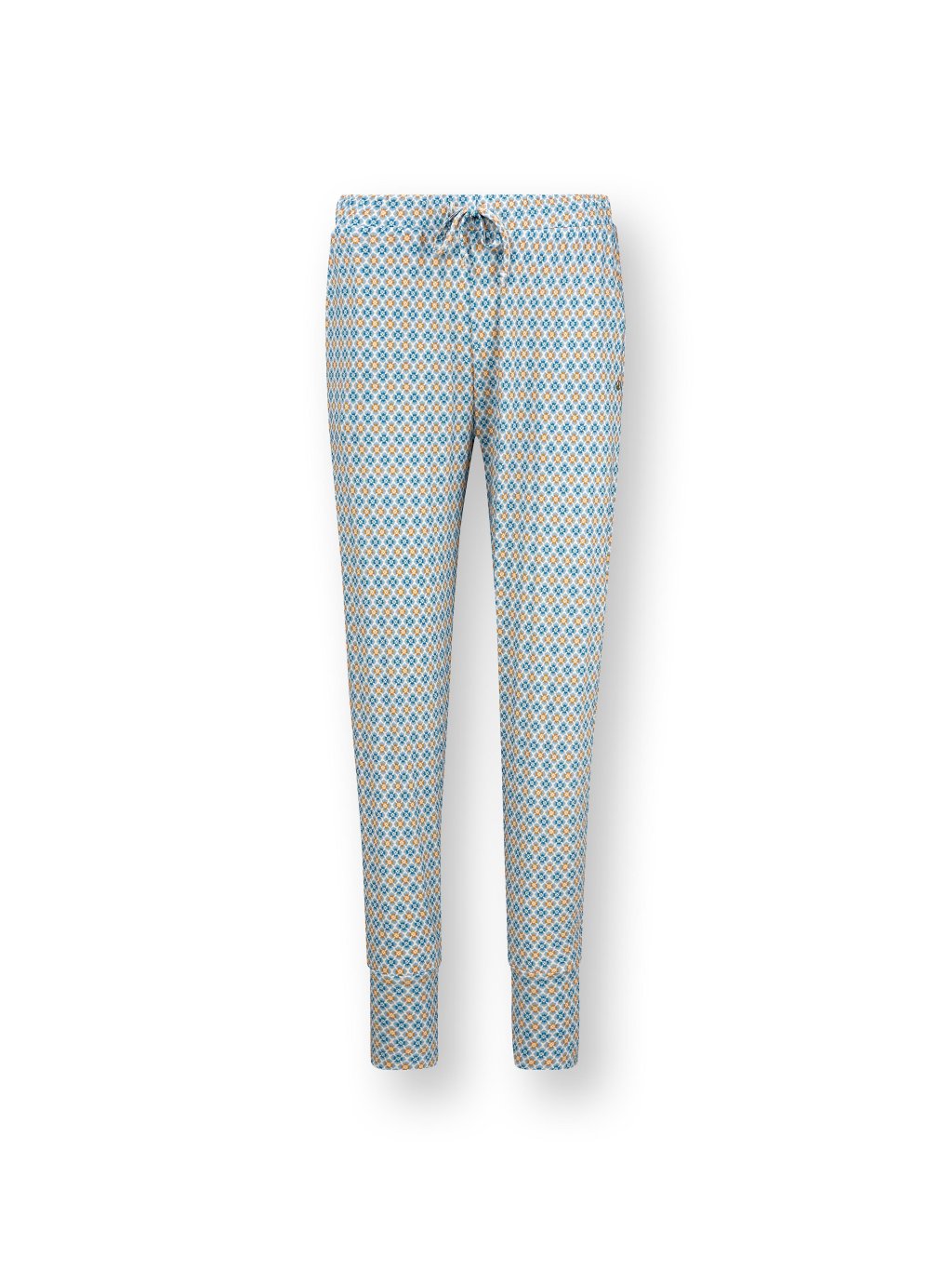 Pohodlné dlouhé kalhoty vhodné jako domácí oděv pro chvíle odpočinku nebo jako spodní díl pyžama. Široký pružný lem pasu lze stahovat ještě extra šňůrkou. Design Mojo je jemný a živý geometrický vzor tvořený drobnými kvítky ve dvou barvách. Dodává vhodný kontrast k dominantním florálním vzorům.