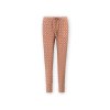 Pohodlné dlouhé kalhoty z kolekce Verano v lila jsou vhodné jako domácí oděv pro chvíle odpočinku. Široký pružný lem pasu doplněný barevně ladící šňůrkou na stažení v pase. Tlumená základní barva v pudrovém odstínu je zdobená pravidelnými symboly (motiv květiny), takže celek působí geometrickým dojmem. Látka je velmi jemná, splývavá, díky vysokému podílu elastanu se skvěle přizpůsobí všem vašim aktivitám.