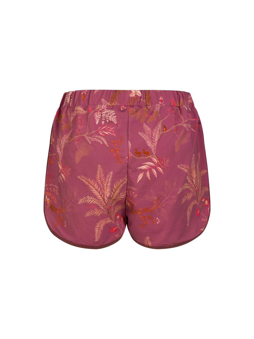 Krátké kalhoty se stahovací šňůrkou v širokém pružném lemu, lampasy v bočních švech a lehce vykrojené olemované nohavice. Základní barva je bohatě zdobená florálním motivem v jemném kontrastu.