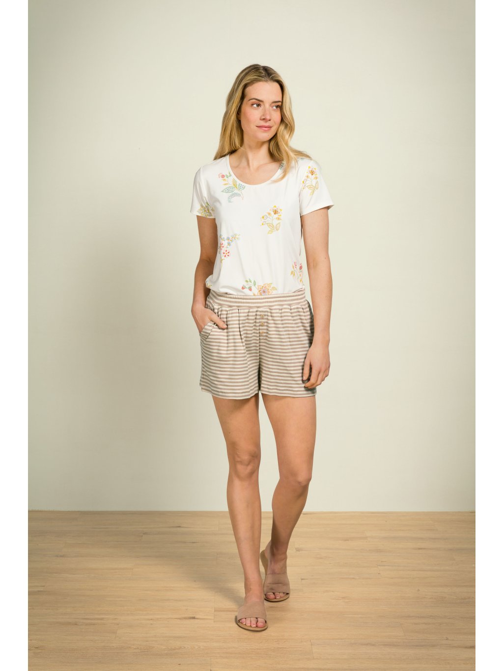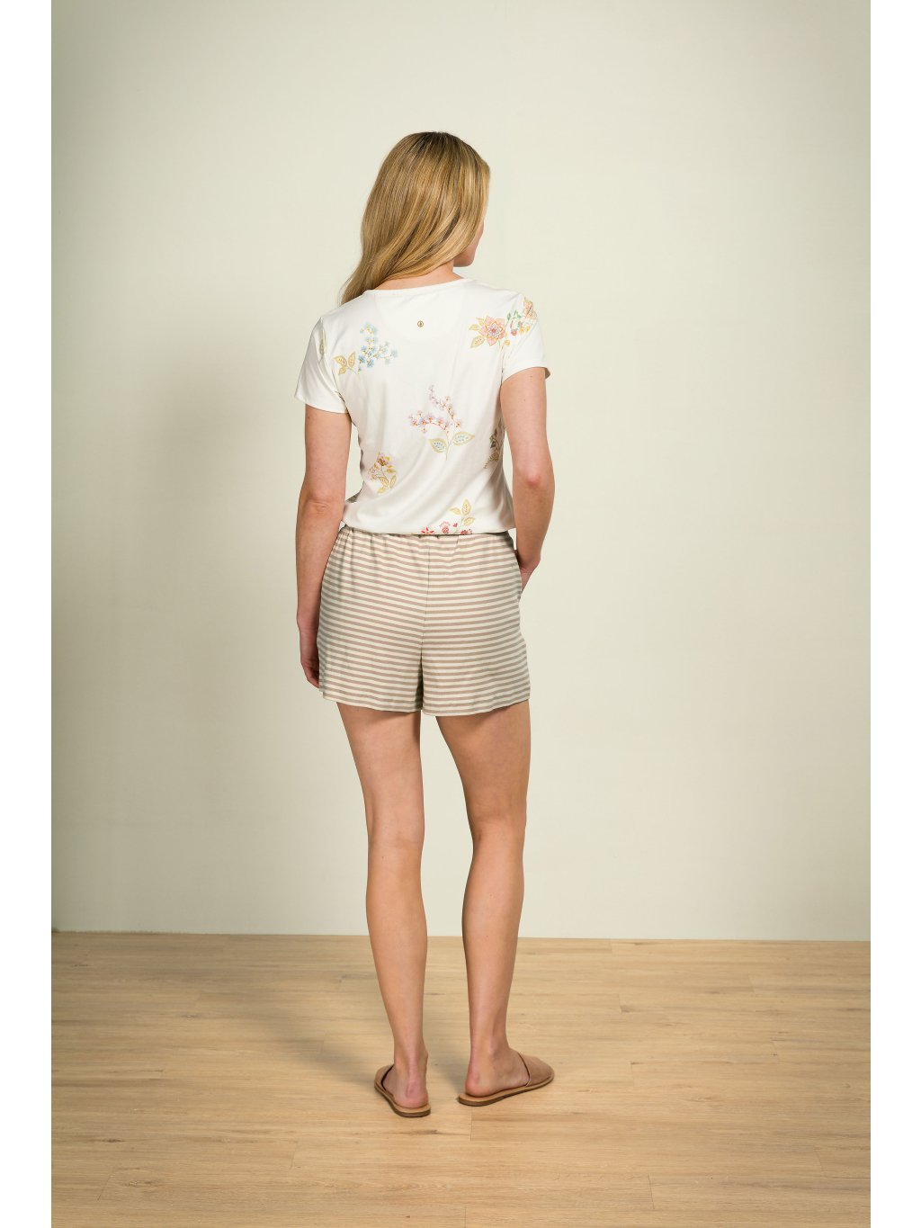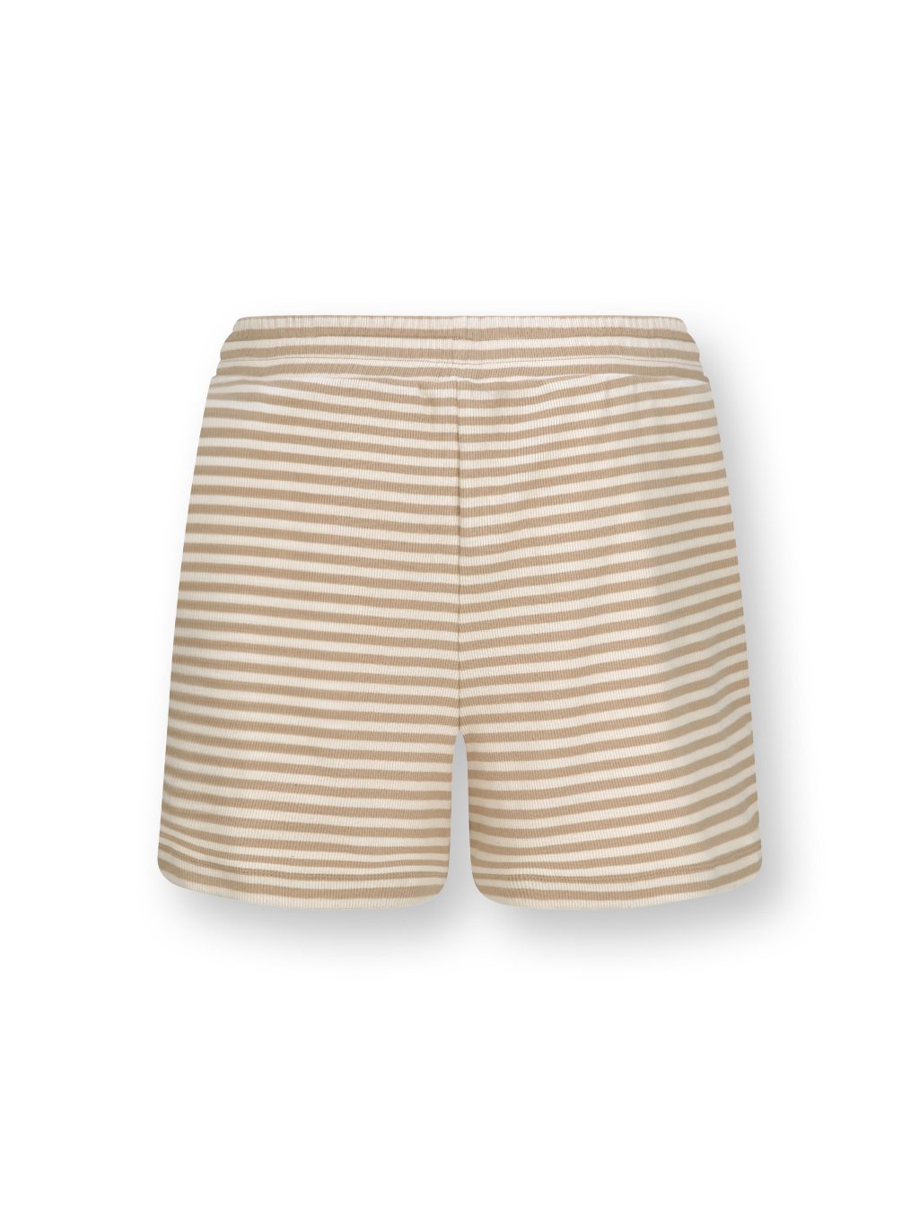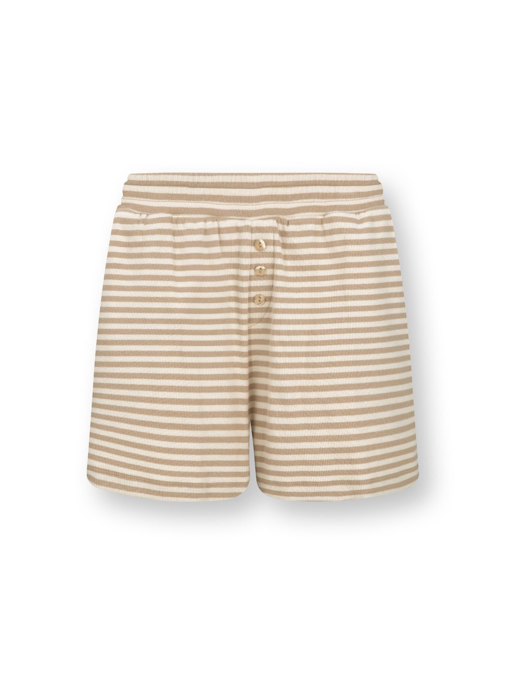 Pohodlné kraťasy vhodné jako součást pyžámka či domácí oděv pro chvíle odpočinku. Široký měkký pružný lem pasu a širší střih nohavic pro maximální pohodlí. Hravý jemný vodorovný proužek, vepředu zdobené třemi knoflíčky.