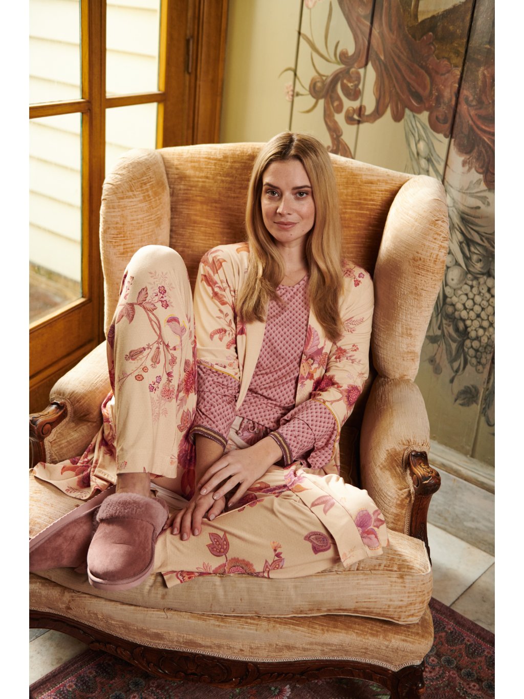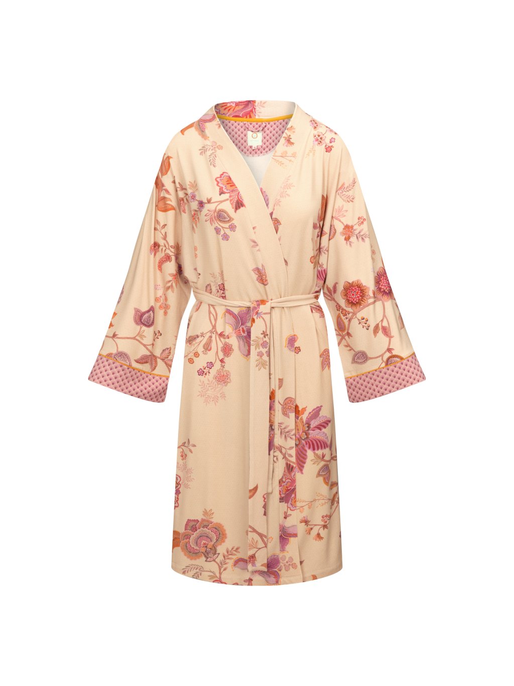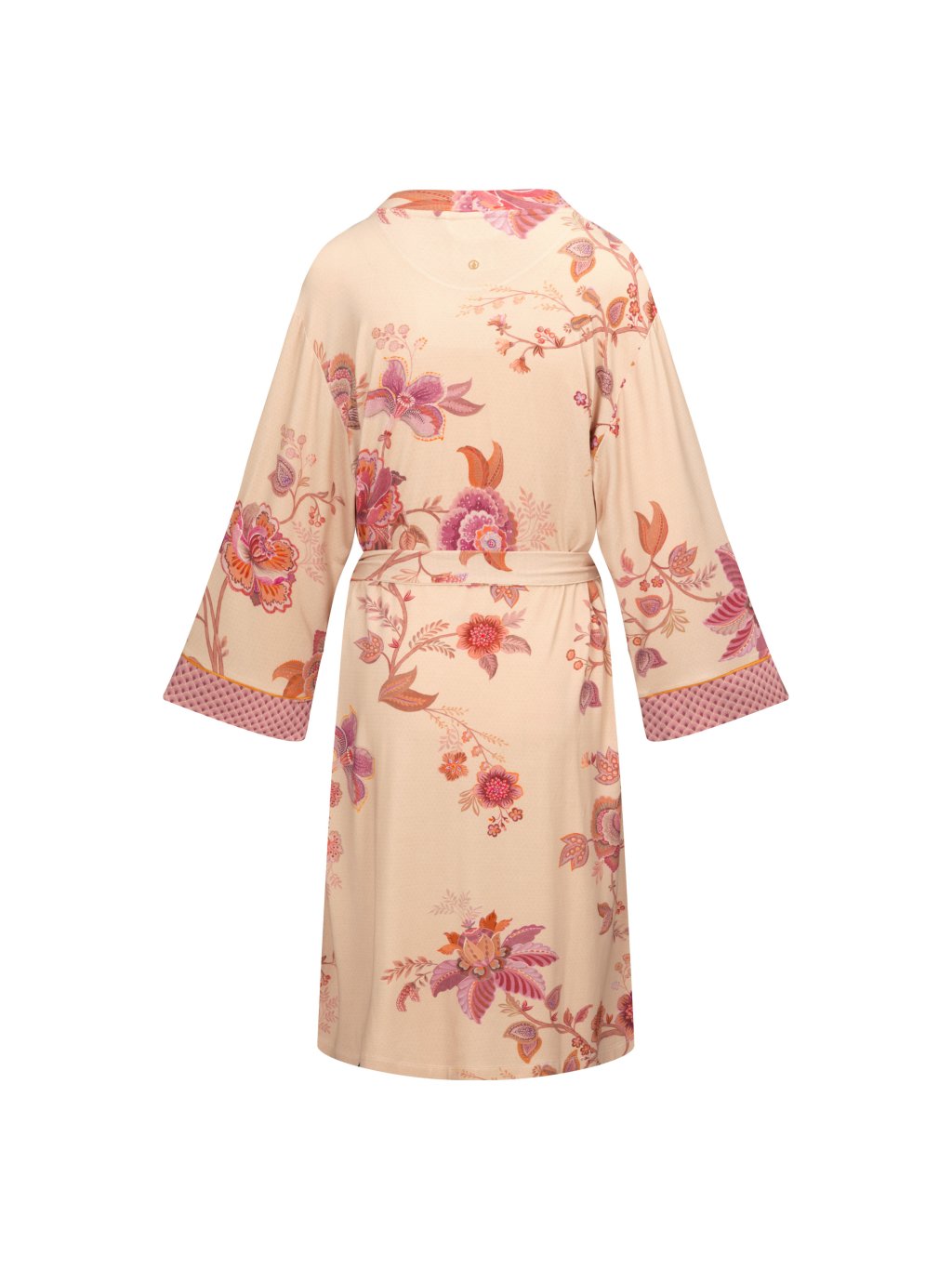 Lehké kimono s širokým měkkým páskem. Dominantní tlumená bílá barva, z níž vystupují květy v růžových a hodících se barvách. Látka je velmi jemná, splývavá, skvěle se přizpůsobí vašim křivkám.