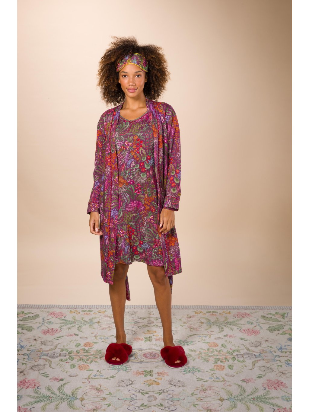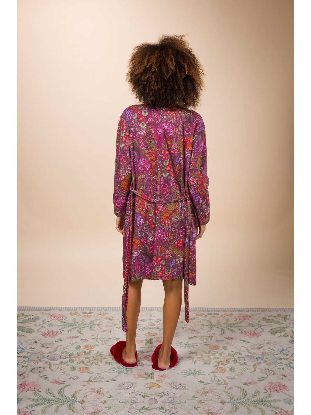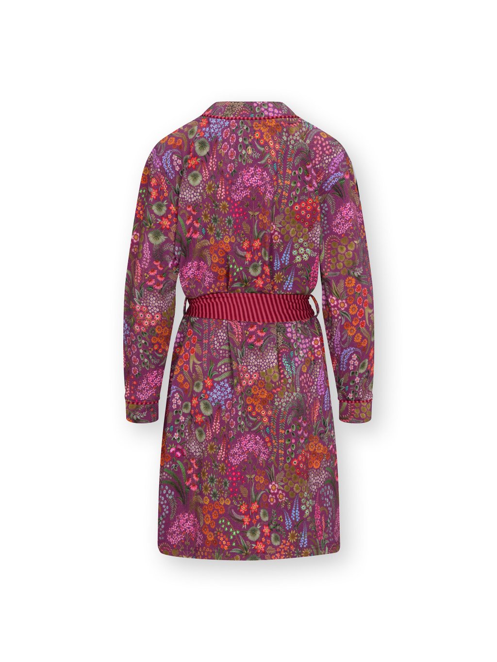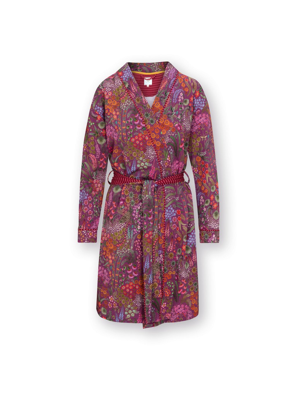 Kimono se sportovním šmrncem, s širokým měkkým páskem. Dominantní tmavá růžová barva, z níž vystupují květinové motivy. Látka je z 95% tvořena čistou bavlnou, takže je velmi příjemná na nošení a když nahradíte pásek jiným, můžete klidně nosit i jako kardigan - přes tričko, košili či rolák.