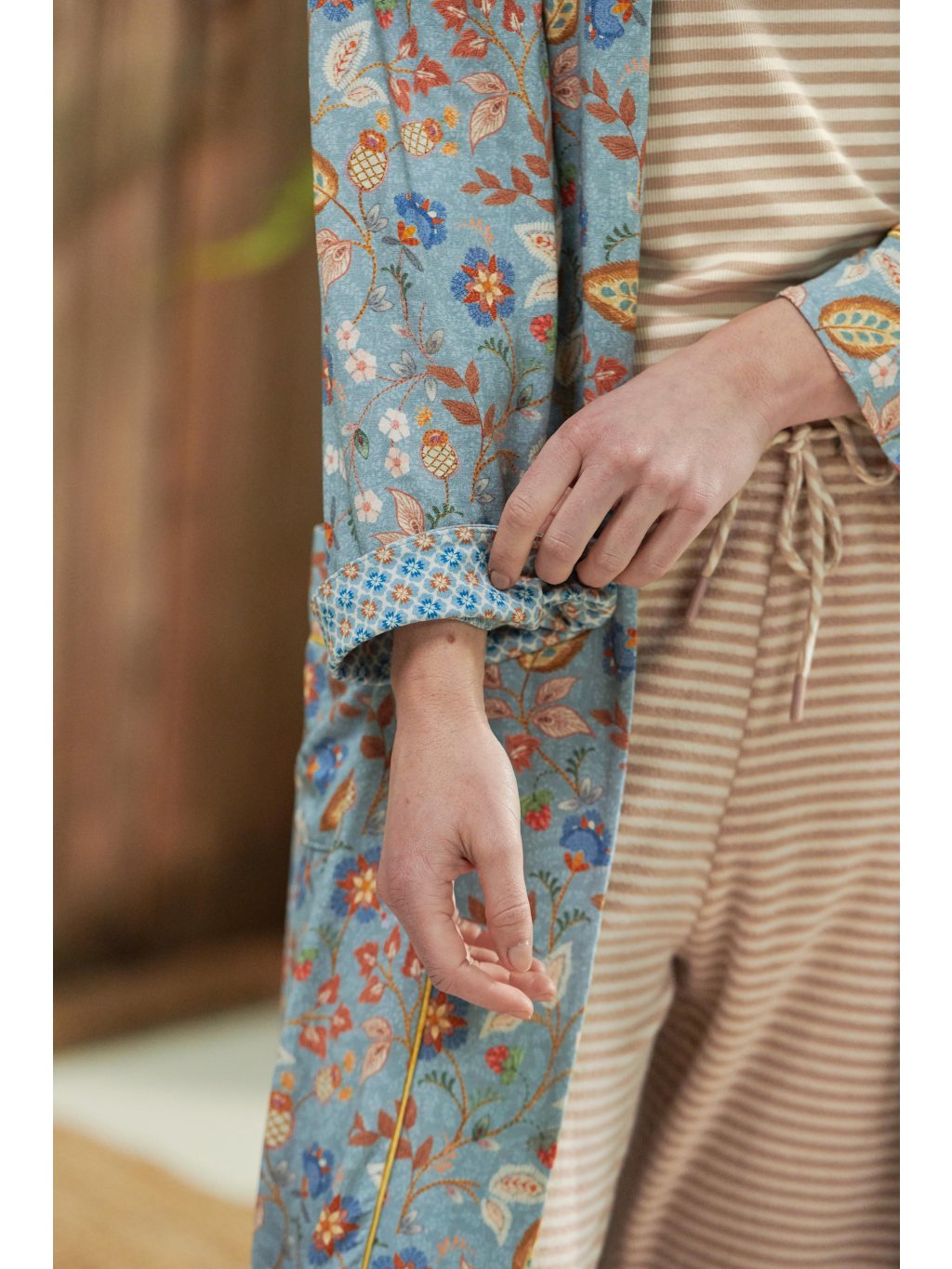 Lehké, velmi ženské kimono s širokým měkkým páskem z kolekce Jameela. Elegantní světle modrá barva je bohatě zdobená drobným květinovým motivem. Látka je velmi jemná, splývavá, díky 5% elastanu se krásně přizpůsobí Vašim křivkám.