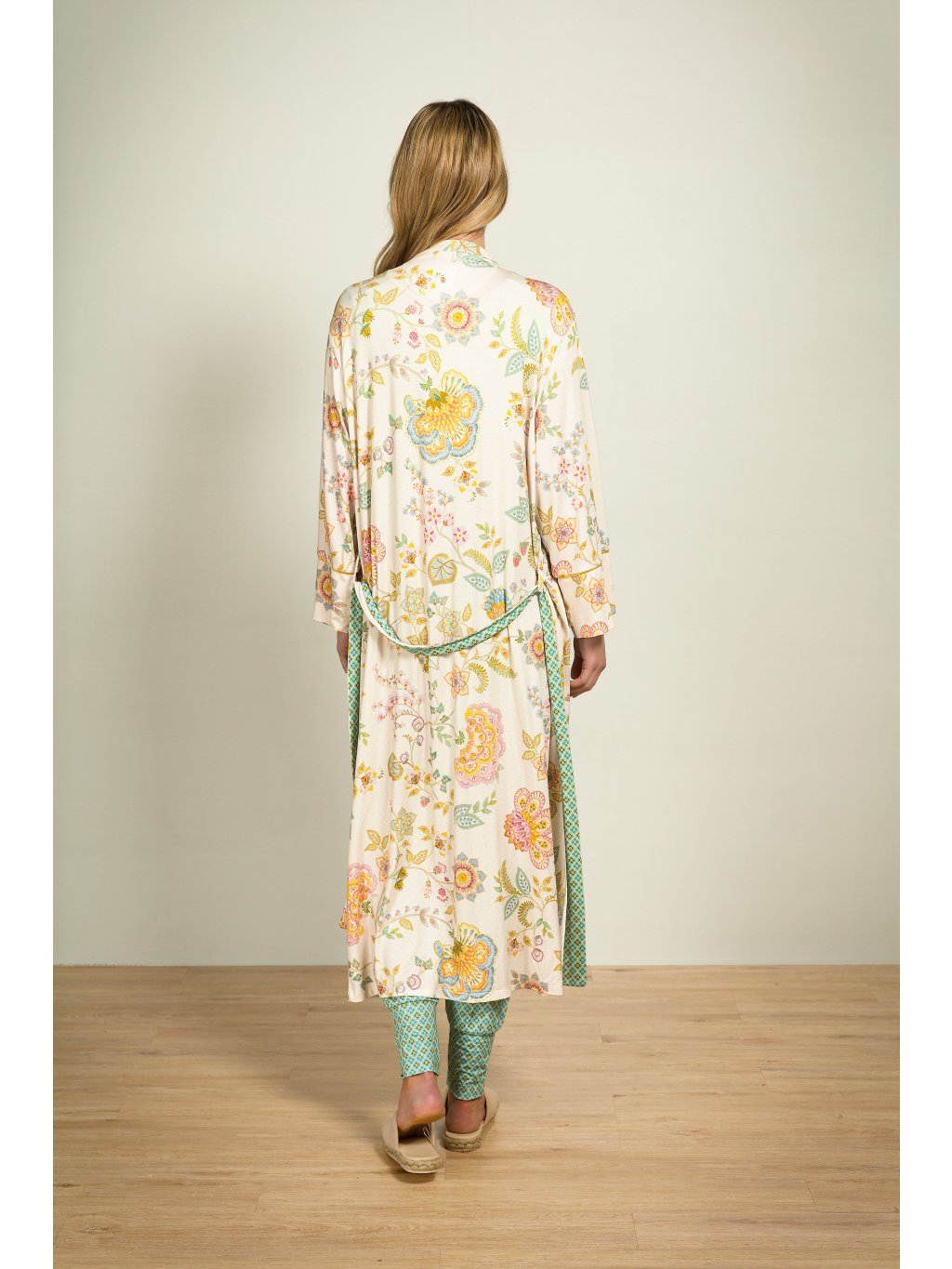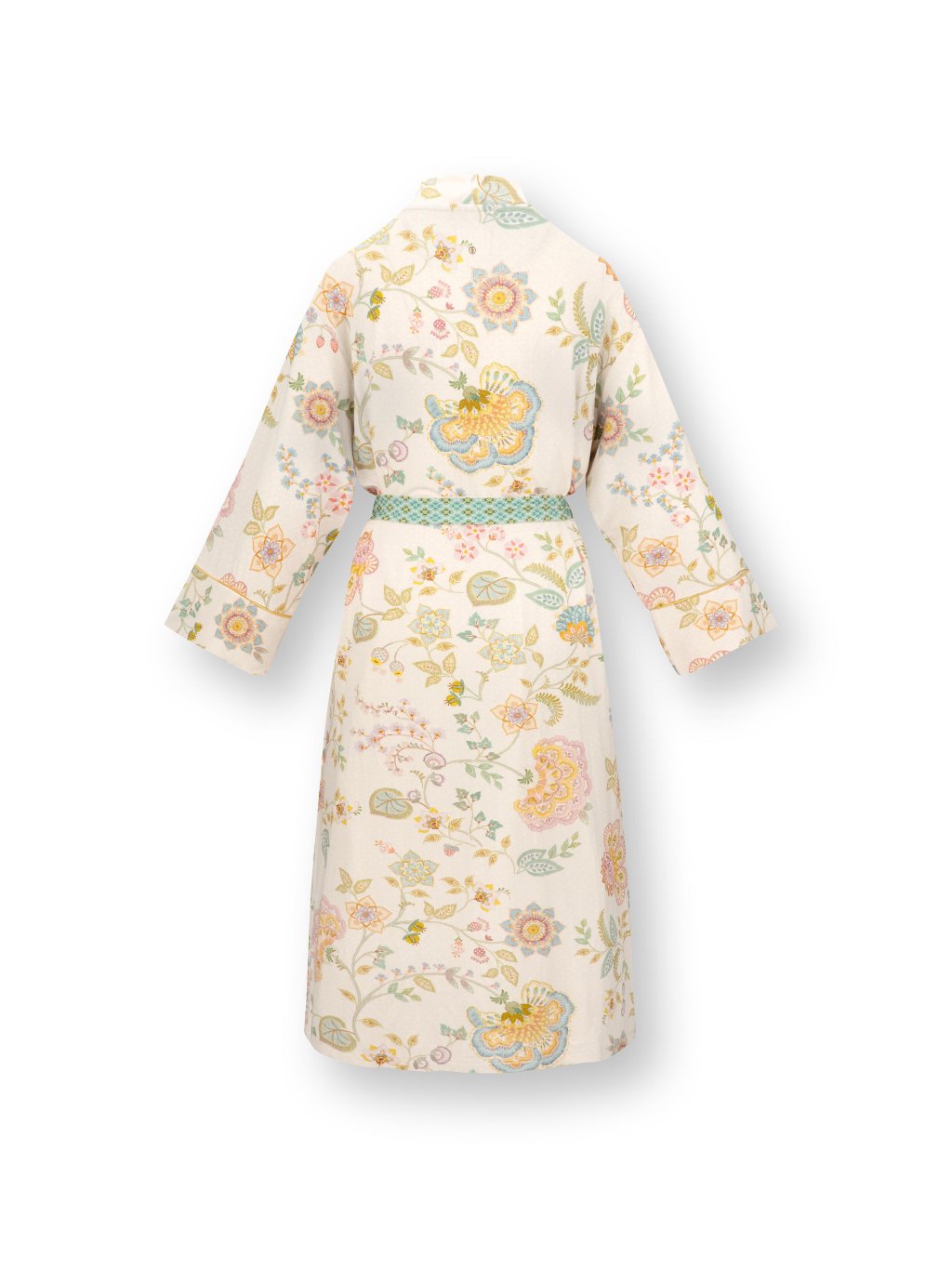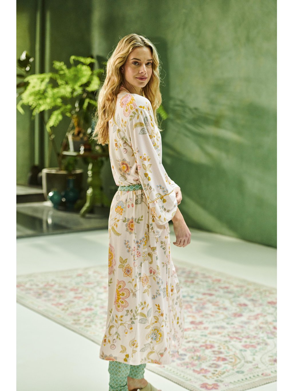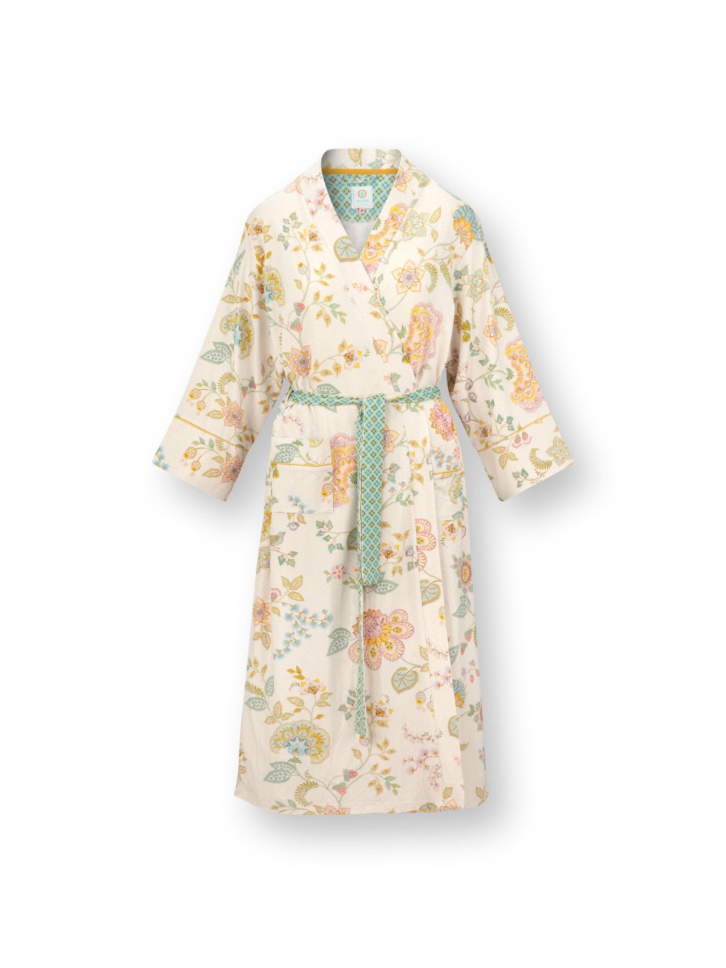 Noa kimono z kolekce Buenas Noches s dlouhými, volnými rukávy je vyrobeno z příjemně měkké elastické viskózy, která zajišťuje optimální komfort. Rukávy mají výrazné manžety. Jedná se o dlouhý model s dvěma našitými kapsami na přední straně. Tento model patří k našim nejdelším a je proto určen pro vyšší ženy. Potisk Buenas Noches zobrazuje bohatě zdobené květiny a listy, které při bližším pohledu vypadají, jako by byly ručně vyšívané.