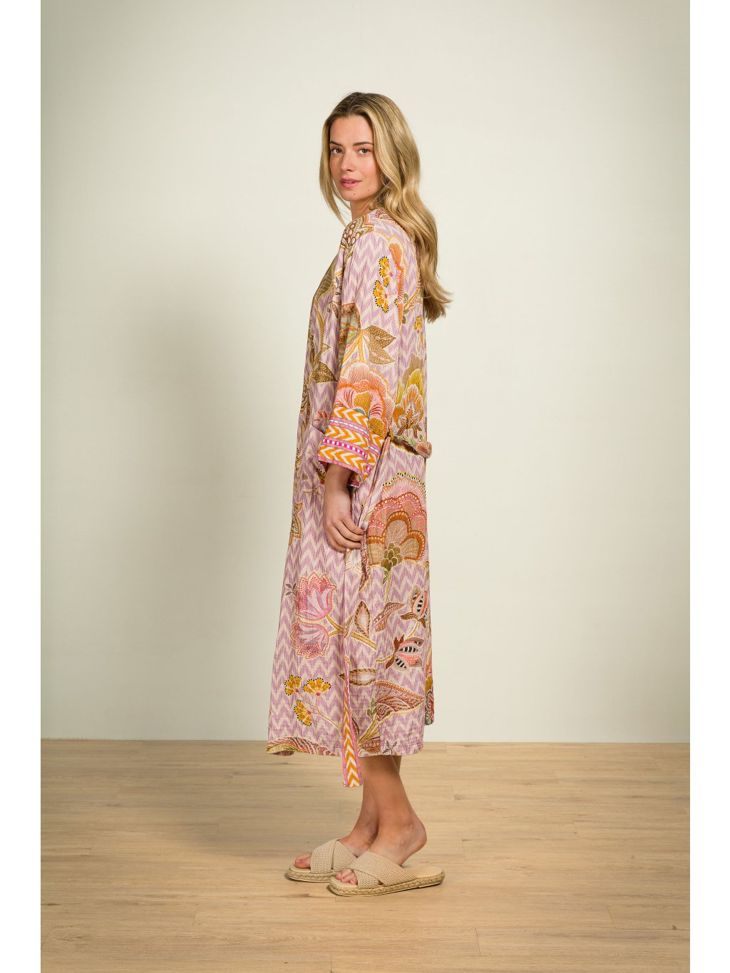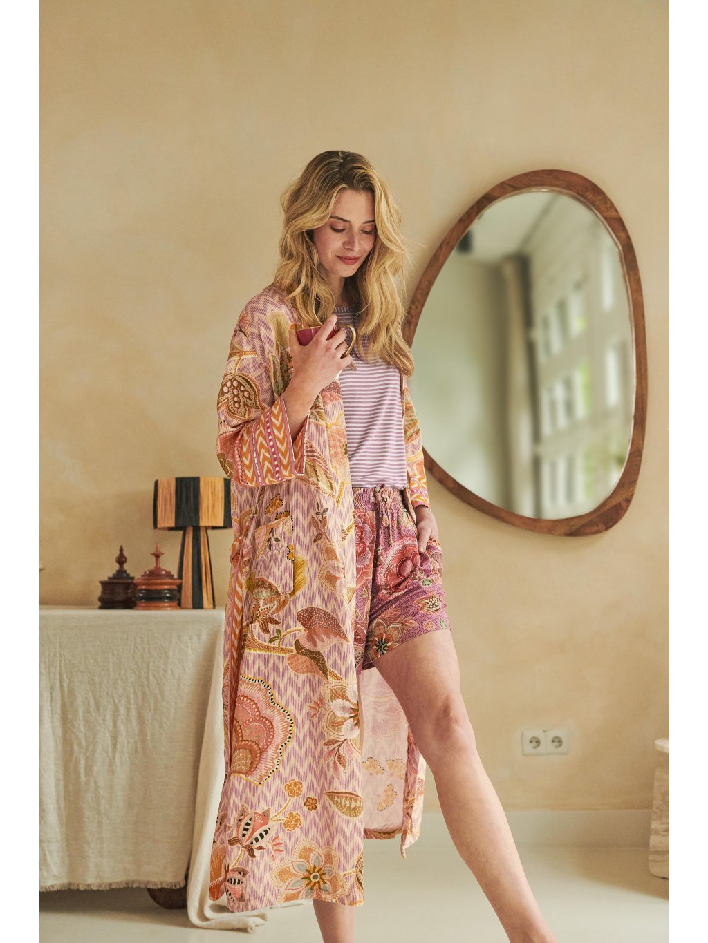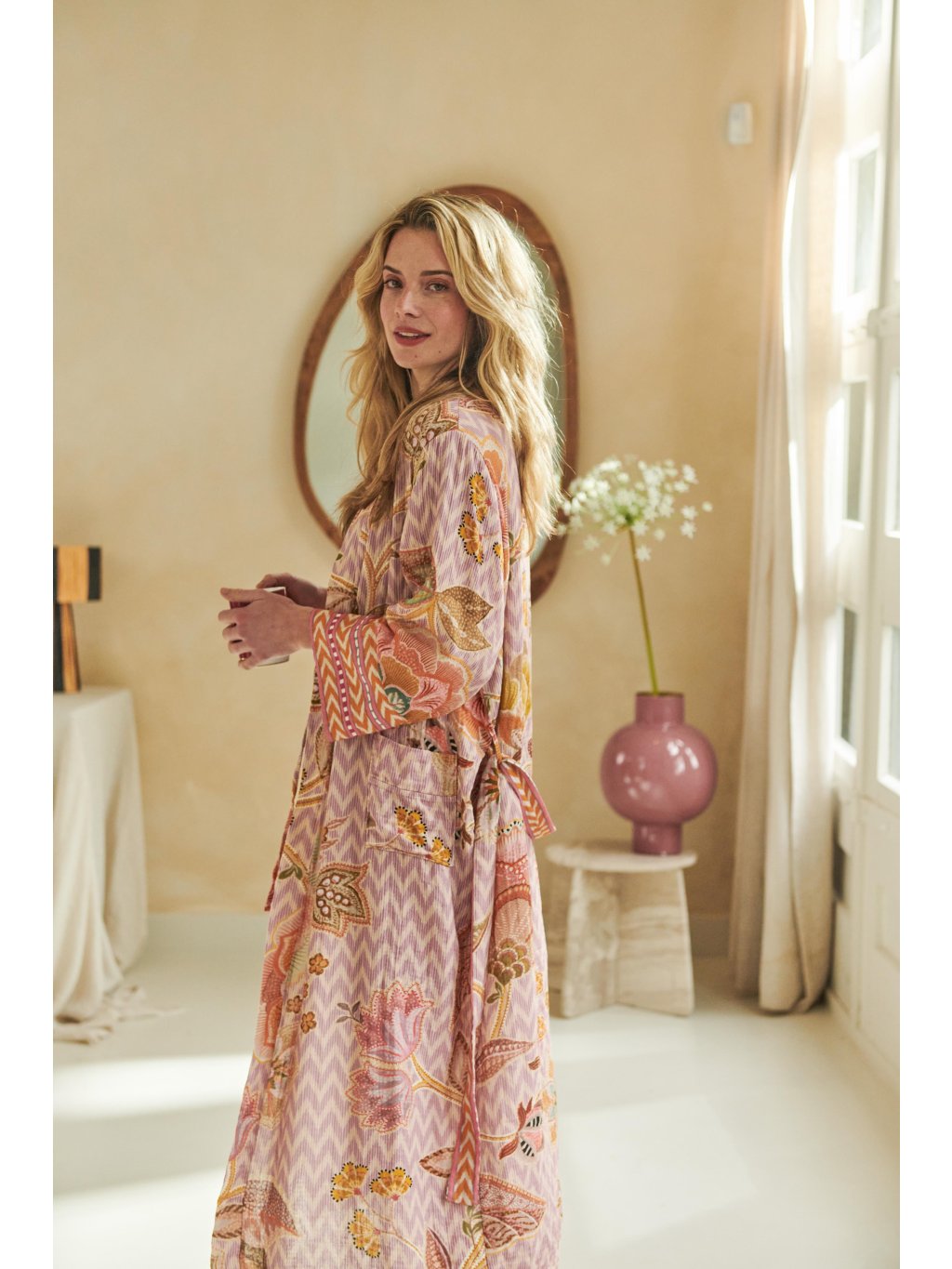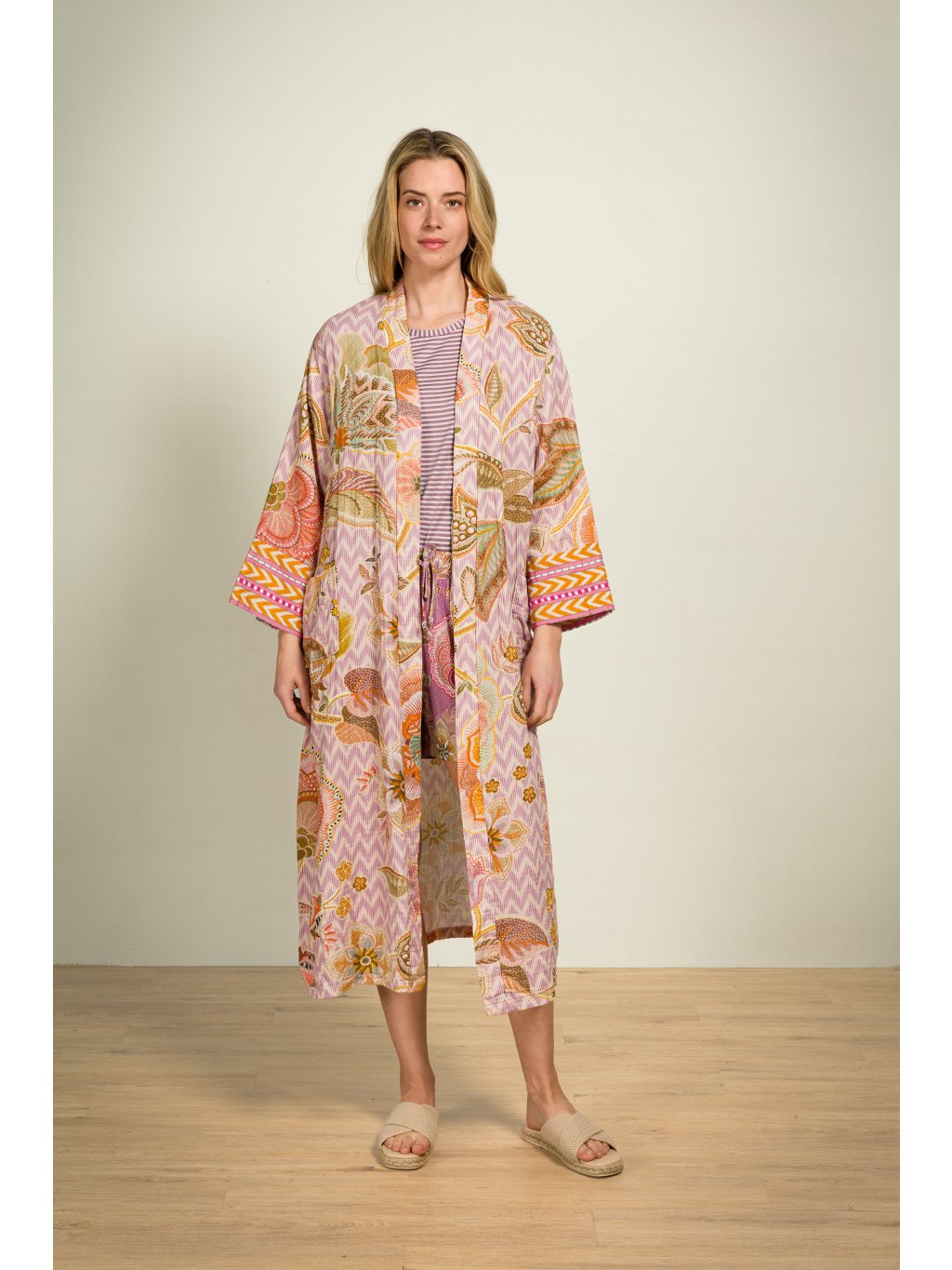 Noa Kimono s dlouhými, splývavými rukávy je vyrobeno ze 100% bavlněného mušelínu*, což z něj činí úžasně lehký kousek pro teplé letní dny. Rukávy mají výrazné manžety. ento model patří k našim nejdelším a je proto určen pro vyšší ženy. Kimono má dvě náprsní kapsy na přední straně. Vzor Hakuna zobrazuje velké, bohatě zdobené květiny a listy inspirované africkými potisky. Květiny jsou ozdobeny tečkovanými okraji, pruhy a dalšími hravými detaily. Pozadí zdobí veselý cik-cakový pruh.