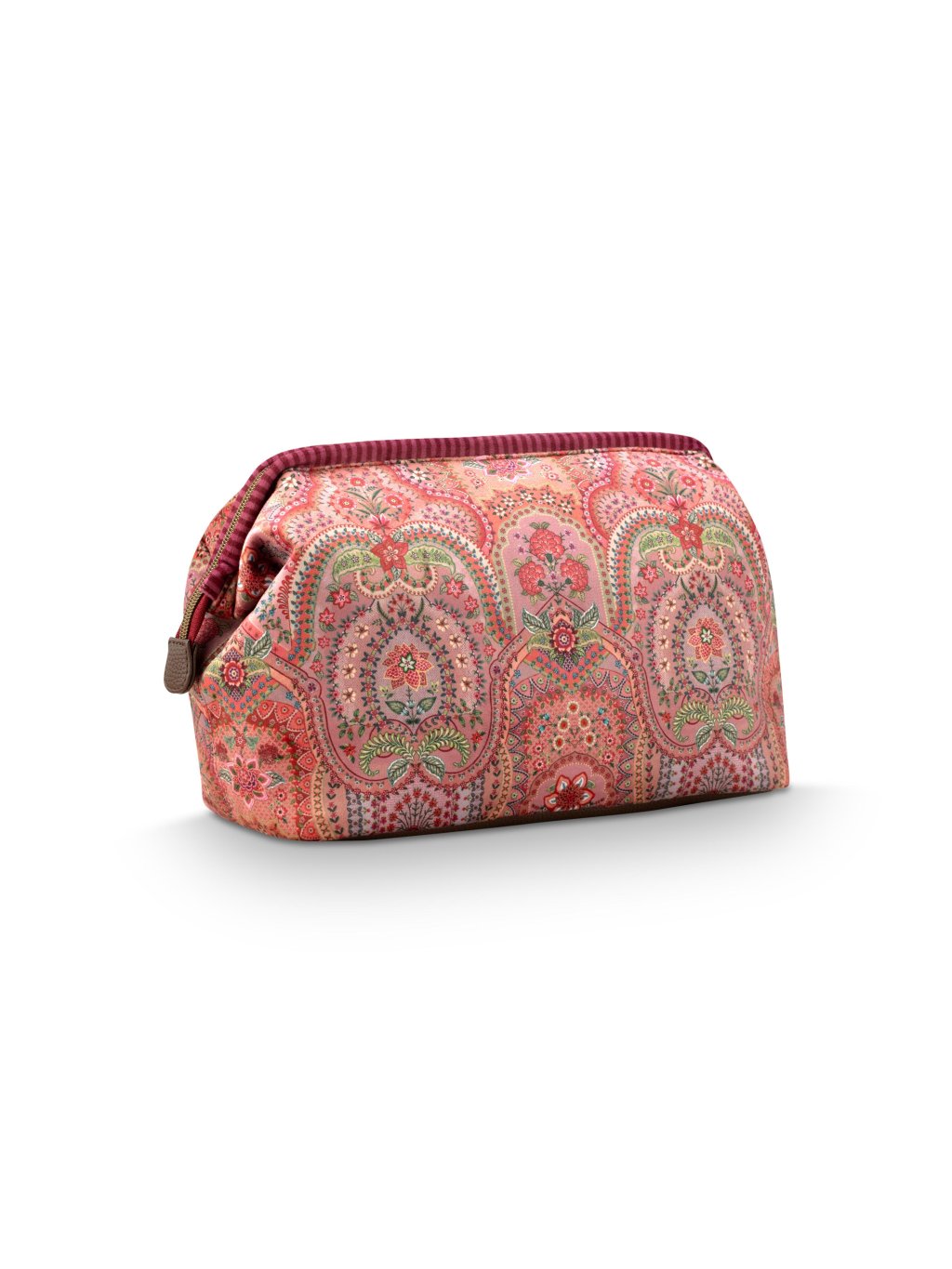 Extra velká luxusní kosmetická taška z polyesterového sametu v nádherném ornamentálním vzoru kolekce Jabali a s vnitřkem z omyvatelné pruhované látky. Díky kovové konstrukci u zipu drží taška otevřená, takže v ní můžete pohodlně hledat vše potřebné. Zapínání na zip. Uvnitř 3 praktické kapsičky. V nabídce také v jiných dekorech a velikostech.