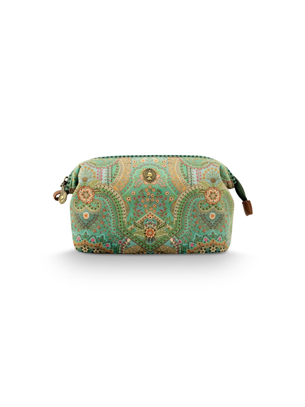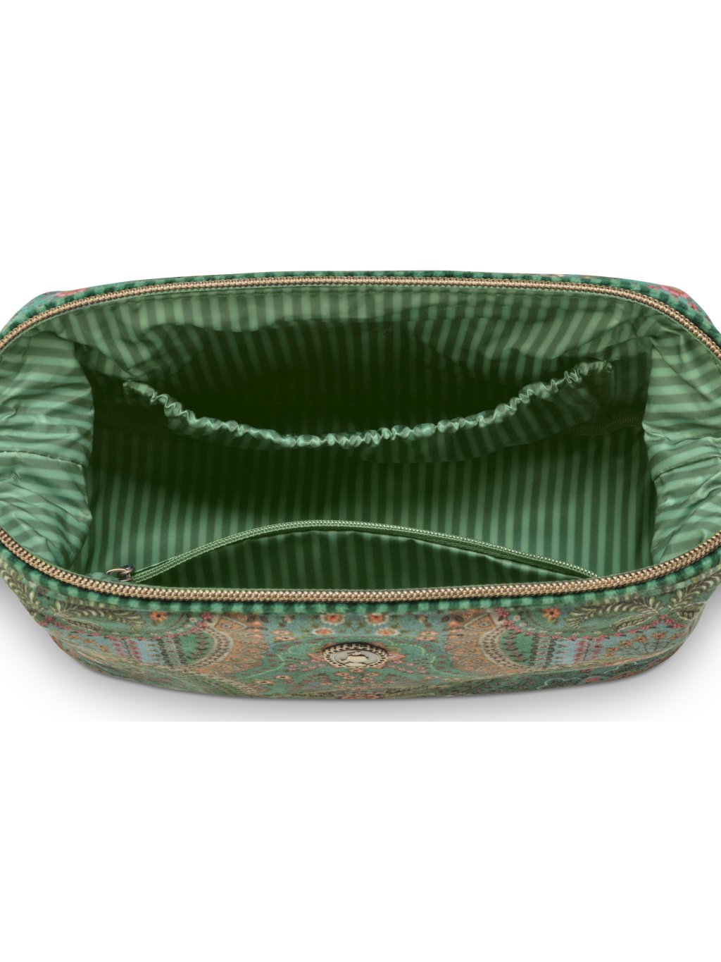 Extra velká luxusní kosmetická taška z polyesterového sametu v nádherném ornamentálním vzoru kolekce Jabali a s vnitřkem z omyvatelné pruhované látky. Díky kovové konstrukci u zipu drží taška otevřená, takže v ní můžete pohodlně hledat vše potřebné. Zapínání na zip. Uvnitř 3 praktické kapsičky. V nabídce také v jiných dekorech a velikostech.