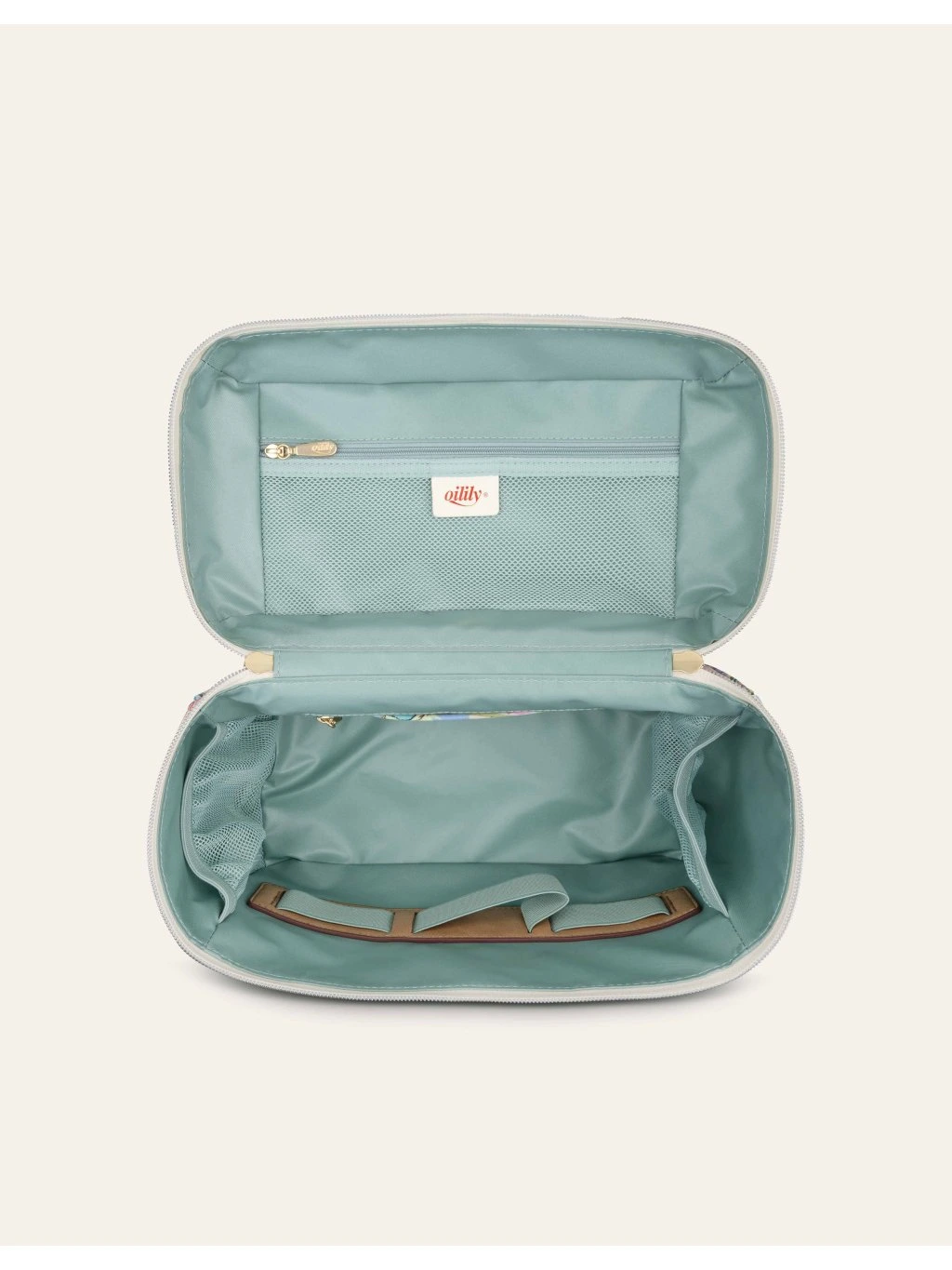 Uvnitř najdete prostornou hlavní přihrádku na zip, doplněnou o průhlednou kapsu se zrcátkem, další kapsy na zip a praktické nastavitelné gumičky na kosmetiku po stranách. V klopě se nachází síťovaná kapsa na zip, ideální pro menší doplňky.