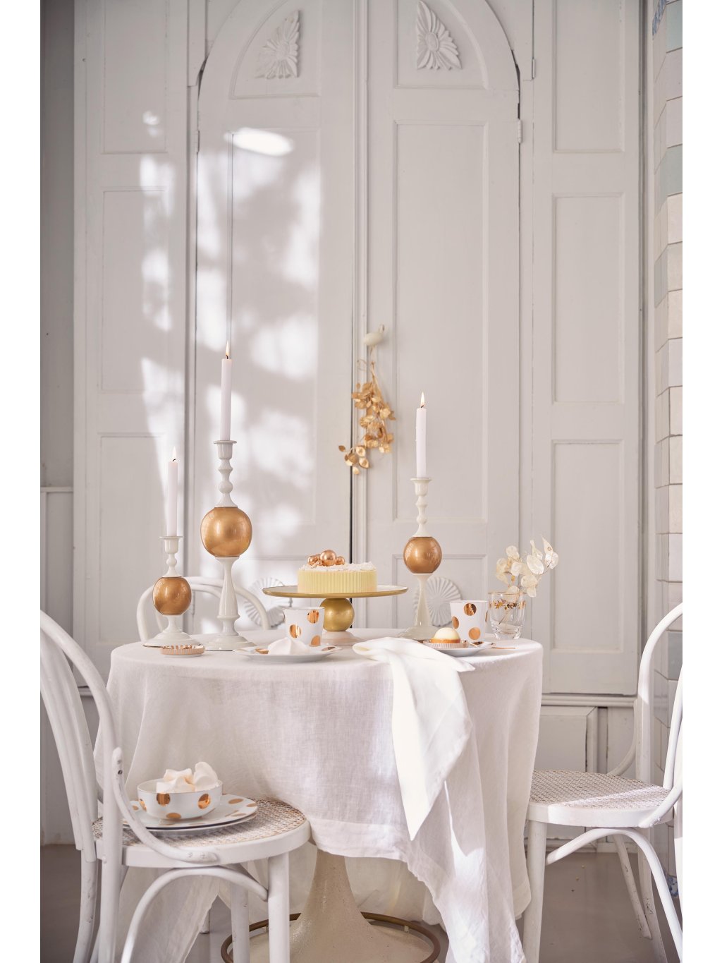 Lehká kovová mísa na noze v elegantní bílo zlaté barvě s vnitřkem v odstínu zlaté, dno podlepené sametkou proti odření nábytku. K dispozici v různých barvách a velikostech. Ideální na ovoce, dorty či sezónní dekorace.