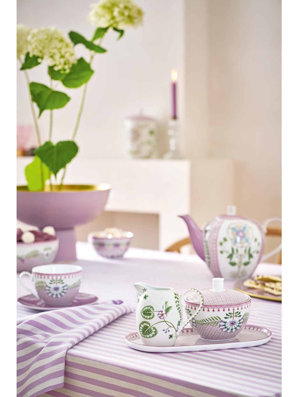 Hlavním motivem nové kolekce je květ lotosu doplněný drobnějšími zelenými lístky v harmonických barvách. Celý vzor je směsicí fialových a růžových tónů se zeleným akcentem.