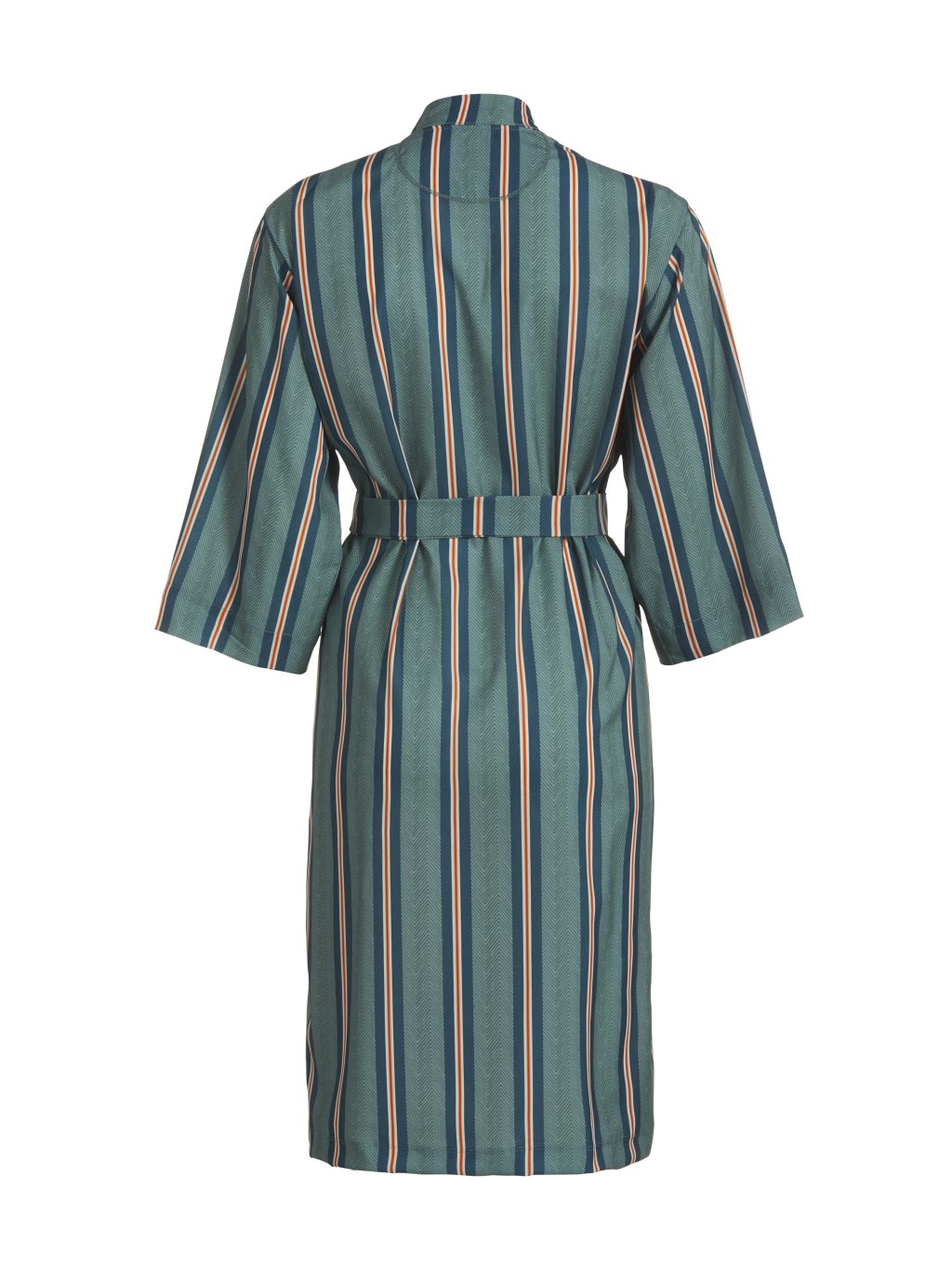 Lehké kimono s širokým měkkým páskem. Skýtá flexibilitu v rámci Vaší velikosti. Zavažte si jej přesně tak těsně, jak je Vám pohodlné. Dekor tmavě zelených, oranžových a bílých pruhů s neohraničenými okraji. Látka je velmi jemná a tenká, splývavá, má chladivý efekt, ideální na teplejší dny.