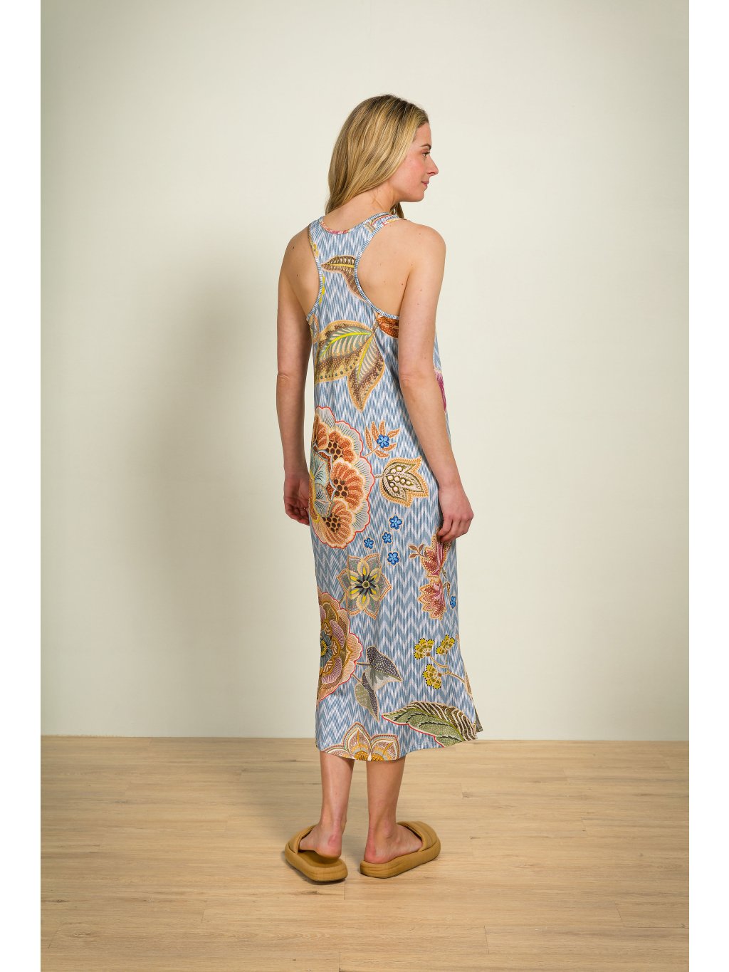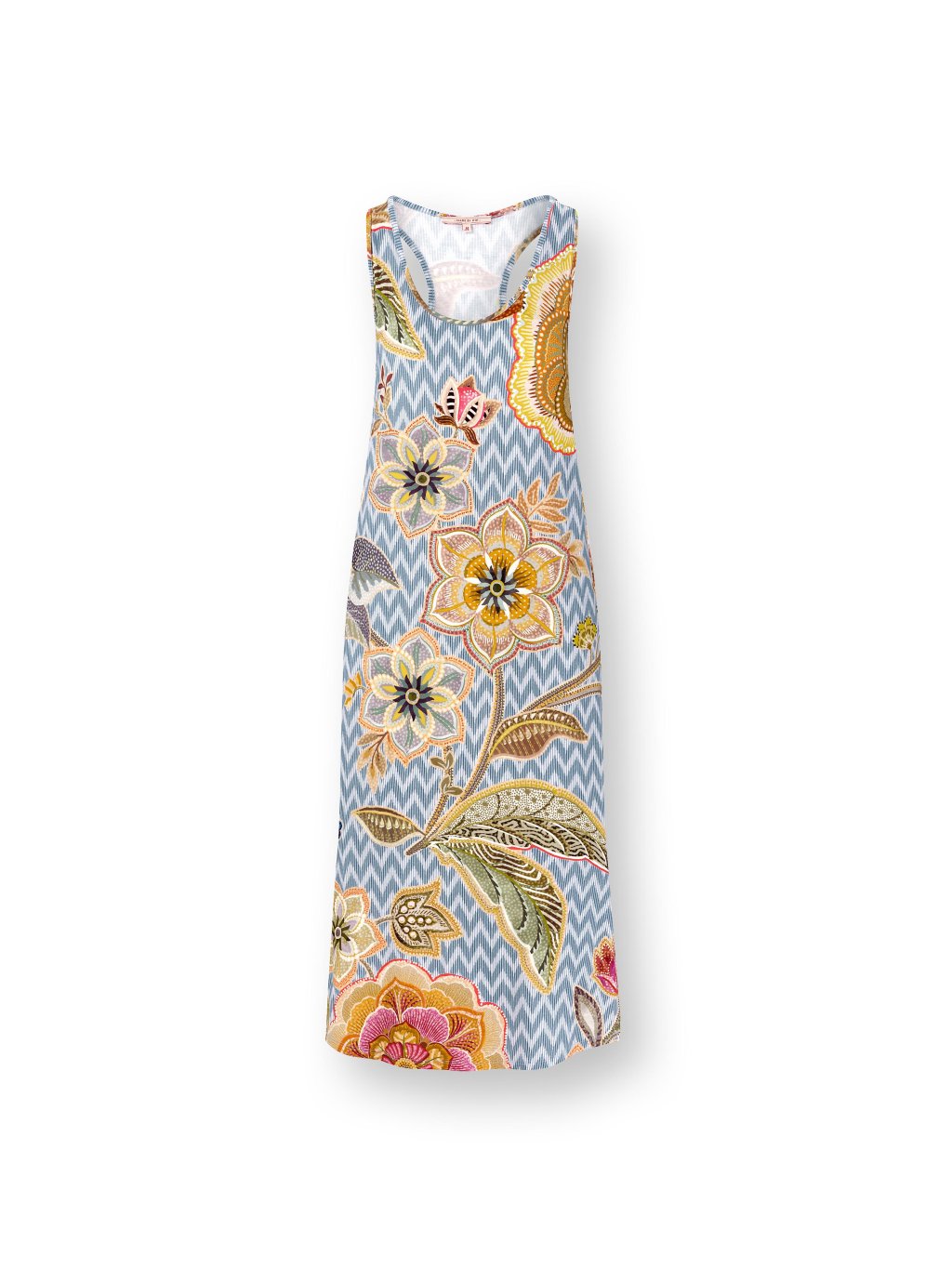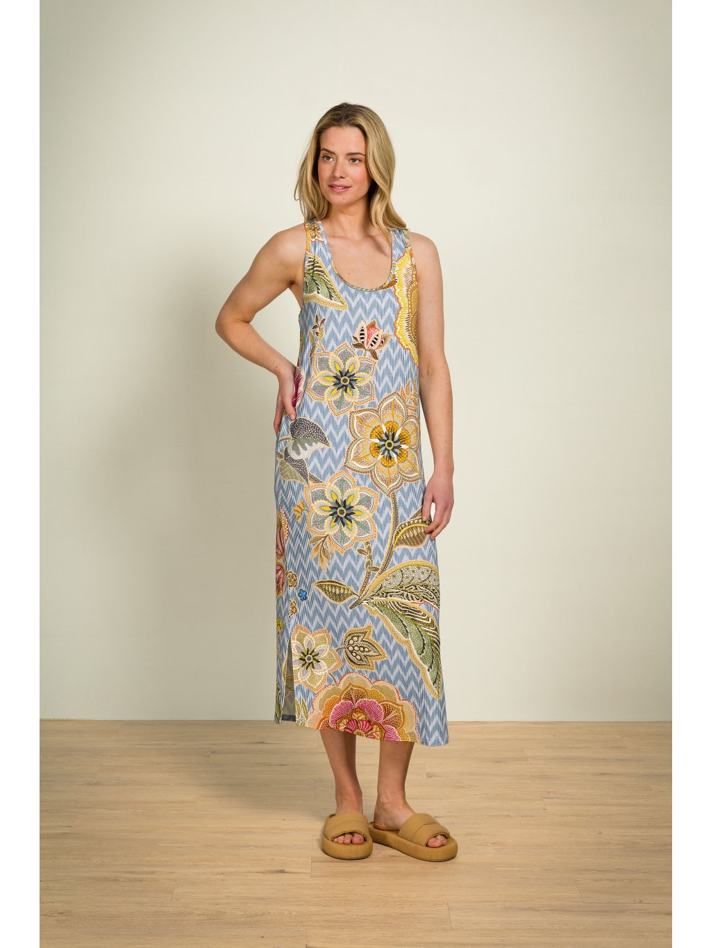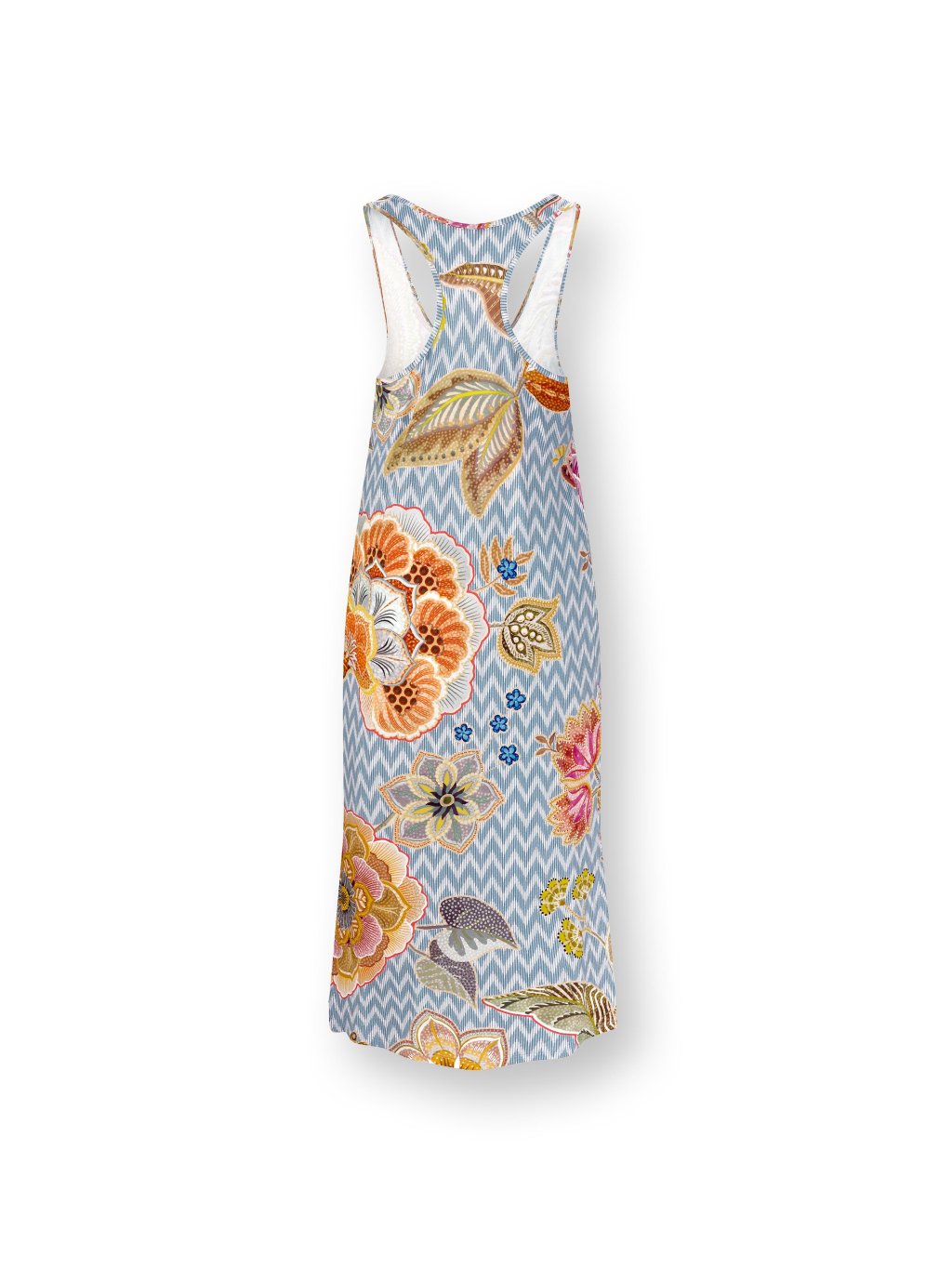 Lehká noční košile/šaty bez rukávů, na širší ramínka. Vzor Hakuna zobrazuje velké, bohatě zdobené květiny a listy inspirované africkými potisky. Květiny jsou ozdobeny tečkovanými okraji, pruhy a dalšími hravými detaily. Pozadí zdobí veselý cik-cakový pruh. Nabízíme v různých velikostech a také v jiných barvách. Vytvořte si jedinečný komplet z celé kolekce Hakuna nebo Matata