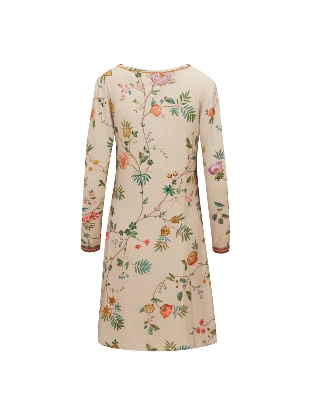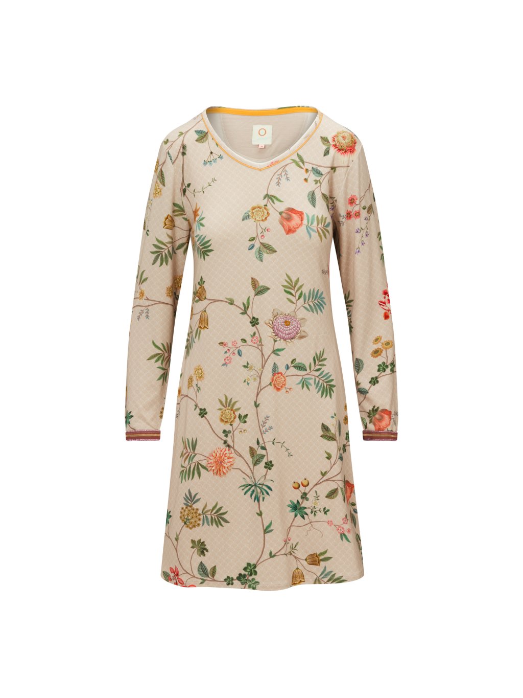 Noční košile v pískové (tlumenější odstín) s dlouhým rukávem a výstřihem do V. Složení: 95% viskóza, 5% elastan. Prát porubu na 30´C.