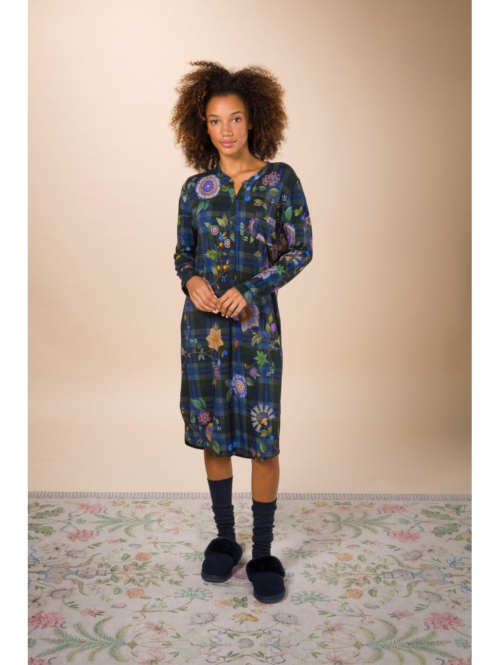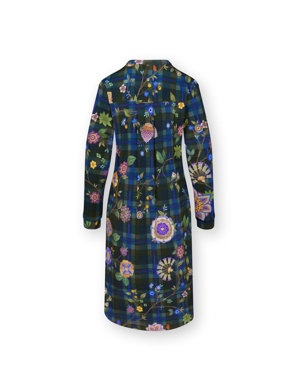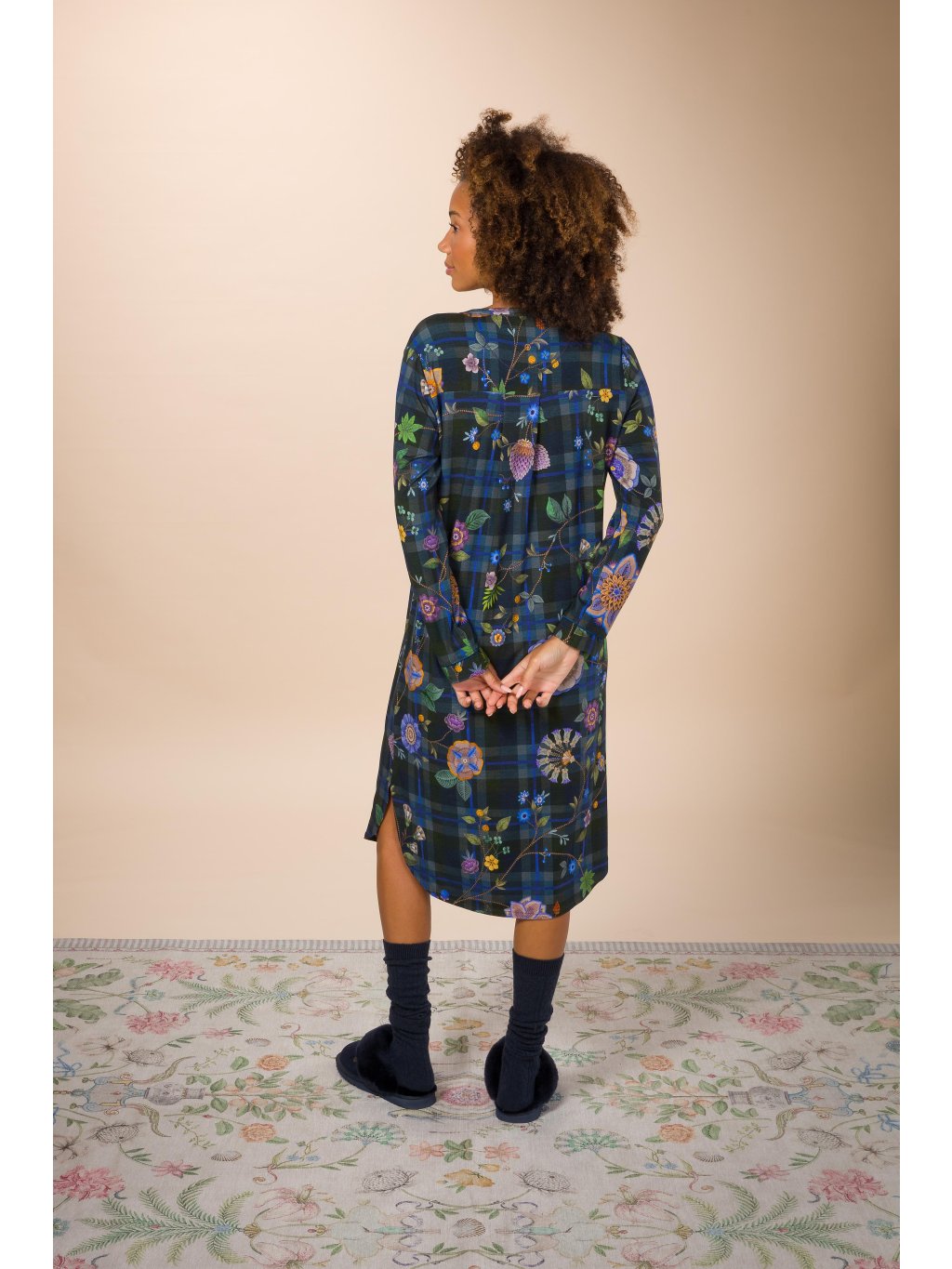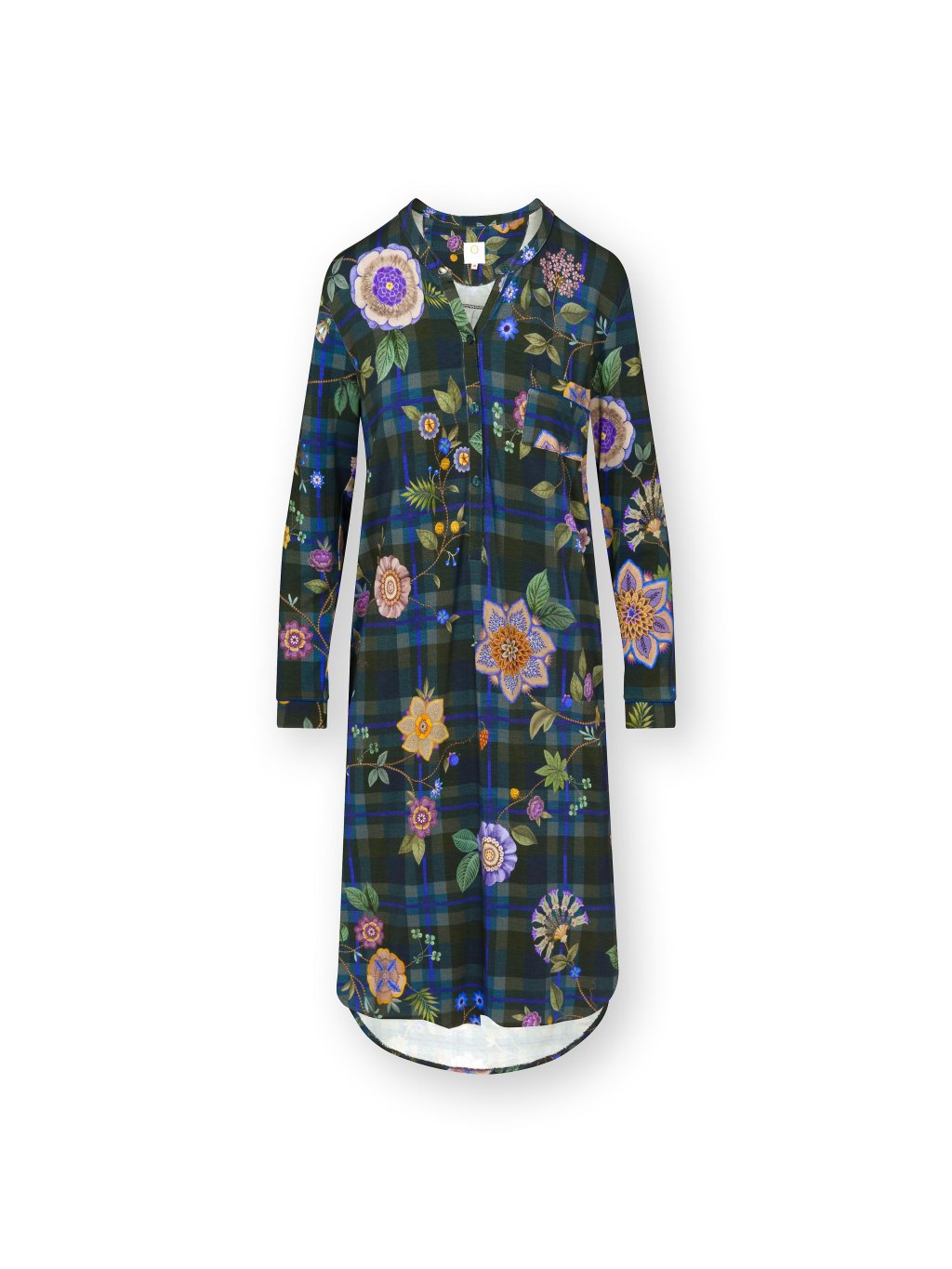 Luxusní noční košile s dlouhým rukávem z kolekce Flores Felices v mystické tmavomodré barvě. Má knoflíkovou légu pro snazší oblékání přes hlavu. Zadní díl je lehce nabíraný na lopatkách pro komfortní nošení. Rukávy zakončeny ozdobným lemem. Jemná splývavá látka je zdobena motivy květů. Doplňte o další kousky z kolekce Flores Felices a doplňte o kalhoty, kimono či top z naší nabídky.