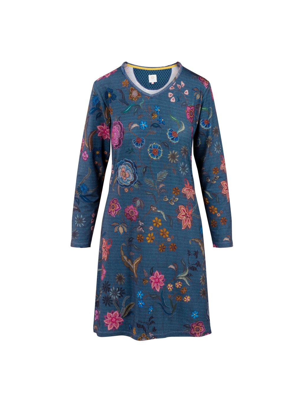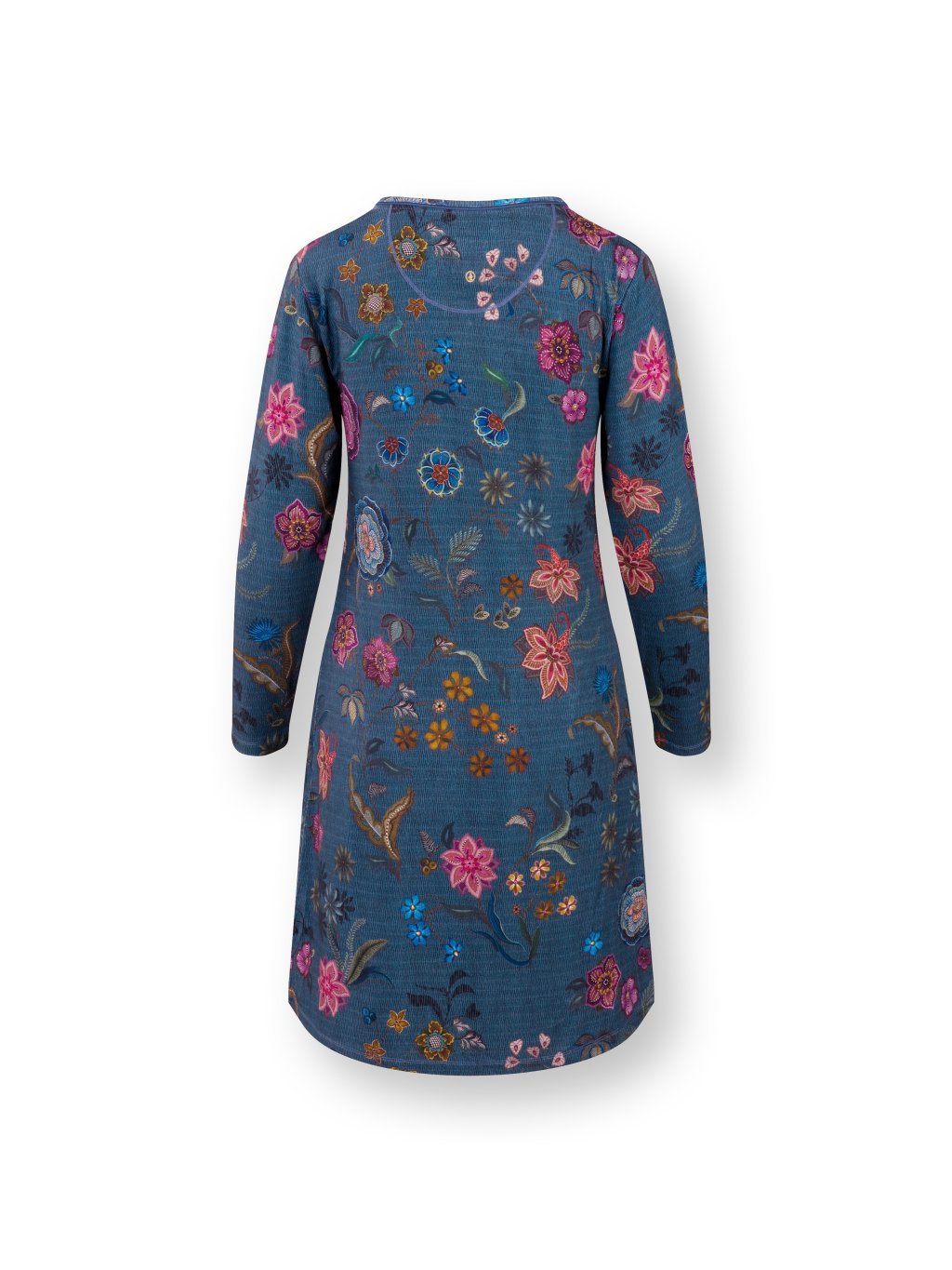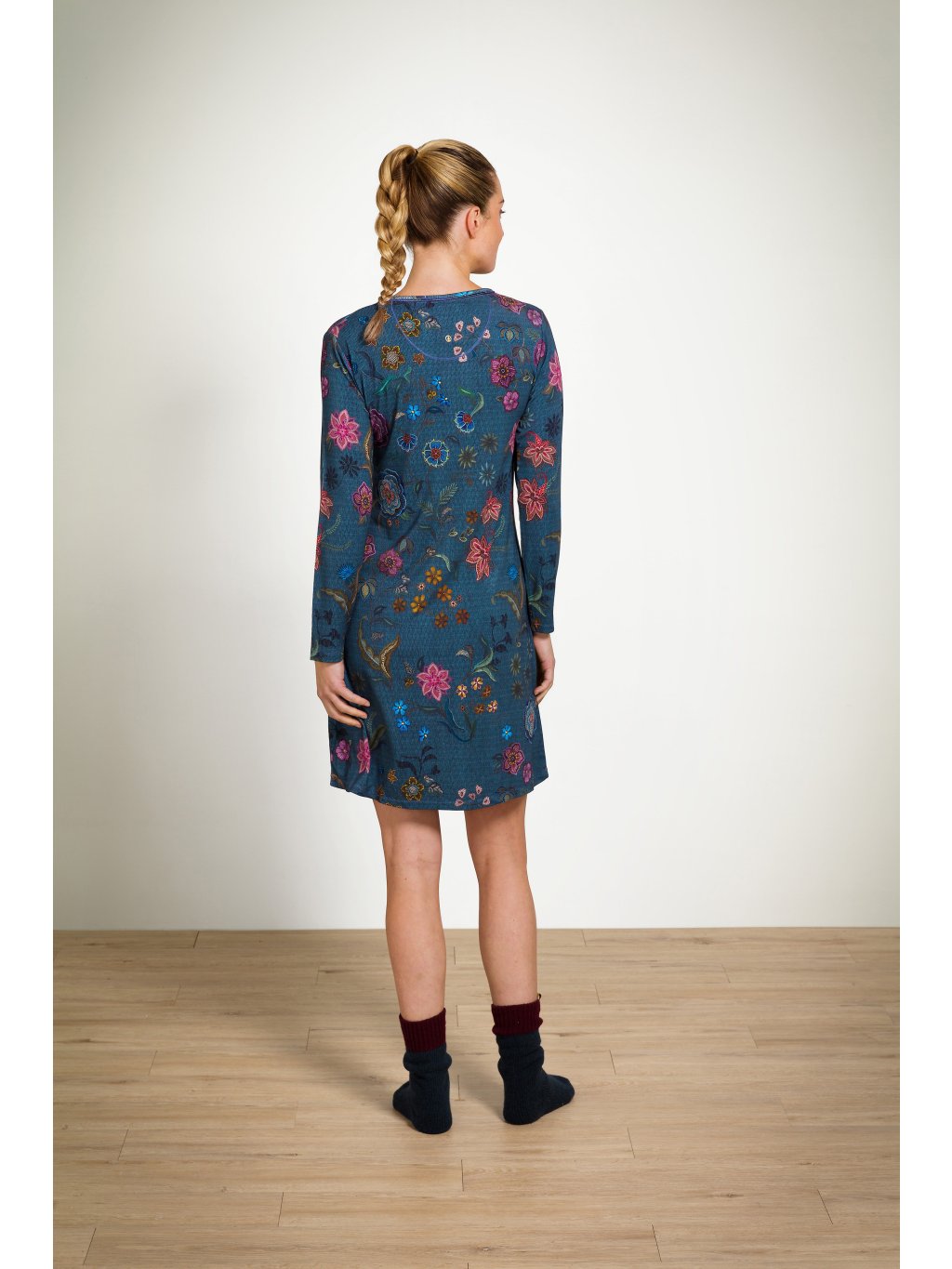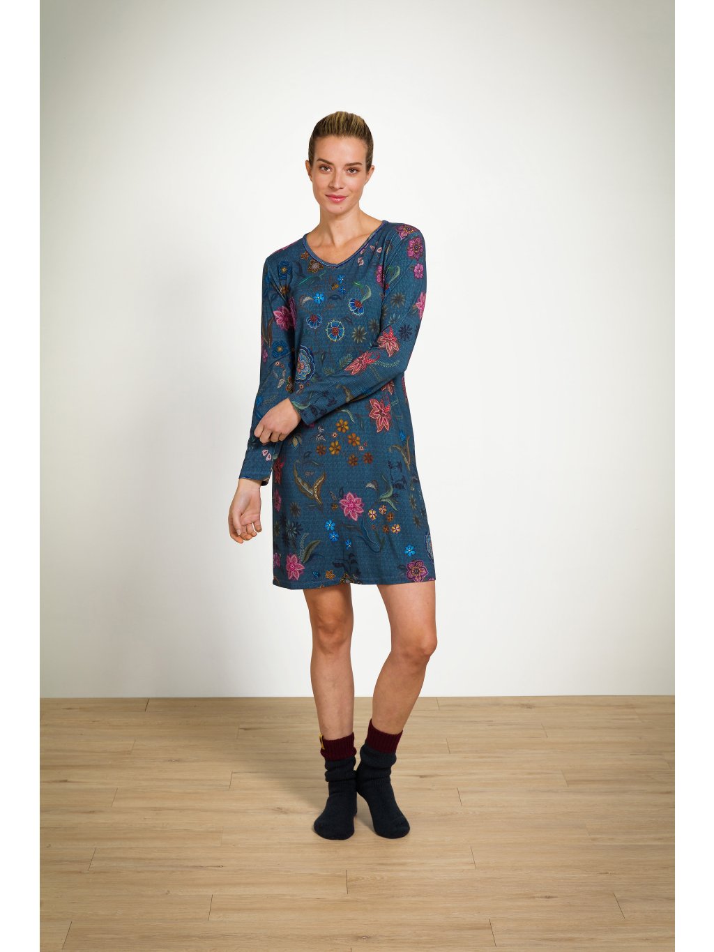 Lehká noční košile Dana s dlouhým rukávem a výstřihem do V v pohodlném volném střihu. Krátká délka a měkký úplet jí dodávají vzdušnost – ideální pro klidné noci i líná rána. Pružná viskózová směs je hebká, prodyšná a příjemně se přizpůsobí pohybu. Zdobí ji potisk Coco Flower s ručně kreslenými fantazijními květy, puntíky a proužky. Skvěle vypadá s ladícím kimonem.