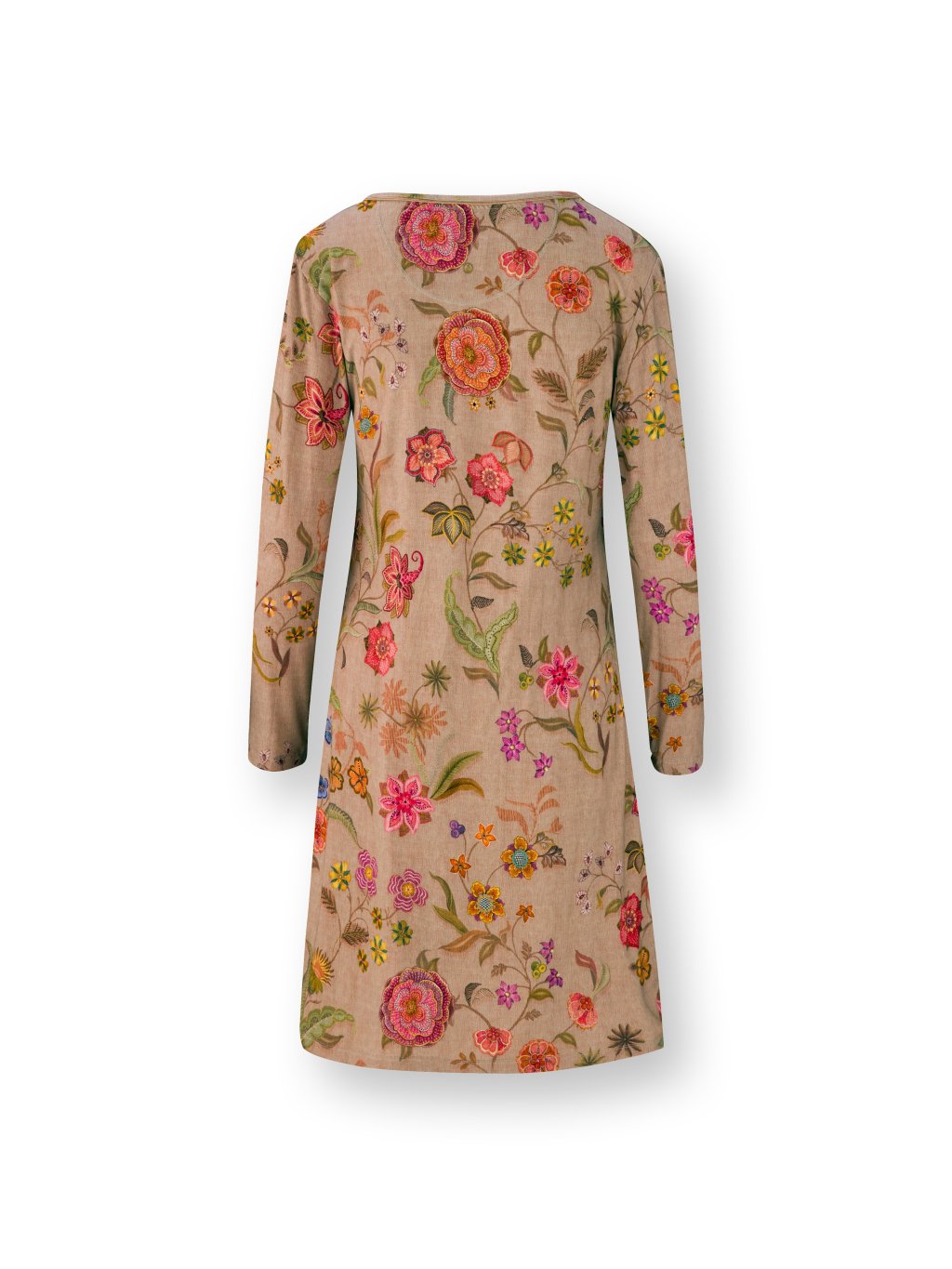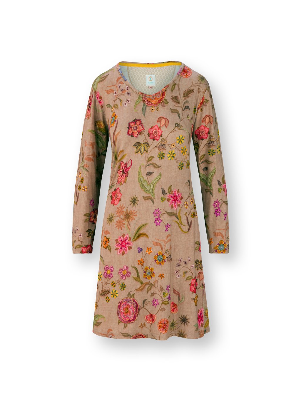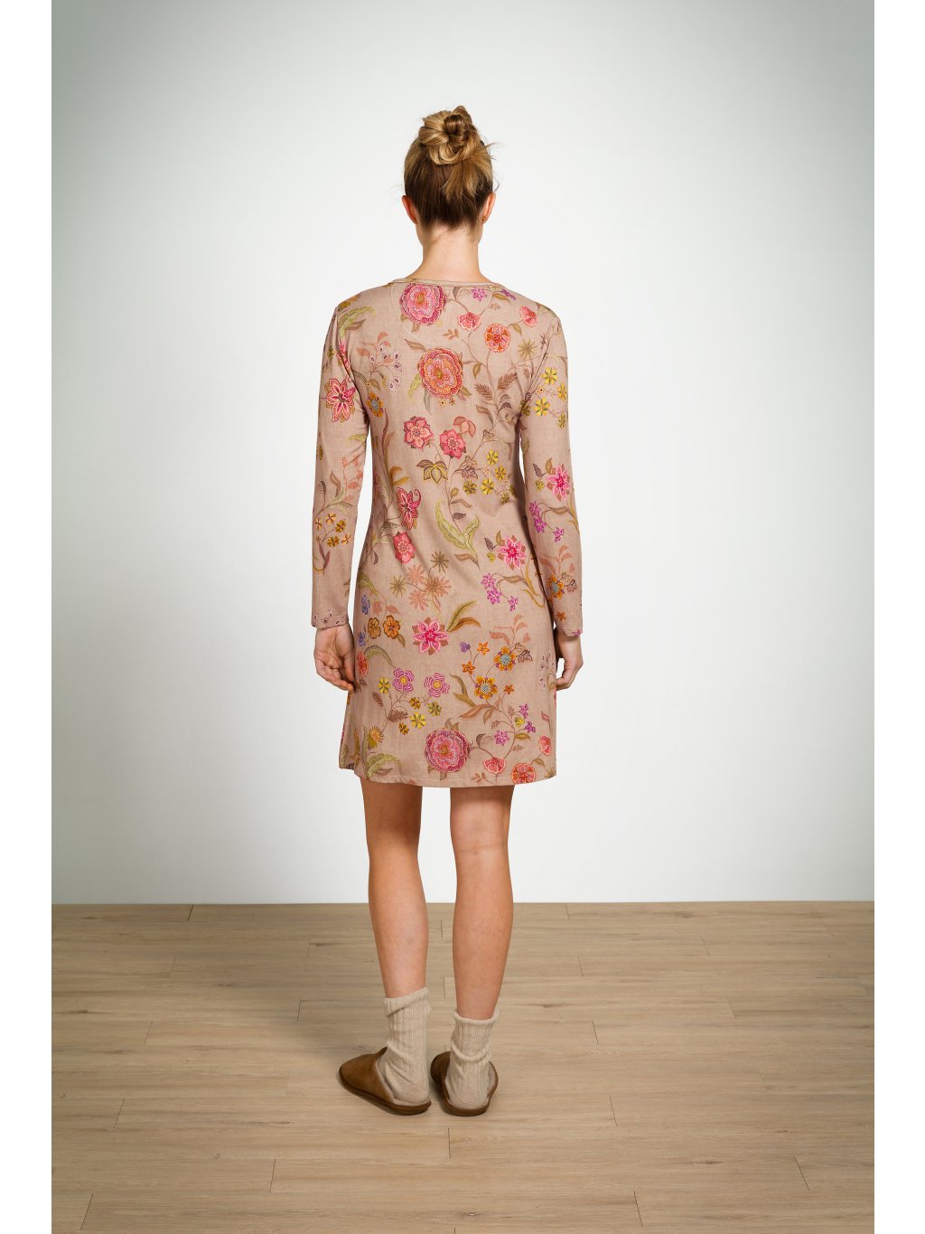 Lehká noční košile Dana s dlouhým rukávem a výstřihem do V v pohodlném volném střihu. Krátká délka a měkký úplet jí dodávají vzdušnost – ideální pro klidné noci i líná rána. Pružná viskózová směs je hebká, prodyšná a příjemně se přizpůsobí pohybu. Zdobí ji potisk Coco Flower s ručně kreslenými fantazijními květy, puntíky a proužky. Skvěle vypadá s ladícím kimonem.