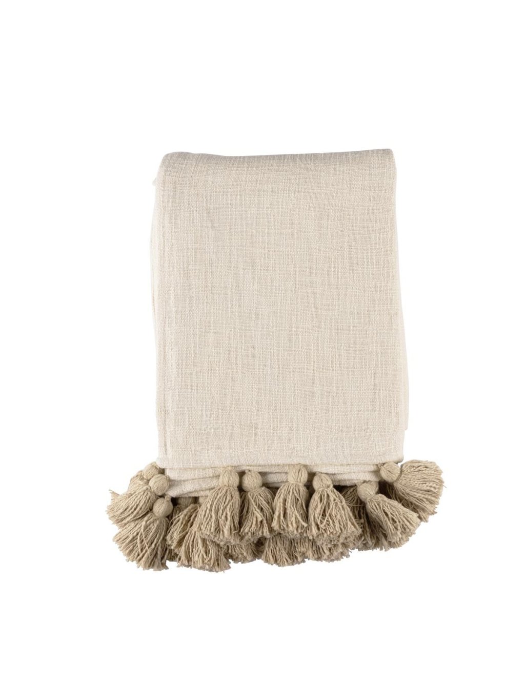 Přehoz v rozměru 130x170cm, obě strany jednobarevné. Horní a dolní lem jsou zdobeny stylovým střapci v harmonické béžové barvě. Materiál: 100% bavlna, údržba dle pokynů na štítku.