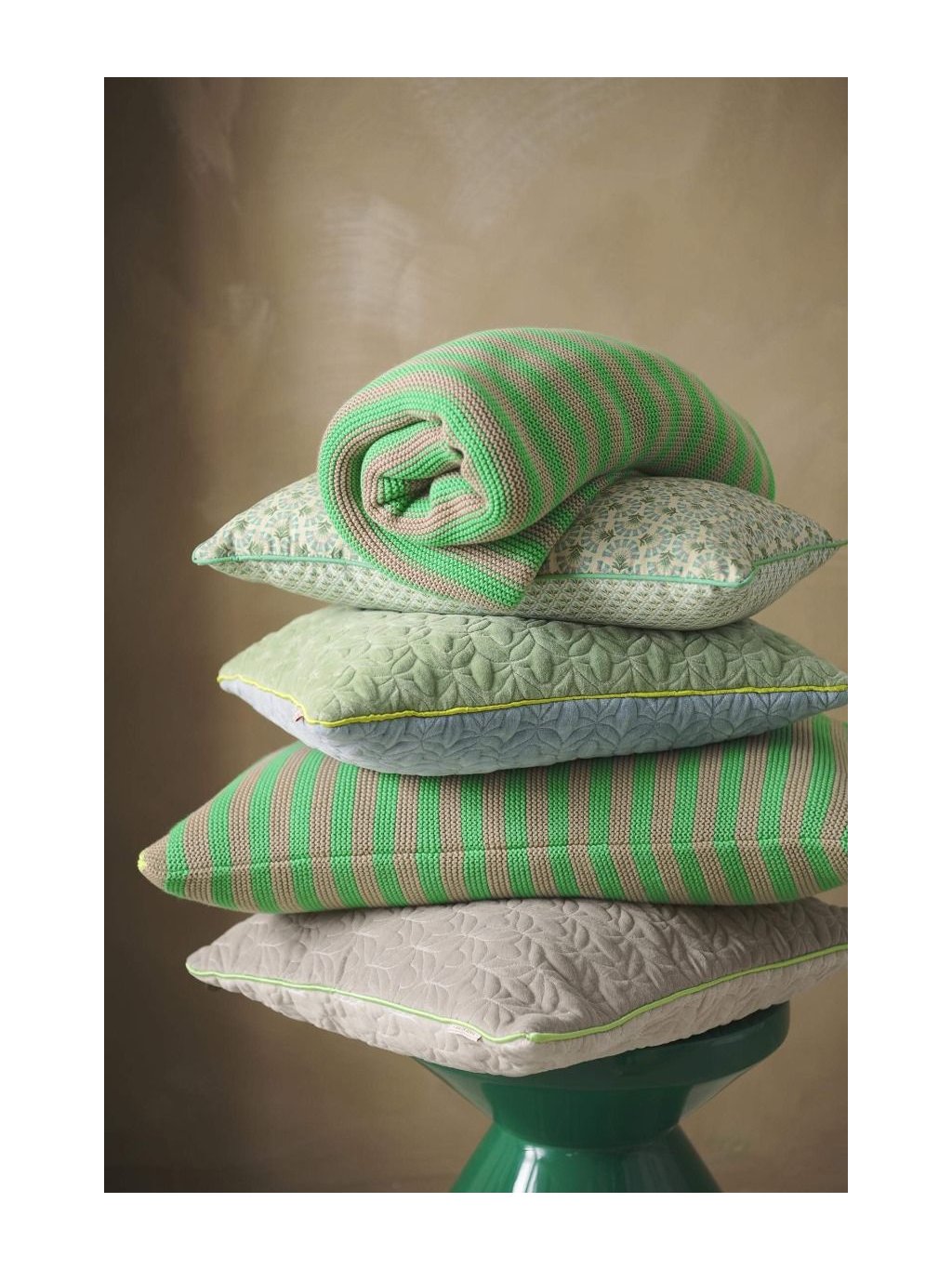 Pletený přehoz/pléd kombinuje zelenou a khaki barvu v pravidelném pruhování. Okraj je zvýrazněný neonovou žlutozelenou barvou.
