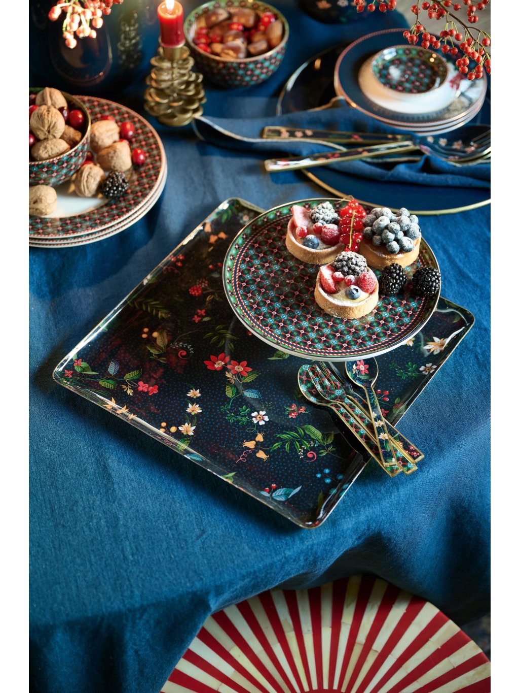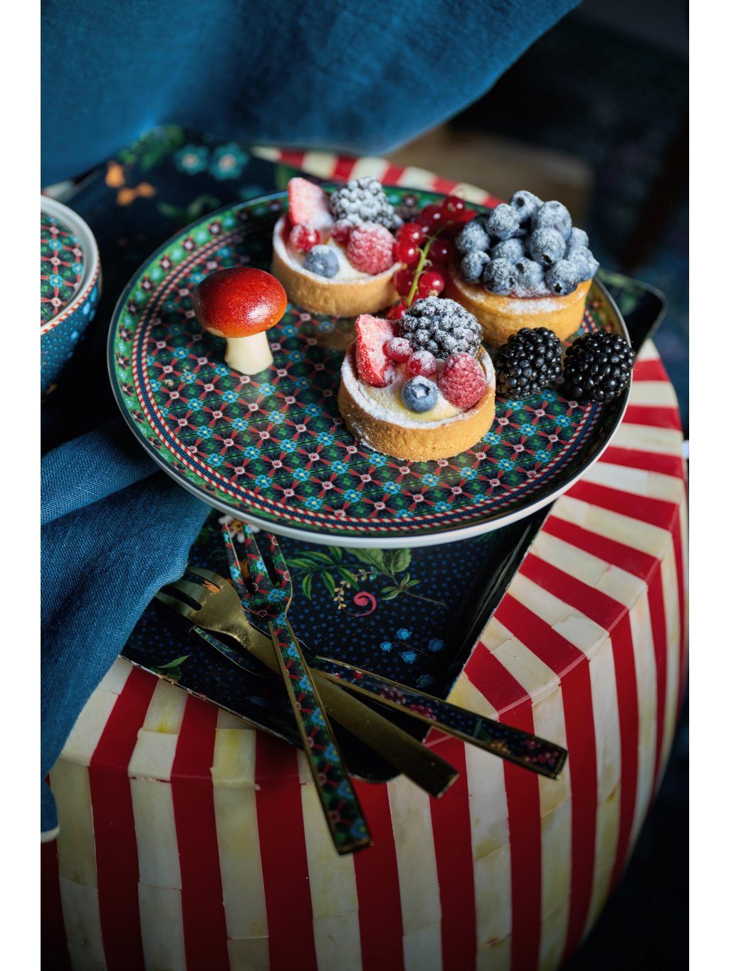 Kulatý dortový tác na nožce s průměrem 21cm je zdobený elegantním pravidelným vzorem Clover (čtyřlístky). Vhodný na servírování malého občerstvení nebo dortíků. Projděte si celou kolekci Berry Blues, která vybízí k vytváření osobitých kombinací harmonických vzorů. Tácy jsou v nabídce také v jiných dekorech a barvách.
