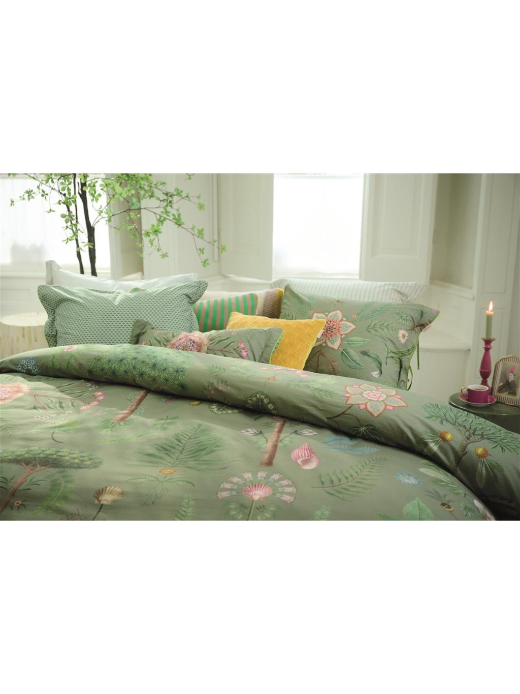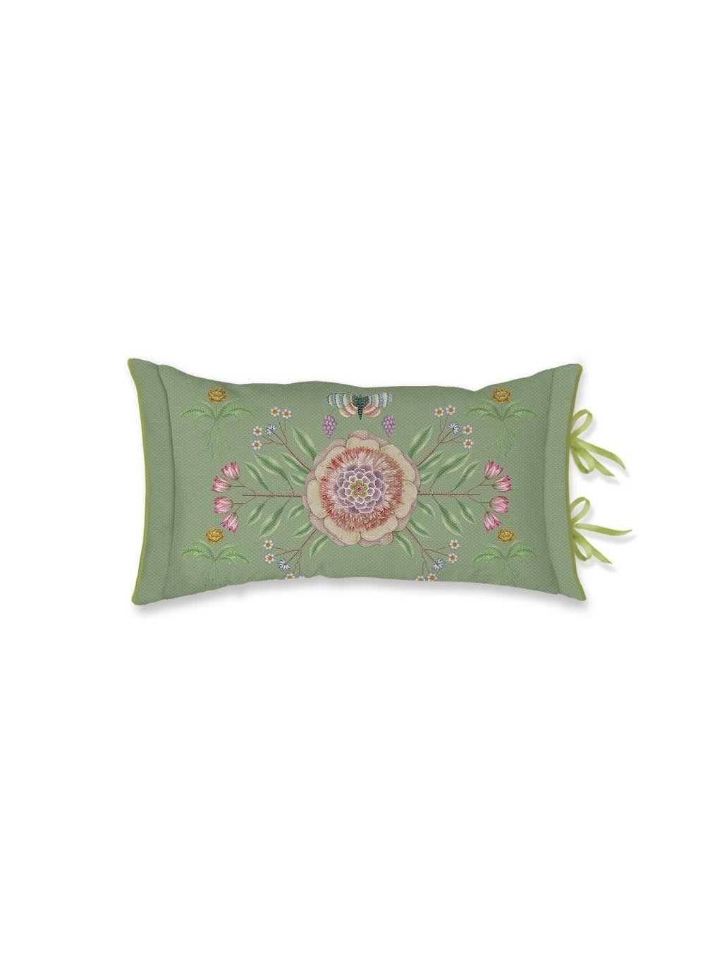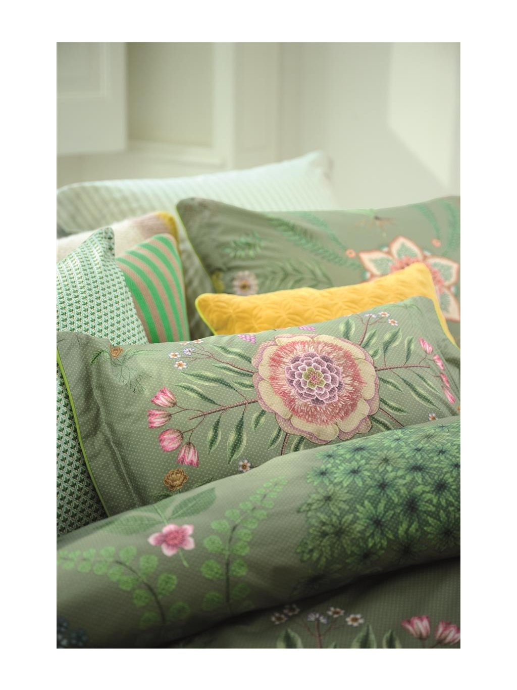 Dekor Bamboleo je charakteristický velkými květy v kombinaci s listy různých tvarů a je velmi bohatý na detaily. Polštář má zavazování na tkalouny.