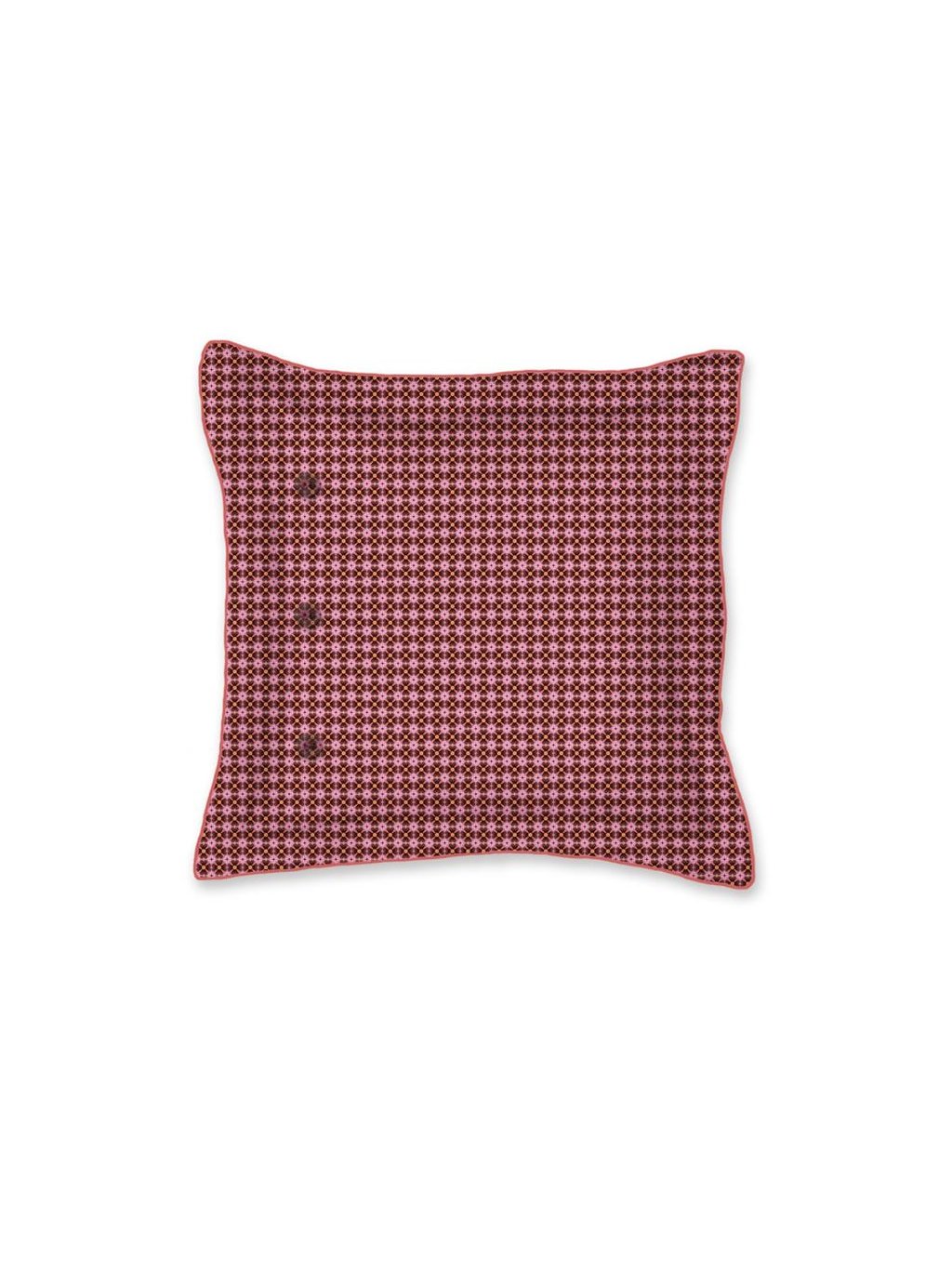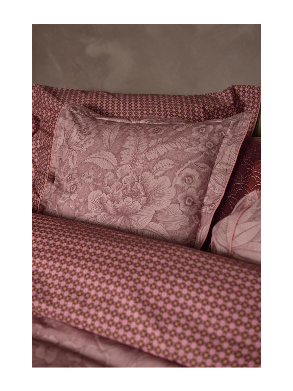 Polštář je svým barevným laděním "tón v tónu" protiváhou k barevně pestřejším motivům. Zaujme krásným romantickým florálním dekorem v bordovém provedení. Polštář má zapínání na knoflíčky, které jsou obšité a proto netlačí. Spodní strana je pokryta pravidelným kontrastním geometrickým vzorem. Ideální do ložnice, na gauč či oblíbené křeslo.