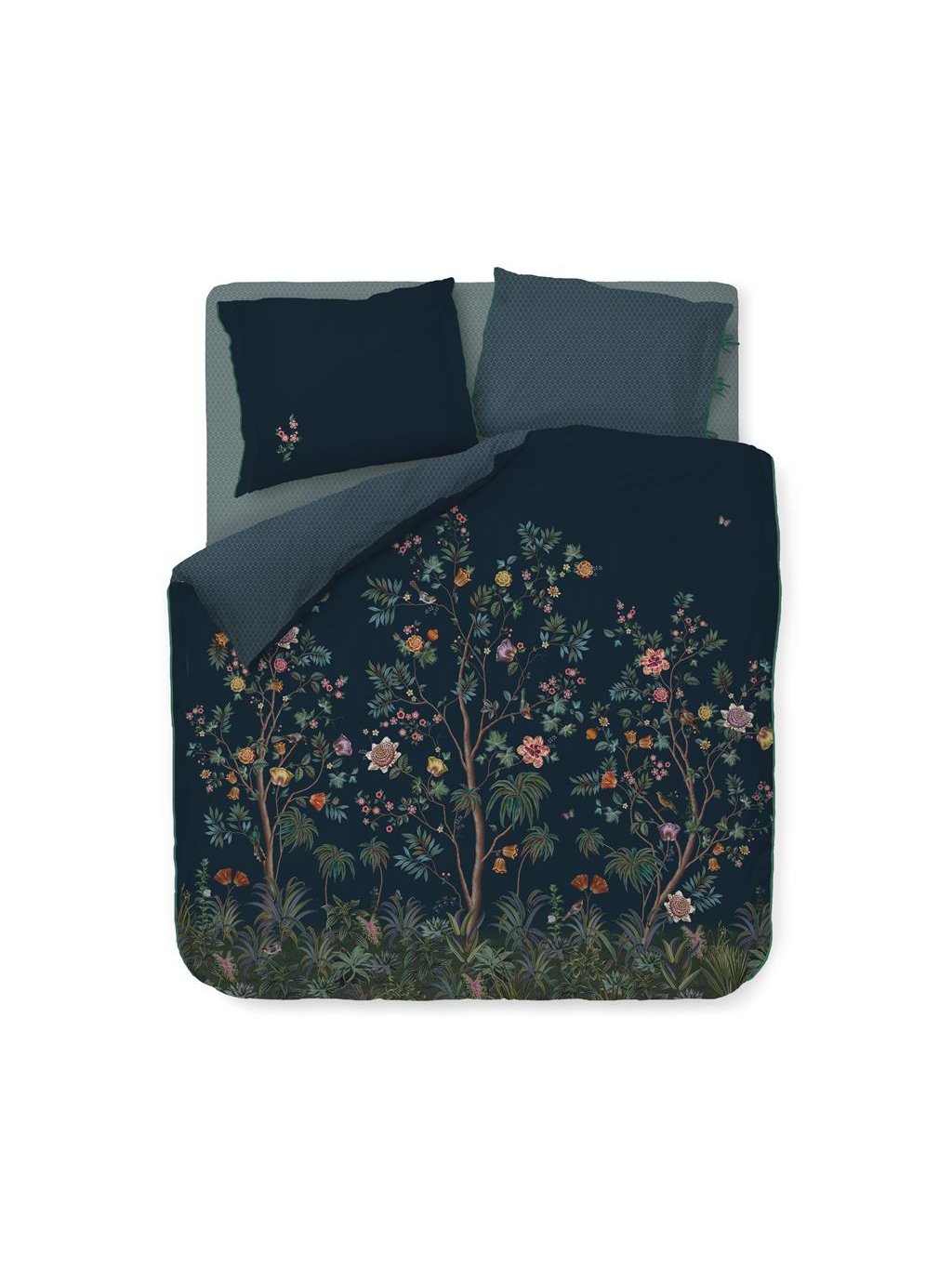 Povlečení Paradiso vyniká svým tlumeným odstínem tmavé modré a nádherným romantickým vzorem velkých květů a listů. Celý vzor je výrazný, ale nepůsobí rušivě, takže odpočinek a pohodlný spánek je zaručen. Polštář v rozměru 70 x 90 cm je méně zdobený, takže vhodně doplňuje výraznější peřinu. Má zdobný okraj, rovněž tak tkalouny na zavázaní polštáře. Výplň nevypadne díky důmyslné kapse, kam se výplň pohodlně umístí. Zadní strana polštáře i peřiny je tlumenější a umožní vám polštář obracet dle nálady.