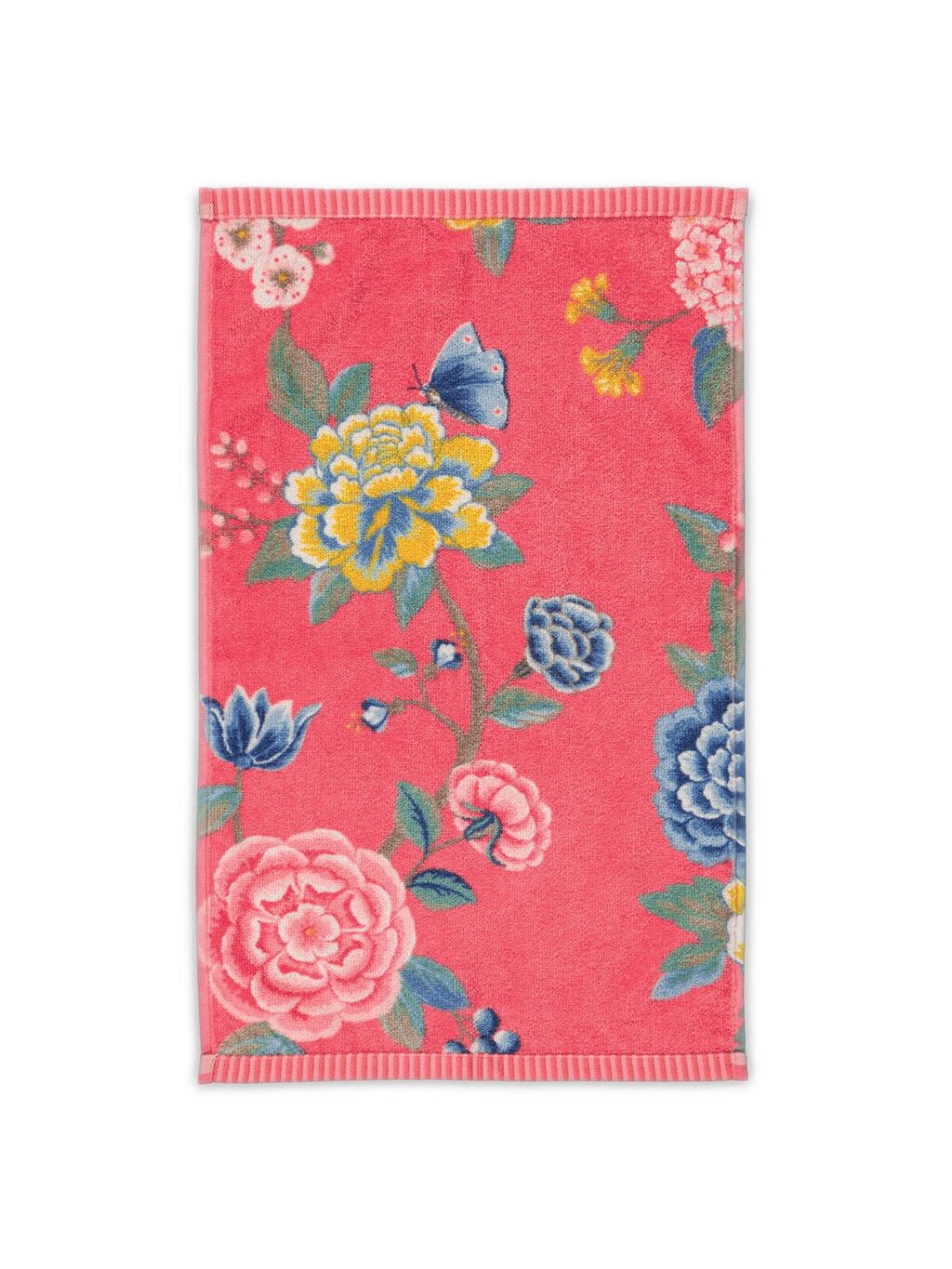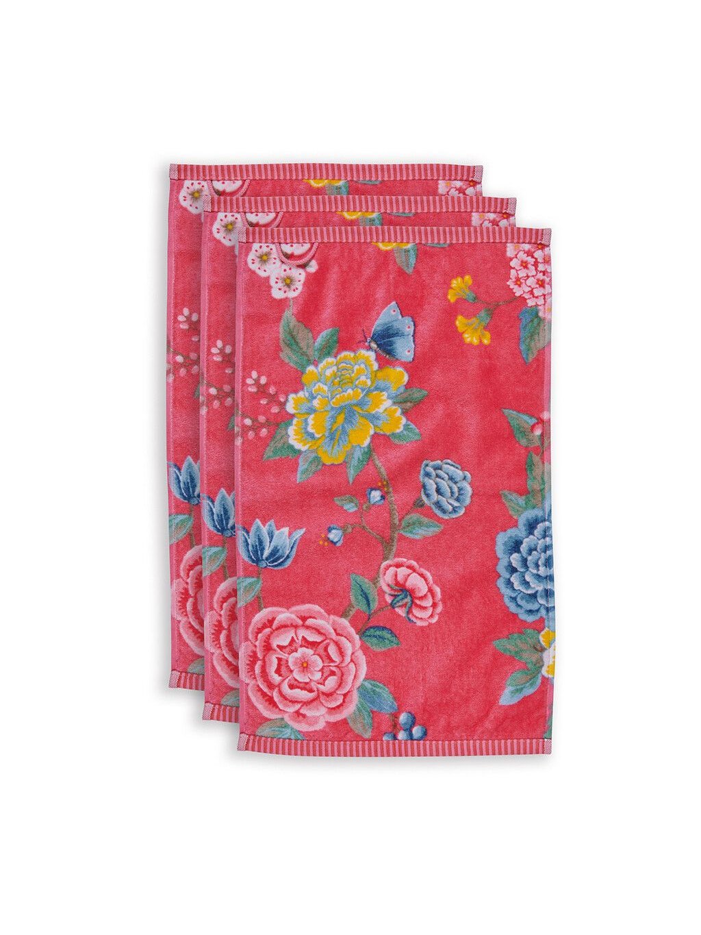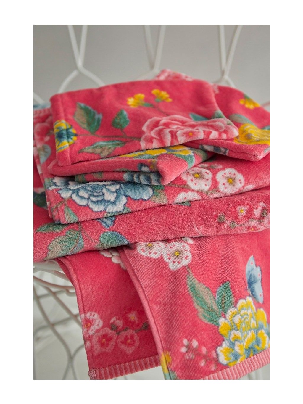 Ručníky s květinovým vzorem od Pip Studio korálové barvy, vyrobené ze 100% bavlněného froté vysoké kvality o gramáži 500g/m2.