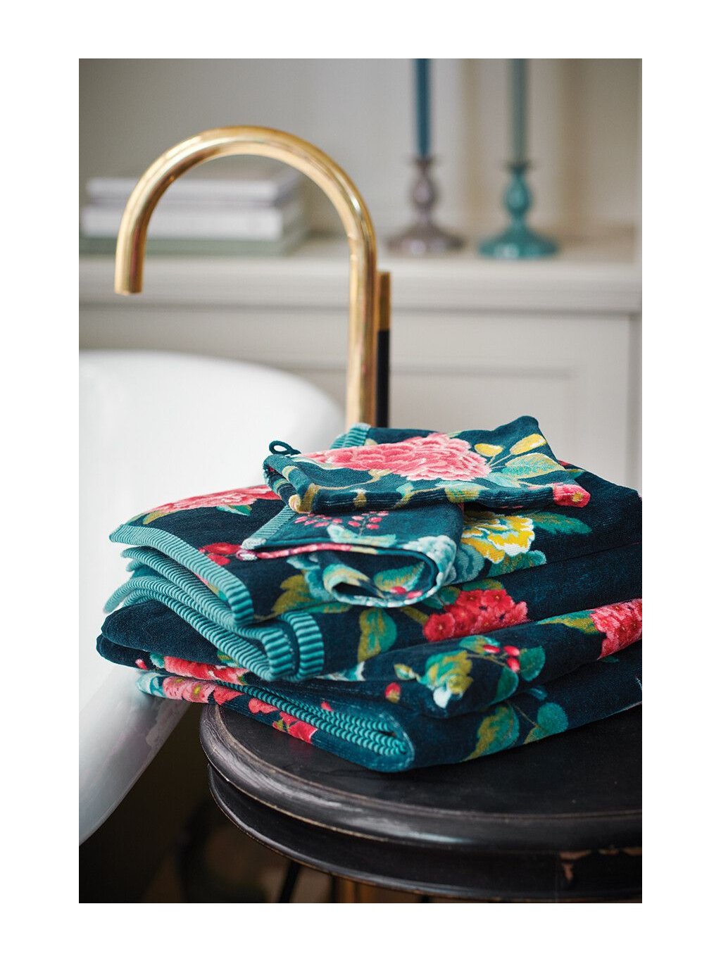 Ručníky s květinovým vzorem od Pip Studio tmavomodré barvy, vyrobené ze 100% bavlněného froté vysoké kvality o gramáži 500g/m2.