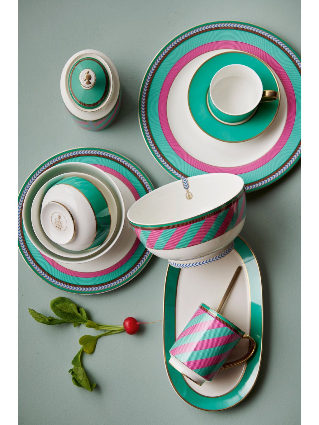 Pip Chique Stripes přináší kombinaci růžové a zelené se zlatým akcentem a nadčasové elegantní tvary jednotlivých prvků kolekce.