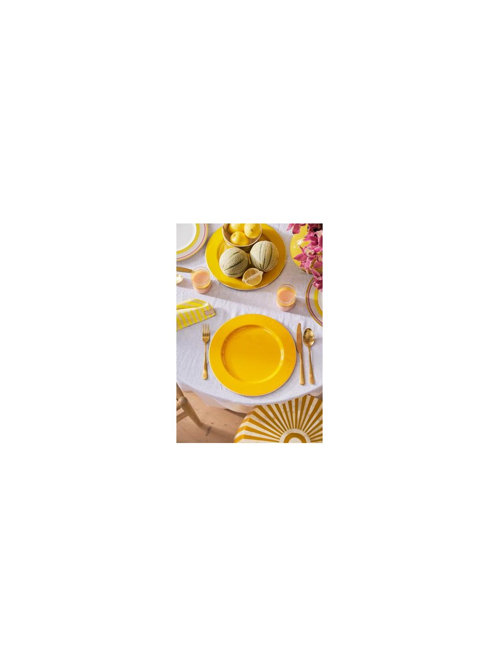 Lehký servírovací talíř lisovaný z tenkého plechu. Vrchní strana v barvě žluté, spodní strana v barvě zlaté. Talíř lze použít jako servírovací nebo prostírací. Svou plnou sytou barvou skvěle ladí ke kolekci.