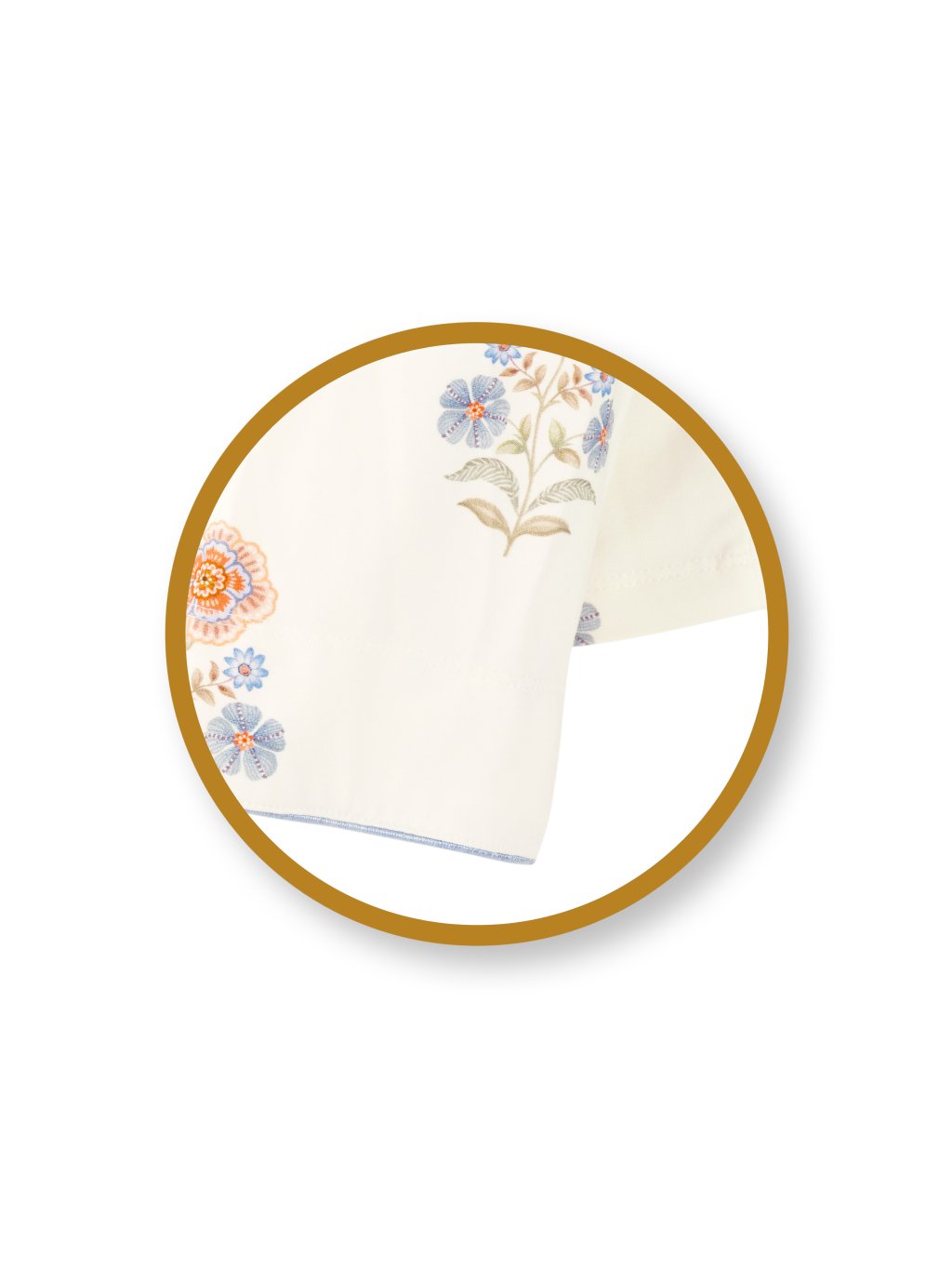 Dekor Tanaka zdobí opakující se vzor drobných větviček s fantazijními květy. Noste samostatně nebo s ladícími kalhotami či kimonem pro kompletní loungewear set. Na fotografiích: světlovlasá modelka 180 cm a tmavovlasá 172 cm, obě velikost M.
