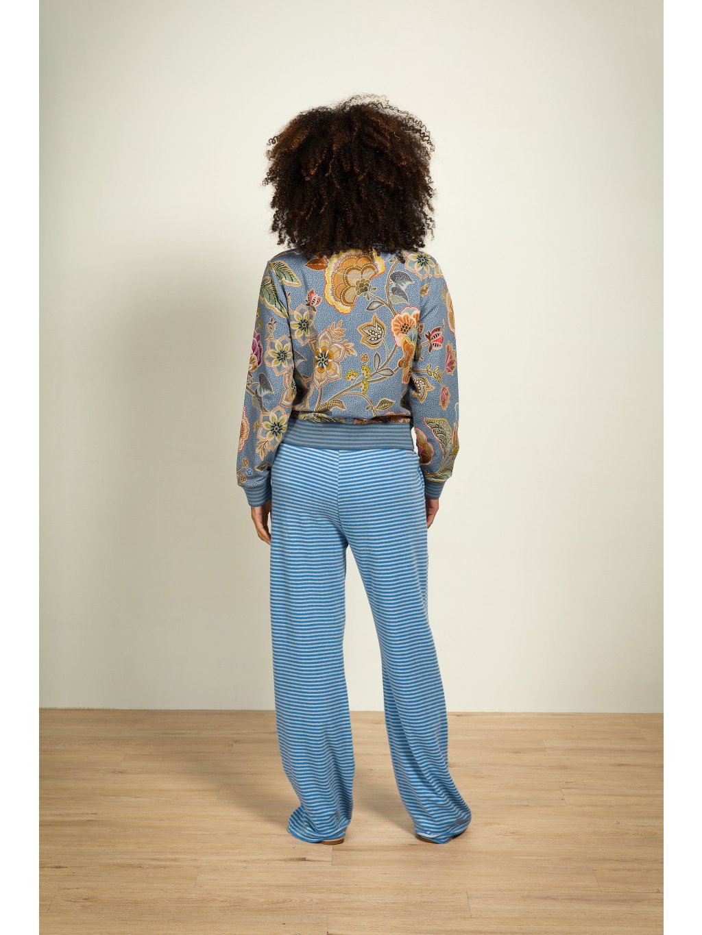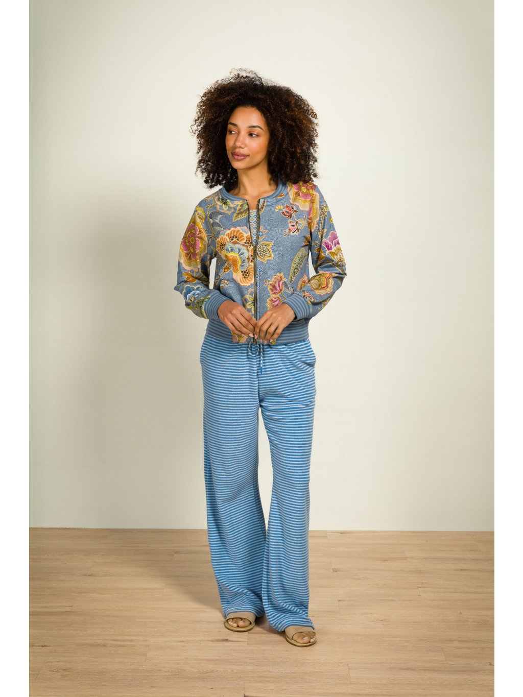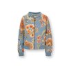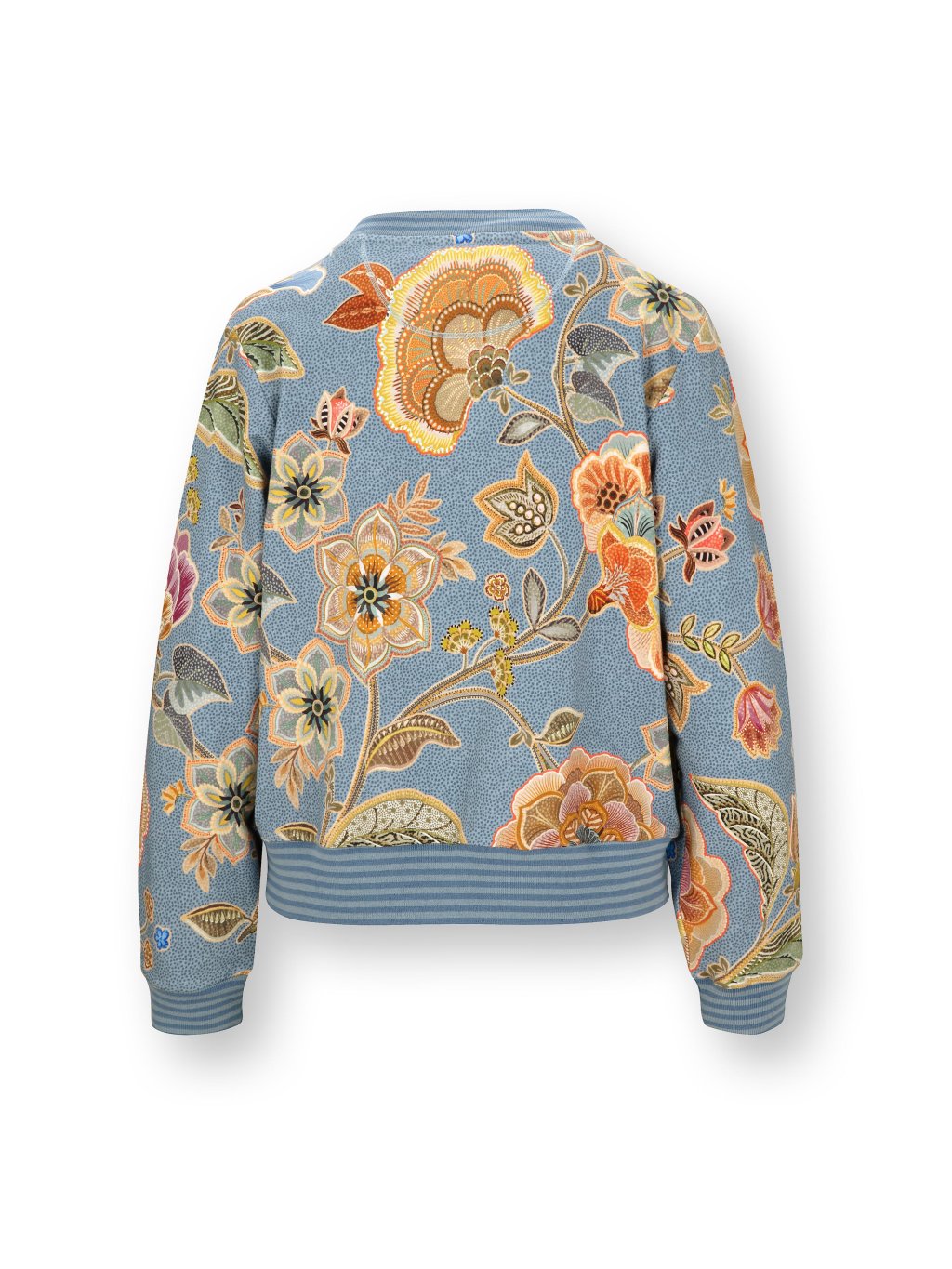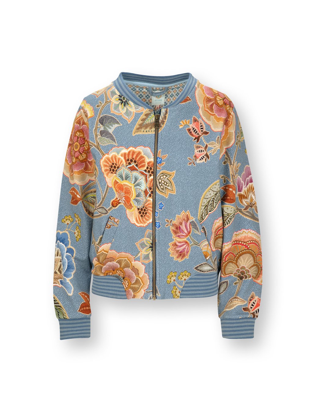 Bunda na zip v modrém odstínu zdobená bohatým květinovým motivem. Dlouhý rukáv. U krku, v pase a na rukávech je ozdobný pružný náplet. Složení: 95% bavlna, 5% elastan. Prát porubu na 30´C.