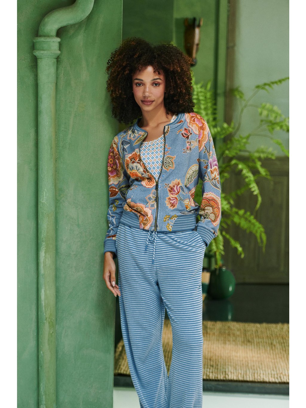 Bunda je díky svému složení velmi pohodlná a módních barvách. Je v trendy modrém odstínu a zdobená bohatými africkými motivy. Květiny jsou zdobeny tečkovanými okraji, pruhy a dalšími hravými detaily. Podklad má jemný tečkovaný vzor. Má dlouhý rukáv. U krku, v pase a na rukávech je ozdobný pružný náplet. Ideálně se hodí k volnočasovým kalhotám s pružným pasem z naší nabídky či kraťasům ze stejné kolekce Matata.