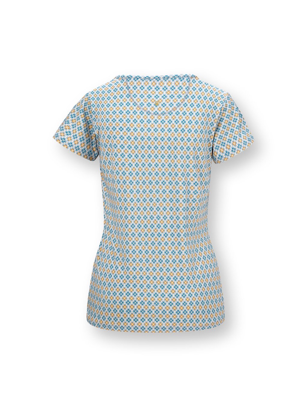 Toto tričko z kolekce Mojo je ideální základní kousek pro vrstvení. Má kulatý výstřih a krátké rukávy, což ho činí perfektním pro vytváření různých ležérních stylů. Design Mojo je jemný a živý geometrický vzor složený z drobných kvítků ve dvou barvách. Tvoří vhodný kontrast k dominantním florálním motivům.