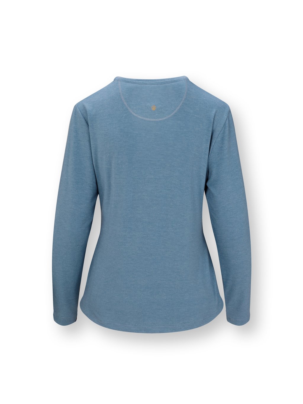Top s dlouhým rukávem. Výstřih není hluboký. Krásná modrá melanž barva se výborně kombinuje s aktuální kolekcí. Látka je hebounká a díky elastanu látka jemně pruží. Nabízíme v různých velikostech a barvách. Vytvořte si jedinečnou kombinaci s kimonem a dlouhými kalhotami z aktuální kolekce.