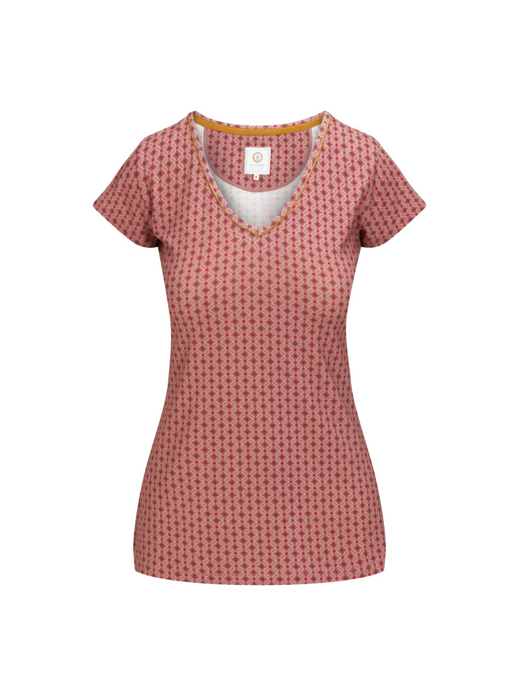Top s krátkým rukávem. Ideální pro kombinaci s dlouhými či krátkými kalhotami z naší nabídky. Dominantní odstíny tlumené růžové barvy vytváří zajímavé pravidelné obrazce, barvy jsou spíše tlumenější, takže i ta z vás, kdo si v růžové zrovna nelibuje, si přijde na své. Výstřih do V má jemné zlaté zdobení. Látka je velmi jemná a tenká, splývavá, má chladivý efekt, ideální na teplejší dny. Nabízíme v různých velikostech i dalších barvách.