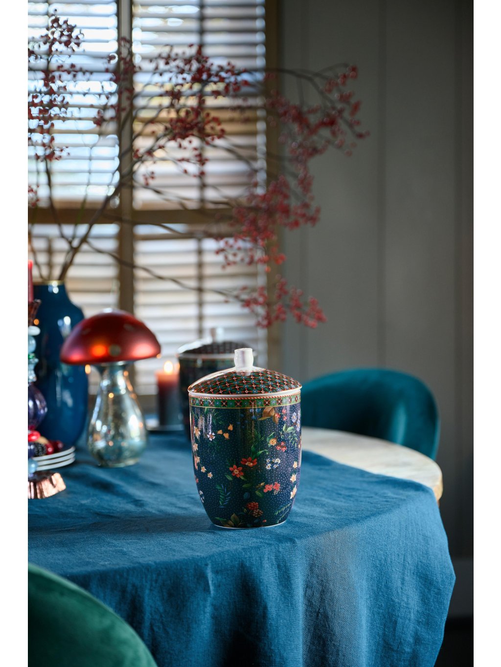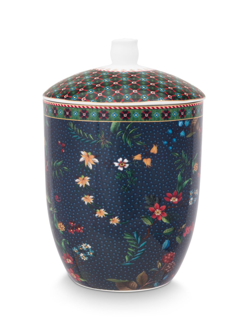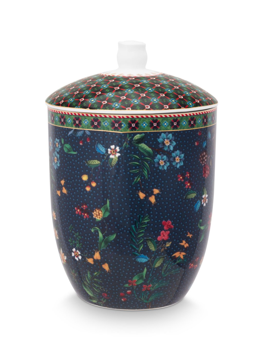 Dóza Berry Blues o objemu 1,5 litru je zdobená po obvodu elegantním vzorem barevných květin a lesních plodů na modrém podkladu. Víčko přesně dosedá a těsní. Vhodné na sypké potraviny, sušenky, bonbóny nebo jako dekorace. Projděte si celou kolekci, která vybízí k vytváření osobitých kombinací harmonických vzorů. Skvěle se kombinuje s oblíbenou kolekcí Flower Festival. Dózy jsou v nabídce také v jiných dekorech a barvách.
