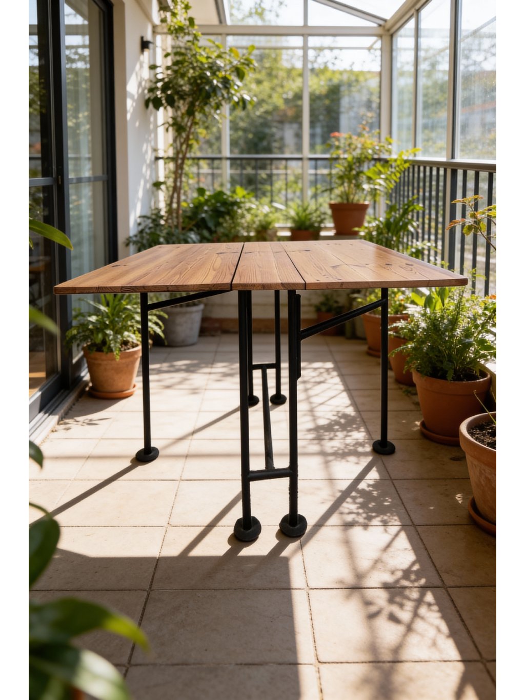 Industriální skládací stolek s masivní borovicovou deskou a pevnou kovovou konstrukcí. Praktický, stabilní a snadno skladný – ideální do moderního interiéru, loftu i na balkon či do zimní zahrady.