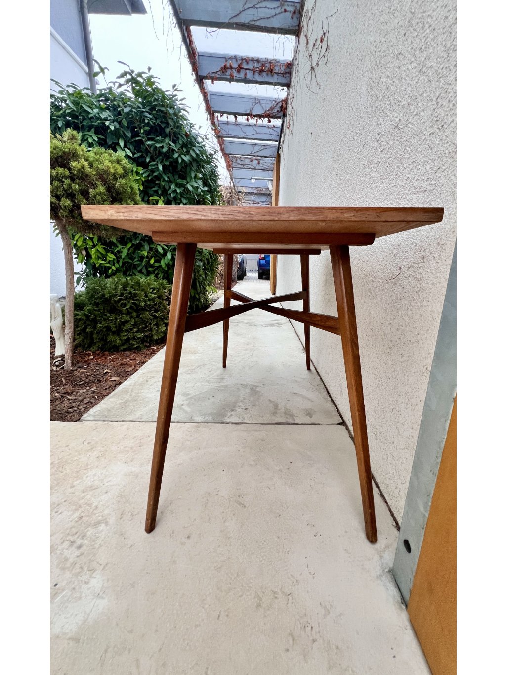 Konferenční stolek obdélníkový v odstínu mořený dub s velmi hezkou kresbou byl vyroben v závodě Dřevopodnik Holešov v 70. letech jako společenský stůl, Velmi hezký detail podnoží do kříže - estetický i zpevňující prvek - stolek je konstrukčně stabilní a pevný. Velmi hezká kresba a odstín dřeva bez poškození. Zespoda na desce je zbytek původního štítku (viz poslední foto).