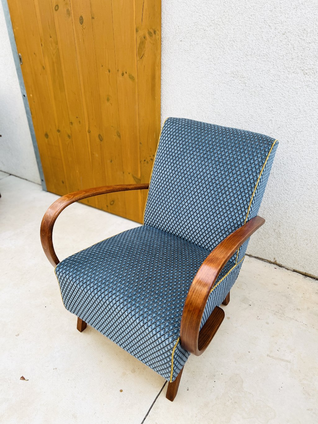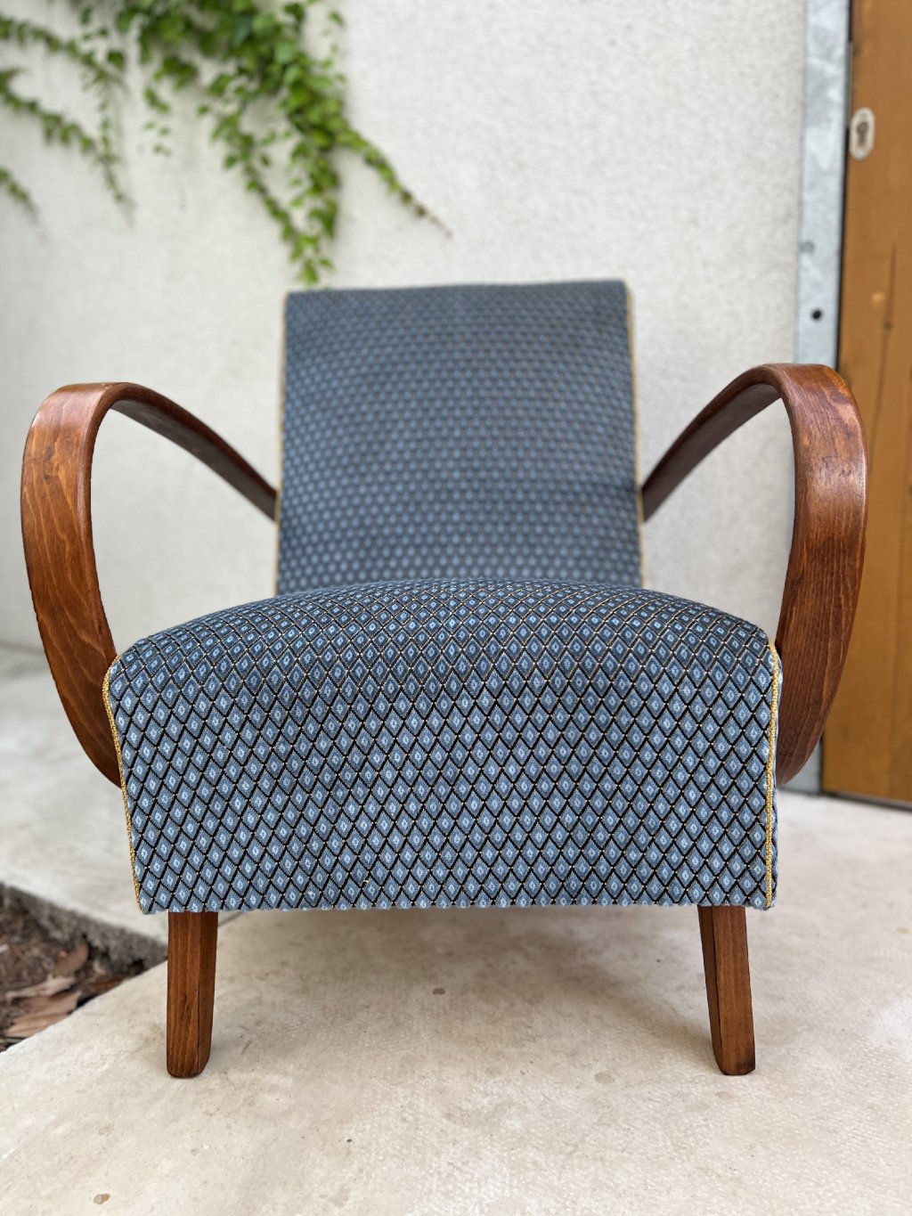 Ikonická křesla z období Art Deco/Funkcionalismus (kolem roku 1940) po kompletní profesionální renovaci. Bukový masiv, nové čalounění v kvalitní modro-zlaté látce, precizní kedrování. Stylový a vzácný doplněk interiéru.