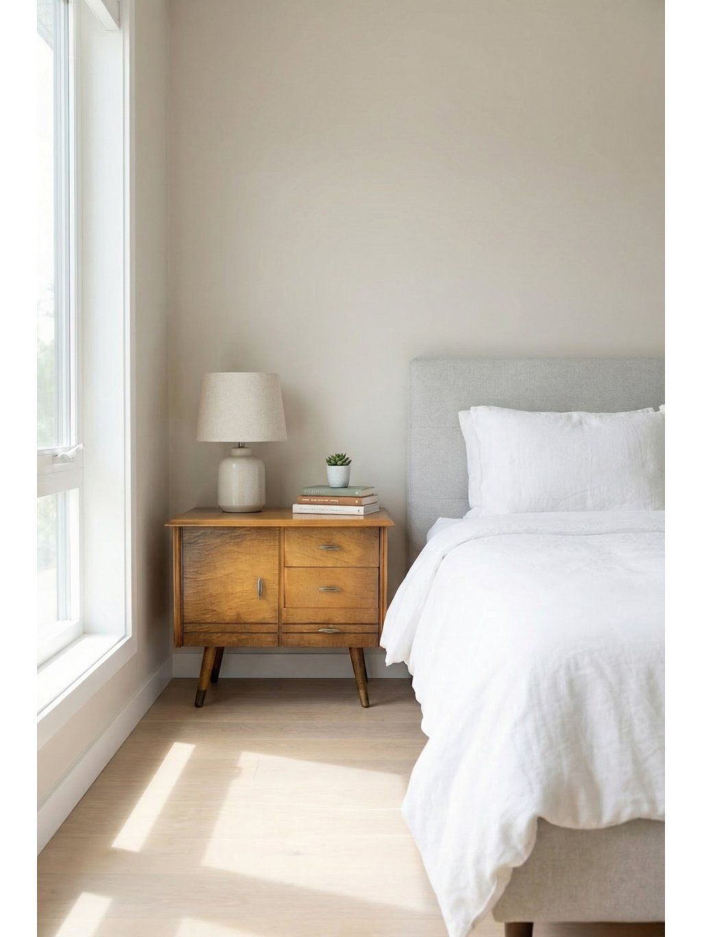 Originální vintage noční stolek ve stylu Brusel z 60. let, vyrobený z masivního dřeva s kvalitní dýhou v odstínu jasan ve vysokém lesku. Tento elegantní kus je typickým představitelem mid century nábytku, který vyniká čistými liniemi, subtilními kónickými nožkami a nadčasovým designem.
