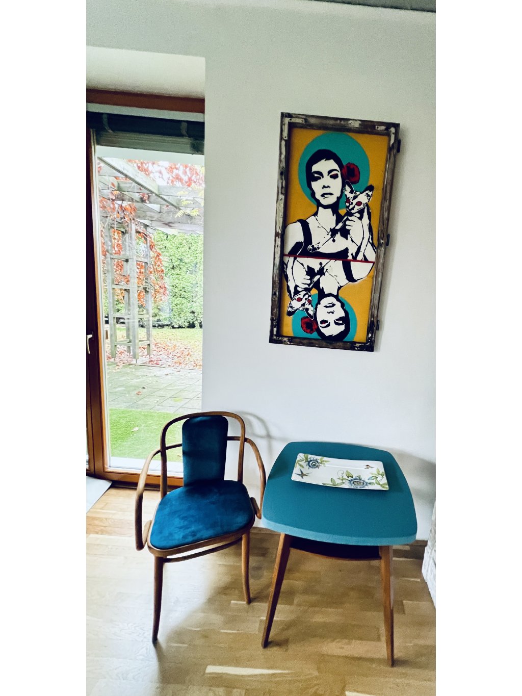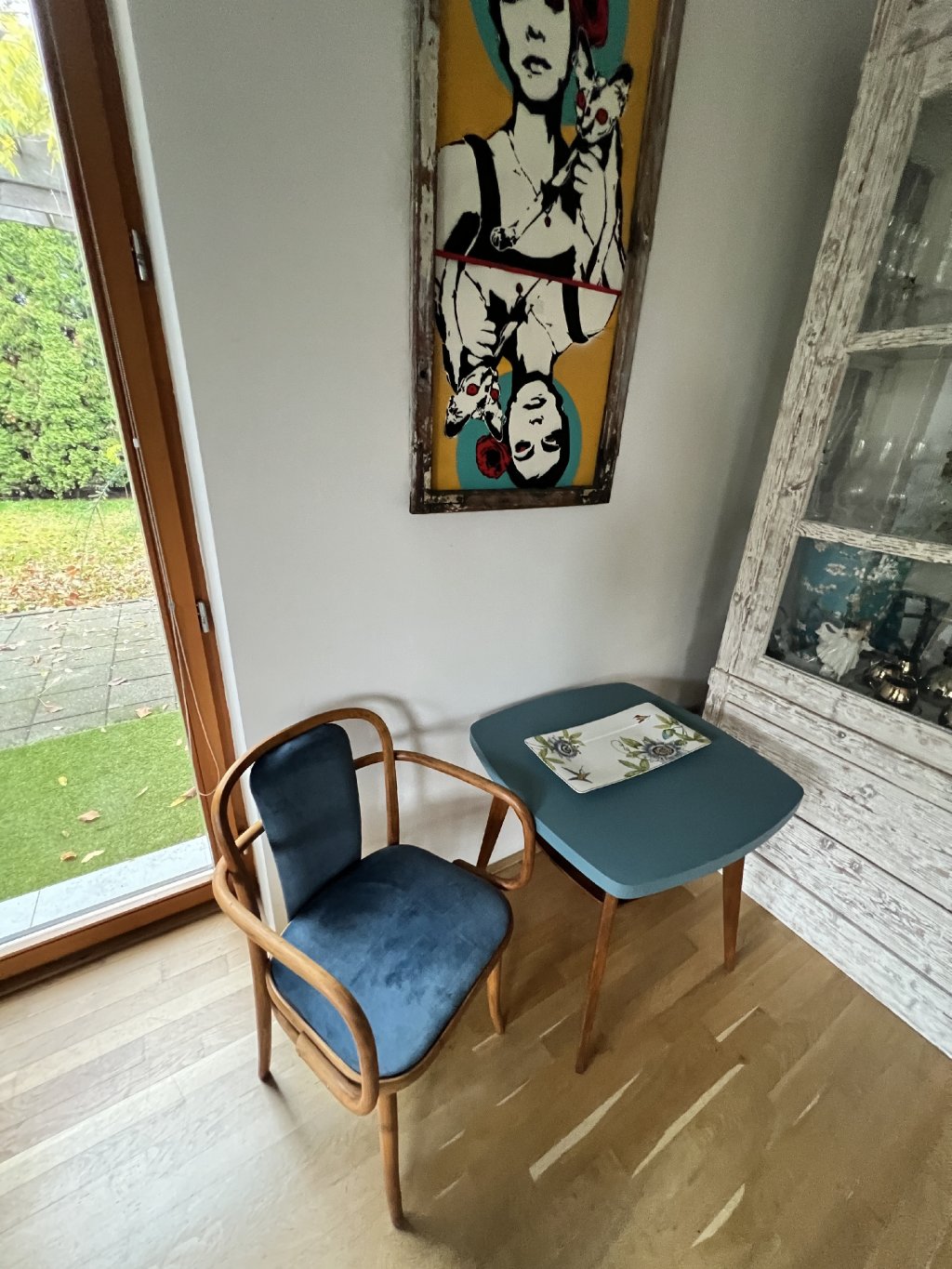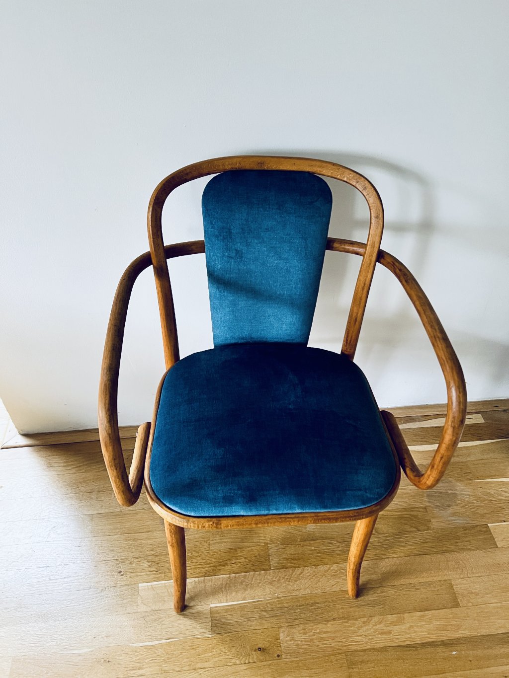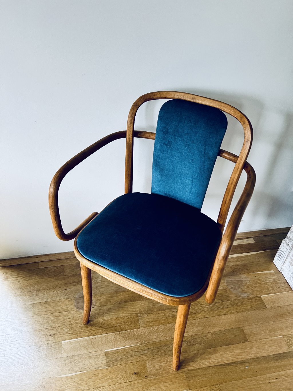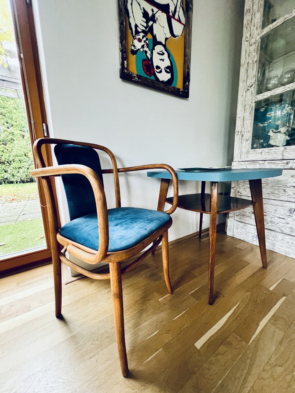 Křeslo prošlo kompletní renovací – dřevěná ohýbaná konstrukce byla ošetřena a doplněna novým, profesionálně očalouněným sedákem a opěrkou. Použitá kvalitní látka s vysokým stupněm odolnosti Martindale zajišťuje dlouhou životnost a odolnost vůči opotřebení. Trendy petrolejový odstín dodává křeslu moderní nádech, aniž by byl narušen jeho historický charakter.